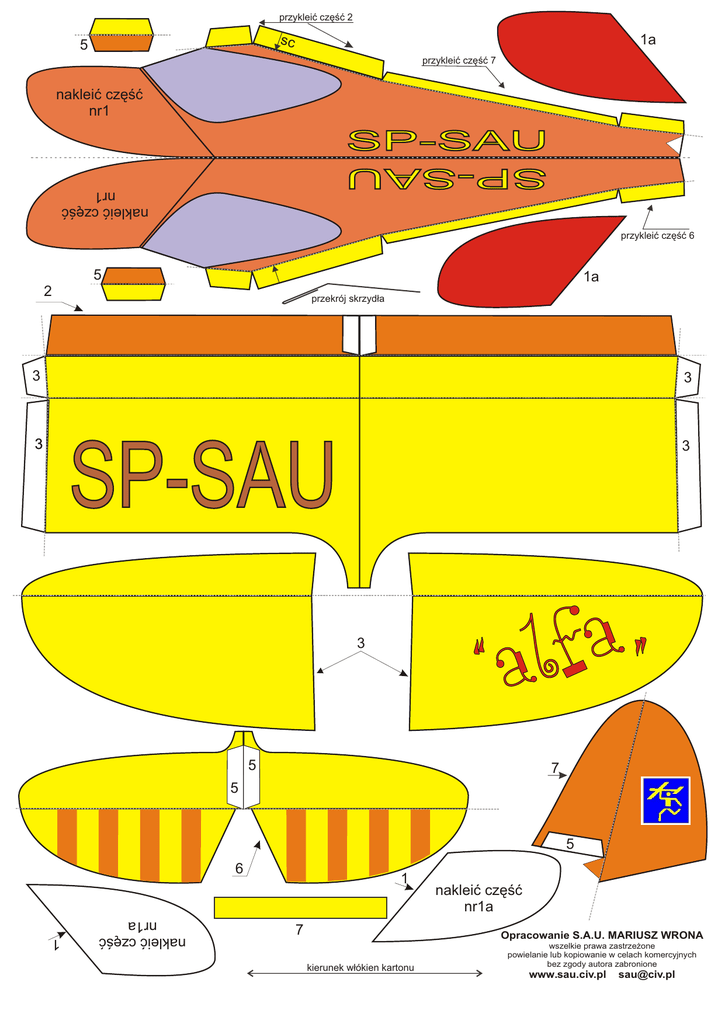 przykleić część 2 sc 5 1a przykleić część 7 nakleić część nr1 SP-SAU nakleić część nr1 przykleić część 6 5 1a 2 przekrój skrzydła 3 3 3 3 SP-SAU 3 5 7 5 5 6 1 7 nakleić część nr1a Opracowanie S.A.U. MARIUSZ WRONA kierunek włókien kartonu wszelkie prawa zastrzeżone powielanie lub kopiowanie w celach komercyjnych bez zgody autora zabronione www.sau.civ.pl [email protected] nakleić część nr1a 1 Swobodnie latający model z kartonu “Alfa” Opis modelu Model przeznaczony jest dla najmłodszych modelarzy , zalecany do budowy jako pierwszy model latający. Do wykonania modelu będziemy potrzebować następujących narzędzi i materiałów : - kartki z bloku technicznego formatu A4 - ostrych nożyczek - linijki 25cm - kleju (najlepszy jest klej polimerowy można też użyć wikolu lub kleju do papieru) - kostki introligatorskiej lub nie piszącego wkładu do długopisu - kawałka plasteliny (do wyważenia modelu) - cellonu lub bezbarwnego lakieru nitro (niekoniecznie) - dostępu do drukarki Budowa szybowca Budowę modelu rozpoczynamy od wydrukowania na kartce z bloku technicznego części składowych modelu, . Na wydrukowanym rysunku należy zarysować przy pomocy kostki introligatorskiej lub zużytego wkładu od długopisu miejsca zaznaczone szarą przerywaną linią, ułatwi nam to późniejsze zaginanie kartonu. Następnie wycinamy ostrymi nożyczkami elementy modelu. Sklejanie modelu zaczynamy od kadłuba, wycięty kadłub składamy w połowie a następnie odginamy żółte zakładki na zewnątrz. Środek smarujemy klejem i dociskamy. Z przodu kadłuba po obu stronach przyklejamy części nr1, a na nie części nr 1a. Na końcu kadłuba przyklejamy statecznik poziomy (cz nr 6). Do statecznika pionowego (cz nr 8) przyklejamy po obu stronach kątowniki wzmacniające (czci nr 5) i całość naklejamy na statecznik poziomy. Po wykonaniu kadłuba przystępujemy do montażu skrzydeł (części nr3 i 4). Przednią (pomarańczową )część centropłata podginamy pod spód i przyklejamy , formujemy profil skrzydła zaginając lekko grzbiet skrzydeł i przyklejamy uszy. Wznios uszu powinien wynosi po 35mm. Przyklejamy skrzydła do kadłuba. Pomiędzy skrzydłami i statecznikiem poziomym naklejamy od góry pasek wzmacniający (cz7). Tak wykonany model możemy pomalować rzadkim cellonem lub bezbarwnym lakierem nitro, zabieg ten zabezpieczy model przed wpływem wilgoci (tusz do drukarek rozpuszcza się w wodzie) i dodatkowo usztywni konstrukcję. Następnie podpieramy model w miejscu zaznaczonym na kadłubie pod skrzydłami (sc) i wyważamy przy pomocy plasteliny.