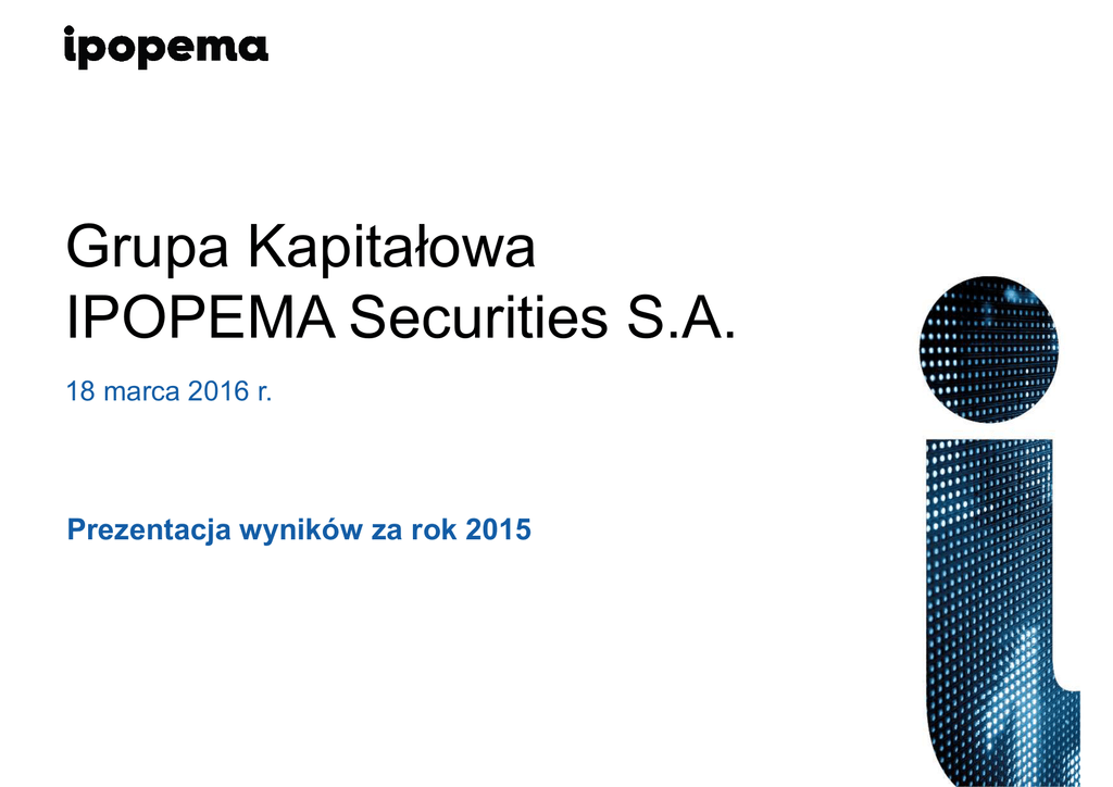 Grupa Kapitałowa IPOPEMA Securities S.A. 18 marca 2016 r. Prezentacja wyników za rok 2015 Działalność maklerska Obroty na GPW i udział IPOPEMA 2013-2015 60 Obroty GPW (w mld zł) Obroty na BSE i udział IPOPEMA 2013-2015 12% Udział IPOPEMA 50 800 Obroty BSE (mld HUF) Udział IPOPEMA 10% 8% 600 40 8% 30 6% 20 4% 10 2% 0 0% 10% 6% 400 4% 200 2% 0% sty-13 lut-13 mar-13 kwi-13 maj-13 cze-13 lip-13 sie-13 wrz-13 paź-13 lis-13 gru-13 sty-14 lut-14 mar-14 kwi-14 maj-14 cze-14 lip-14 sie-14 wrz-14 paź-14 lis-14 gru-14 sty-15 lut-15 mar-15 kwi-15 maj-15 cze-15 lip-15 sie-15 wrz-15 paź-15 lis-15 gru-15 sty-13 lut-13 mar-13 kwi-13 maj-13 cze-13 lip-13 sie-13 wrz-13 paź-13 lis-13 gru-13 sty-14 lut-14 mar-14 kwi-14 maj-14 cze-14 lip-14 sie-14 wrz-14 paź-14 lis-14 gru-14 sty-15 lut-15 mar-15 kwi-15 maj-15 cze-15 lip-15 sie-15 wrz-15 paź-15 lis-15 gru-15 0 Wybrane nagrody w 2015 Struktura udziałów rynkowych na GPW i BSE (2015) DM BH 10,57% DM PKO BP 7,97% Pozostali 36,27% Wood&Co 7,12% Raiffeisen MT Bank Pozostali 1,66% 0,84% 1,88% Random CIB RCB 2,42% Capital 1,84%1,48% 2,19% DB Securities 2,87% Parkiet – ranking analityków Concorde 22,08% UniCredit 3,45% Solar 3,53% OTP 4,69% Merrill Lynch 6,80% DM BOŚ 3,89% Credit Suisse DI BRE 3,98% 5,38% DB 6,38% DM BZ-WBK 5,87% 5,78% Wood&Co 16,35% Equilor 9,59% KBC 10,17% #1 Analityk Roku (Wojciech Kozłowski) #1 chemia (Wojciech Kozłowski) #1 spółki paliwowe (Wojciech Kozłowski) #1 banki (Iza Rokicka) #2 finanse (bez banków) (Iza Rokicka) #3 energetyka (Sandra Piczak) #3 analiza techniczna (Paweł Wiśniewski) Erste 14,95% | 2 Bankowość inwestycyjna Transakcje zrealizowane w 2015 r. Przychody z usług bankowości inwestycyjnej 18 565 17 052 16 347 14 481 13 006 2 378 2006 13 781 12 196 11 735 IPOPEMA Securities była najaktywniejszym brokerem na rynku ofert publicznych – uczestniczyła w 4 transakcjach IPO (Braster, AAT Holding, InPost i Enter Air) i jednej SPO (GTC). IPOPEMA była także najaktywniejszym pośrednikiem w obsłudze wezwań realizując 5 transakcji (ok. 40% udziału w rynku pod względem wartości realizowanych wezwań). 2 206 2007 2008 W obszarze bankowości inwestycyjnej rok 2015 był rokiem rekordowym – Departament Rynków Kapitałowych zanotował największe przychody w swojej historii. 2009 2010 2011 2012 2013 2014 2015 Źródło: Spółka | 3 Fundusze inwestycyjne i zarządzanie aktywami Wybrane dane finansowe segmentu (TFI + AM) IPOPEMA TFI konsekwentnie zwiększa bazę aktywów funduszy oraz rozwija ofertę produktową dla klientów detalicznych. 2012 Wartość aktywów w zarządzaniu na koniec 2015 r. wynosiła 48,0 mld zł (19,8 mld zł rok wcześniej), w tym wartość aktywów funduszy aktywnie zarządzanych i asset management wynosiła 952,7 mln zł na koniec 2015 r. (wobec 2.387,1 mln zł rok wcześniej). Aktywa w zarządzaniu (w mld zł) W lipcu 2015 r. zakończone zostało zarządzanie ALIOR SFIO (a w połowie stycznia 2016 r. BGŻ SFIO). 2013 2014 2015 7,8 18,3 19,8 48,0 Przychody (w tys. zł) 28 378 35 825 42 054 38 525 Zysk netto (w tys. zł) 4 612* 3 054 3 919 1 907 Źródło: Spółka * wynik za 2012 r. uwzględniał utworzenie aktywa z tytułu odroczonego podatku od starty podatkowej w latach poprzednich Przy praktycznie niezmienionym poziomie kosztów działalności przełożyło się to na niższy zysk netto segmentu (1.907 tys. zł vs. 3.919 tys. zł). Struktura aktywów w funduszach aktywnie zarządzanych i asset management Udział rynkowy IPOPEMA TFI Noble 1,2% Legg Mason 1,1% Quercus 1,4% pozostali 7,3% Investors 1,5% KBC 1,5% 31-12-2014 19,0% Fundusze i asset management Altus 3,0% Copernicus 3,3% PZU 11,2% Union Investment 3,9% BZ WBK 5,0% PKO 7,3% Aviva 5,0% udział w aktywach Wartość (w mln zł) udział w aktywach wysoka Marża AgioFunds 2,1% Wartość (w mln zł) absolutnej stopy zwrotu 231,6 10% 176,5 19% akcyjne 74,2 3% 110,1 12% niska marża Millennium 1,5% Open Finance 1,6% 31-12-2015 gotówkowe 34,5 1% 135,4 14% 241,7 10% 196,7 21% asset management 1 805,1 76% 334,0 35% razem 2 387,1 dłużne 952,7 Pionieer 6,6% NN 5,3% Forum 5,5% Skarbiec 5,7% Źródło: Spółka na podstawie danych z IZFIA (wg stanu na koniec 12/2015) Źródło: Spółka | 4 Usługi doradcze Wyniki IPOPEMA Business Consulting Mniejsza liczba projektów doradczych zrealizowanych w 2015 r. w porównaniu rokiem 2014 wpłynęła na obniżenie przychodów IPOPEMA Business Consulting o 22,2%. Pomimo niższego poziomu kosztów działalności (o 14,3%) przełożyło się to na obniżenie zysku netto. 2012 2013 2014 2015 Przychody 13 728 13 147 15 501 12 065 Zysk netto 1 698 2 009 1 296 41 Źródło: Spółka | 5 Wyniki finansowe Grupy IPOPEMA w 2015 r. Rozbicie skonsolidowanych przychodów Grupy IPOPEMA* 57 683 45 148 51 335 34 861 28 715 37 799 64 530 Działalność brokerska 41 862 11 735 14 481 47 013 13 781 12 196 17 052 8 007 2 378 2006 13 006 17 499 Fundusze inwestycyjne 42 054 22 458 28 378 35 825 16 347 2 206 4 420 8 832 6 351 13 574 17 453 13 728 13 147 2007 2008 2009 2010 2011 2012 2013 Bankowość inwestycyjna 18 565 Usługi doradcze 38 525 15 501 12 065 2014 2015 Źródło: Spółka *bez uwzględnienia pozostałych przychodów IPOPEMA Securities Skonsolidowany rachunek wyników Grupy IPOPEMA w rozbiciu na segmenty działalności 2015 Informacje dotyczące segmentów działalności (w tys. zł) Usługi maklerskie i pokrewne Zarządzanie funduszami inwestycyjnymi i portfelami 2014 Usługi doradcze Zarządzanie Usługi maklerskie funduszami i pokrewne inwestycyjnymi i portfelami Razem Usługi doradcze Razem Przychody segmentu ogółem 47 425 38 525 12 065 98 015 46 627 42 054 15 501 Koszty segmentu ogółem 42 963 35 821 11 976 90 760 42 230 36 850 13 979 93 059 4 462 2 704 89 7 255 4 397 5 204 1 522 11 123 455 169 19 643 486 176 44 706 1 123 34 1 1 158 1 151 35 0 1 186 Zysk segmentu Przychodu z tytułu odsetek Koszty z tytułu odsetek 104 182 Pozostałe przychody / koszty finansowe netto 124 69 -2 191 160 250