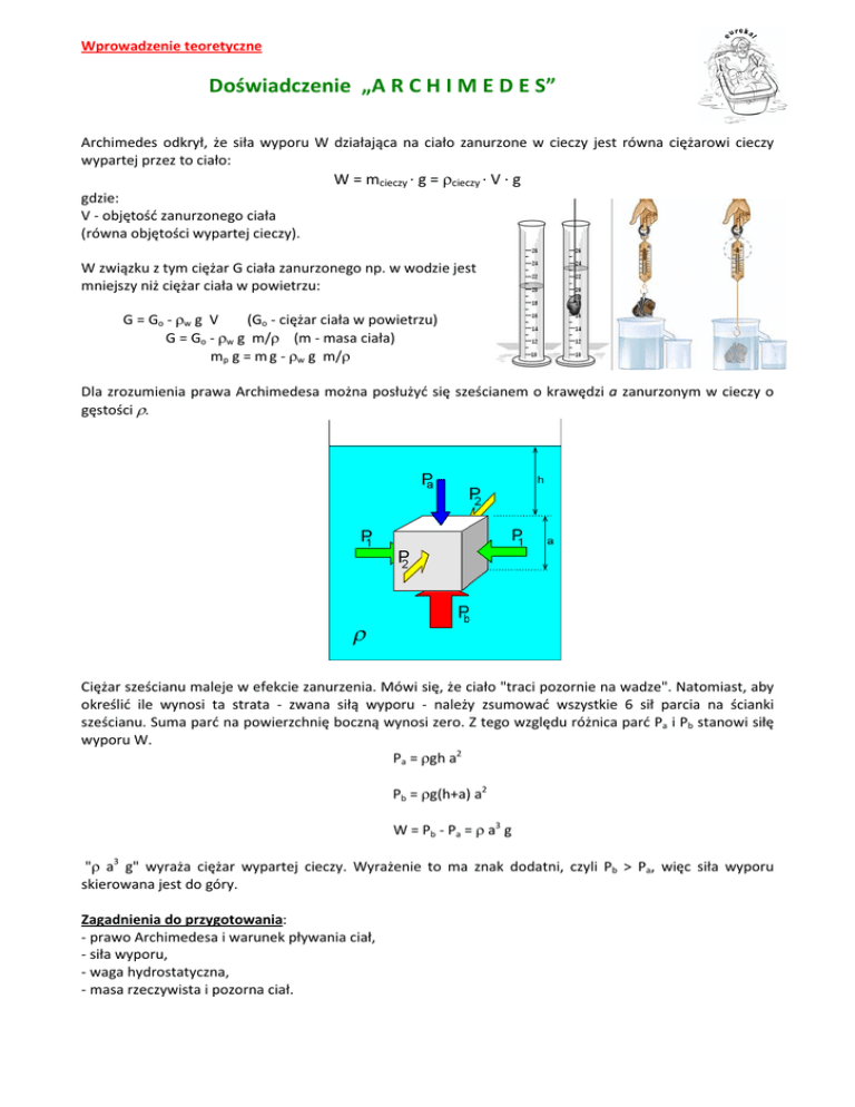 Wprowadzenie teoretyczne Doświadczenie „A R C H I M E D E S” Archimedes odkrył, że siła wyporu W działająca na ciało zanurzone w cieczy jest równa ciężarowi cieczy wypartej przez to ciało: W = mcieczy ∙ g = ρcieczy ∙ V ∙ g gdzie: V - objętość zanurzonego ciała (równa objętości wypartej cieczy). W związku z tym ciężar G ciała zanurzonego np. w wodzie jest mniejszy niż ciężar ciała w powietrzu: G = Go - ρw g V (Go - ciężar ciała w powietrzu) G = Go - ρw g m/ρ (m - masa ciała) mp g = m g - ρw g m/ρ Dla zrozumienia prawa Archimedesa można posłużyć się sześcianem o krawędzi a zanurzonym w cieczy o gęstości ρ. Ciężar sześcianu maleje w efekcie zanurzenia. Mówi się, że ciało "traci pozornie na wadze". Natomiast, aby określić ile wynosi ta strata - zwana siłą wyporu - należy zsumować wszystkie 6 sił parcia na ścianki sześcianu. Suma parć na powierzchnię boczną wynosi zero. Z tego względu różnica parć Pa i Pb stanowi siłę wyporu W. Pa = ρgh a2 Pb = ρg(h+a) a2 W = Pb - Pa = ρ a3 g "ρ a3 g" wyraża ciężar wypartej cieczy. Wyrażenie to ma znak dodatni, czyli Pb > Pa, więc siła wyporu skierowana jest do góry. Zagadnienia do przygotowania: - prawo Archimedesa i warunek pływania ciał, - siła wyporu, - waga hydrostatyczna, - masa rzeczywista i pozorna ciał. Szablon metodyczny „A R C H I M E D E S” Student 1: Wyznaczanie gęstości ciała stałego. Student 2: Sprawdzanie prawa Archimedesa. Baza teoretyczna Masa pozorna ciała zanurzonego w wodzie jest wprost proporcjonalna do masy rzeczywistej ciała: m p = m (1 − ρw ρ ) Dokonując pomiarów masy pozornej dla różnych wielkości masy rzeczywistej tego samego ciała możemy wyznaczyć jego gęstość. Doświadczenie można przeprowadzić na wadze hydrostatycznej, elektronicznej bądź za pomocą dynamometru. Zatem, aby wyznaczyć gęstość ciała stałego należy: Zatem, aby sprawdzić prawo Archimedesa należy: - wykonać pomiary zależności masy pozornej od masy rzeczywistej ciała stałego, - sporządzić wykres zależności - wykonać pomiary zależności masy pozornej od masy rzeczywistej ciała stałego, - sporządzić wykres zależności m p od m - odczytać wartość gęstości i porównać ją z wartością tablicową dla danego ciała. m p od m - zanalizować jego liniowość. Wskazówki do sprawozdania – wyznaczanie „A R C H I M E D E S” Student 1: Wyznaczanie gęstości ciała stałego. I. Metodyka (ideowy plan ćwiczenia) II. Przebieg ćwiczenia II.1. Przebieg czynności II.2. Szkic układu pomiarowego III. Wyniki III.1. Wyniki pomiarów 1 m mp ∆m = ... 2 3 4 5 6 [g] [g] III.2. Obliczenia (przykładowe – odnoszą się np. do pomiaru nr 3) Opracowanie nie posiada obliczeń przykładowych III.3. Wyniki obliczeń δρ = ρ dosw − ρtab ⋅ 100 % = ... ρ tab III.4. Wykres + obliczenie wyniku na wykresie (wszystko ołówkiem!) IV. Podsumowanie Wyznaczona wartość … wynosi ... Dokładność metody: ... Odchylenie od wartości tablicowej: … Dodatkowe wnioski, spostrzeżenia, przyczyny niepewności pomiarowych. 7 8 9 10 Wskazówki do sprawozdania – sprawdzanie „A R C H I M E D E S” Student 2: Sprawdzanie prawa Archimedesa. I. Metodyka (ideowy plan ćwiczenia) II. Przebieg ćwiczenia II.1. Przebieg czynności II.2. Szkic układu pomiarowego III. Wyniki III.1. Wyniki pomiarów 1 m mp ∆m = ... 2 3 4 5 6 7 8 9 10 [g] [g] III.2. Obliczenia (przykładowe – odnoszą się np. do pomiaru nr 3) Opracowanie nie posiada obliczeń przykładowych. III.3. Wyniki obliczeń Opracowanie nie posiada wyników obliczeń. III.4. Wykres IV. Podsumowanie Ponieważ na wykresie … można poprowadzić prostą przechodzącą przez wszystkie prostokąty niepewności pomiarowych, nie ma podstaw do stwierdzenia odstępstwa od … Ewentualnie: Odstępstwo od liniowości w zakresie ... może wynikać z …. Dodatkowe wnioski, spostrzeżenia, przyczyny niepewności pomiarowych