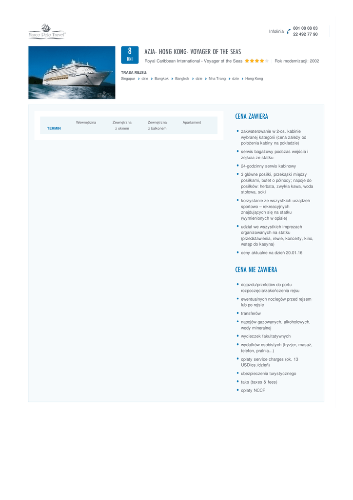 Infolinia 8 AZJA- HONG KONG- VOYAGER OF THE SEAS DNI Royal Caribbean International - Voyager of the Seas 801 08 08 03 22 492 77 90 | Rok modernizacji: 2002 TRASA REJSU: Singapur Wewnętrzna TERMIN dzie Bangkok Zewnętrzna Zewnętrzna z oknem z balkonem Bangkok dzie Apartament Nha Trang dzie Hong Kong CENA ZAWIERA zakwaterowanie w 2-os. kabinie wybranej kategorii (cena zależy od położenia kabiny na pokładzie) serwis bagażowy podczas wejścia i zejścia ze statku 24-godzinny serwis kabinowy 3 główne posiłki, przekąski między posiłkami, bufet o północy; napoje do posiłków: herbata, zwykła kawa, woda stołowa, soki korzystanie ze wszystkich urządzeń sportowo – rekreacyjnych znajdujących się na statku (wymienionych w opisie) udział we wszystkich imprezach organizowanych na statku (przedstawienia, rewie, koncerty, kino, wstęp do kasyna) ceny aktualne na dzień 20.01.16 CENA NIE ZAWIERA dojazdu/przelotów do portu rozpoczęcia/zakończenia rejsu ewentualnych noclegów przed rejsem lub po rejsie transferów napojów gazowanych, alkoholowych, wody mineralnej wycieczek fakultatywnych wydatków osobistych (fryzjer, masaż, telefon, pralnia...) opłaty service charges (ok. 13 USD/os./dzień) ubezpieczenia turystycznego taks (taxes & fees) opłaty NCCF