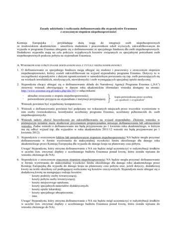 Zasady udzielania i rozliczania dofinansowania dla stypendystów Erasmusa z orzeczonym stopniem niepełnosprawności Komisja Europejska przykładając duŜą wagę do integracji osób niepełnosprawnych ze środowiskiem akademickim - umoŜliwia studentom i pracownikom szkół wyŜszych, zakwalifikowanym do wyjazdu w programie Erasmus ubieganie się o dofinansowanie ze specjalnego funduszu dla osób niepełnosprawnych. Dodatkowe stypendia mają na celu pokrycie wyjątkowych kosztów związanych ze specjalnymi potrzebami osób niepełnosprawnych podczas pobytu na stypendium Erasmusa. A. WNIOSKOWANIE O PRZYZNANIE DOFINANSOWANIA Z TYTUŁU NIEPEŁNOSPRAWNOŚCI 1. O dofinansowanie ze specjalnego funduszu mogą ubiegać się studenci i pracownicy z orzeczonym stopniem niepełnosprawności, którzy zostali zakwalifikowani na wyjazd stypendialny programu Erasmus. Dotyczy to w szczególności stypendystów z duŜymi ograniczeniami w samodzielnym poruszaniu się (np. osób poruszających się na wózkach inwalidzkich, niesłyszących, niewidomych) i osób wymagających specjalnej opieki medycznej. -- 2. Stypendysta chcący ubiegać się o dofinansowanie składa do Narodowej Agencji Programu Erasmus („NA”) stosowny wniosek obowiązujący w danym roku akademickim (formularz wniosku dostępny na stronie: http://www.erasmus.org.pl/index.php/ida/34/) z załącznikami: aktualne orzeczenie o stopniu niepełnosprawności; potwierdzenie przyjęcia na stypendium z instytucji przyjmującej. kopia potwierdzona przez uczelnię „za zgodność z oryginałem” Wniosek powinien być wypełniony komputerowo. 3. Wniosek o dofinansowanie powinien być podpisany we wskazanych miejscach przez wszystkie wymienione w nim osoby (wnioskodawca, koordynator uczelniany programu Erasmus, uczelniany pełnomocnik ds. osób niepełnosprawnych). 4. Wniosek naleŜy złoŜyć bezzwłocznie po zakwalifikowaniu na wyjazd stypendialny. ZłoŜenie wniosku w późniejszym terminie moŜe skutkować przyznaniem proporcjonalnie niŜszego dofinansowania lub odrzuceniem wniosku. śadne wnioski o dofinansowanie nie będą przyjmowane po 1 kwietnia roku akademickiego, w którym ma się odbyć wyjazd (np. dla wyjazdów w roku akademickim 2011/12 wnioski nie będą przyjmowane po 1 kwietnia 2012). 5. Stypendyście z orzeczonym lekkim lub umiarkowanym stopniem niepełnosprawności NA będzie mogła przyznać dofinansowanie w formie wyrównania do maksymalnej wysokości limitu określonego dla danego roku akademickiego przez Komisję Europejską dla wyjazdu do danego kraju na planowany czas pobytu. Uwaga! Stypendysta, który otrzyma dofinansowanie z NA nie będzie mógł uczestniczyć w redystrybucji środków w uczelni (tzn. otrzymać dopłaty z uczelnianego budŜetu Erasmusa ponad kwotę, która została wpisana do wniosku złoŜonego do NA). ------- 6. Stypendyście z orzeczonym znacznym stopniem niepełnosprawności NA będzie mogła przyznać dofinansowanie w formie wyrównania do maksymalnej wysokości limitu określonego dla danego roku akademickiego przez Komisję Europejską dla wyjazdu do danego kraju na planowany czas pobytu oraz, jeŜeli dotyczy, dodatkowej kwoty na ściśle określony cel podlegającej rozliczeniu wg kosztów rzeczywistych. Stypendysta moŜe ubiegać się o dodatkową kwotę na następujące rodzaje kosztów: koszty podróŜy osoby towarzyszącej; koszty pobytu osoby towarzyszącej; koszty miejscowego opiekuna; koszty specjalnych materiałów dydaktycznych; koszty opieki lekarskiej; koszty specjalnego ubezpieczenia; inne. Uwaga! Stypendysta, który otrzyma dofinansowanie z NA nie będzie mógł uczestniczyć w redystrybucji środków w uczelni (tzn. otrzymać dopłaty z uczelnianego budŜetu Erasmusa ponad kwotę, która została wpisana do wniosku złoŜonego do NA). Program Erasmus - Zasady udzielania i rozliczania dofinansowania dla stypendystów Erasmusa z orzeczonym stopniem niepełnosprawności 7. NA moŜe nie przyznać dodatkowego dofinansowania, jeŜeli z wniosku złoŜonego przez stypendystę wynika, Ŝe uczelnia nie przyznała stypendyście stypendium z budŜetu Erasmusa (tzw. wyjazd z grantem zerowym). 8. Czas pobytu na stypendium jest określany: dla studentów z dokładnością do 0,5 miesiąca (lub 0,25 jeŜeli uczelnia podjęła taką decyzję w odniesieniu do wszystkich stypendystów z danego roku akademickiego); dla pracowników: z dokładnością do 1 dnia. Do rozliczenia czasu pobytu studentów na stypendium stosuje się następujący schemat: --- uczelnie rozliczające studentów z dokładnością do 0,5 miesiąca: od 1 do 7 dni ponad pełny miesiąc wyliczany jest jako 0 miesiąca; od 8 do 24 dni ponad pełny miesiąc wyliczany jest jako 0,5 miesiąca; od 25 do 31 dni ponad pełny miesiąc wyliczany jest jako 1 pełny miesiąc. b. uczelnie rozliczające stypendystów z dokładnością do 0,25 miesiąca: od 1 do 3 dni ponad pełny miesiąc wyliczany jest jako 0 miesiąca; od 4 do 10 dni ponad pełny miesiąc wyliczany jest jako 0,25 miesiąca; od 11 do 17 dni ponad pełny miesiąc wyliczany jest jako 0,5 miesiąca; od 18 do 24 dni ponad pełny miesiąc wyliczany jest jako 0,75 miesiąca; od 25 do 31 dni ponad pełny miesiąc wyliczany jest jako 1 pełny miesiąc. ----- a. „Jeden miesiąc” to miesiąc kalendarzowy, liczony od danego dnia rozpoczęcia do dnia poprzedzającego ten dzień w następnym miesiącu, np. data początkowa to 17 sierpnia, zatem jeden pełny miesiąc kończy się 16 września, pozostałe dni, które nie zaliczają się do pełnego miesiąca zostaną wyliczone z dokładnością do 0,5 lub 0,25 miesiąca zgodnie z powyŜszym wykazem. Np. data początkowa to 17 sierpnia, data końcowa to 2 grudnia, zatem czas pobytu rozlicza się jako 3 miesiące i 16 dni, co daje „3,5 miesiąca”. 9. Decyzja o wysokości przyznanego dofinansowania jest podejmowana dla kaŜdego stypendysty indywidualnie z uwzględnieniem wszystkich informacji zawartych we wniosku złoŜonym do NA. NA 