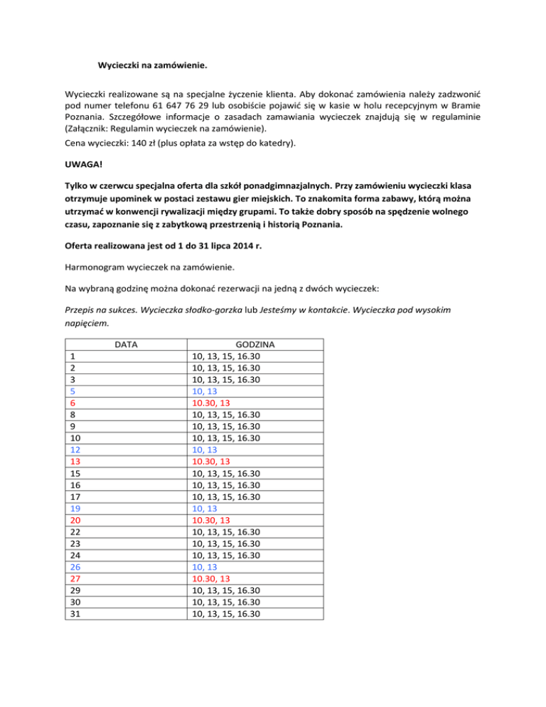 Wycieczki na zamówienie. Wycieczki realizowane są na specjalne życzenie klienta. Aby dokonać zamówienia należy zadzwonić pod numer telefonu 61 647 76 29 lub osobiście pojawić się w kasie w holu recepcyjnym w Bramie Poznania. Szczegółowe informacje o zasadach zamawiania wycieczek znajdują się w regulaminie (Załącznik: Regulamin wycieczek na zamówienie). Cena wycieczki: 140 zł (plus opłata za wstęp do katedry). UWAGA! Tylko w czerwcu specjalna oferta dla szkół ponadgimnazjalnych. Przy zamówieniu wycieczki klasa otrzymuje upominek w postaci zestawu gier miejskich. To znakomita forma zabawy, którą można utrzymać w konwencji rywalizacji między grupami. To także dobry sposób na spędzenie wolnego czasu, zapoznanie się z zabytkową przestrzenią i historią Poznania. Oferta realizowana jest od 1 do 31 lipca 2014 r. Harmonogram wycieczek na zamówienie. Na wybraną godzinę można dokonać rezerwacji na jedną z dwóch wycieczek: Przepis na sukces. Wycieczka słodko-gorzka lub Jesteśmy w kontakcie. Wycieczka pod wysokim napięciem. DATA 1 2 3 5 6 8 9 10 12 13 15 16 17 19 20 22 23 24 26 27 29 30 31 GODZINA 10, 13, 15, 16.30 10, 13, 15, 16.30 10, 13, 15, 16.30 10, 13 10.30, 13 10, 13, 15, 16.30 10, 13, 15, 16.30 10, 13, 15, 16.30 10, 13 10.30, 13 10, 13, 15, 16.30 10, 13, 15, 16.30 10, 13, 15, 16.30 10, 13 10.30, 13 10, 13, 15, 16.30 10, 13, 15, 16.30 10, 13, 15, 16.30 10, 13 10.30, 13 10, 13, 15, 16.30 10, 13, 15, 16.30 10, 13, 15, 16.30 Wycieczek nie realizujemy w dni: poniedziałki – Brama Poznania nieczynna piątki – adoracja Najświętszego Sakramentu w katedrze
