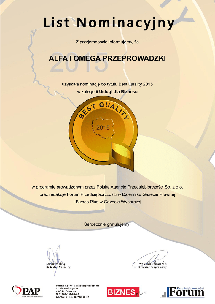 Z przyjemnością informujemy, że ALFA I OMEGA PRZEPROWADZKI uzyskała nominację do tytułu Best Quality 2015 w kategorii Usługi dla Biznesu w programie prowadzonym przez Polską Agencję Przedsiębiorczości Sp. z o.o. oraz redakcje Forum Przedsiębiorczości w Dzienniku Gazecie Prawnej i Biznes Plus w Gazecie Wyborczej Serdecznie gratulujemy!
