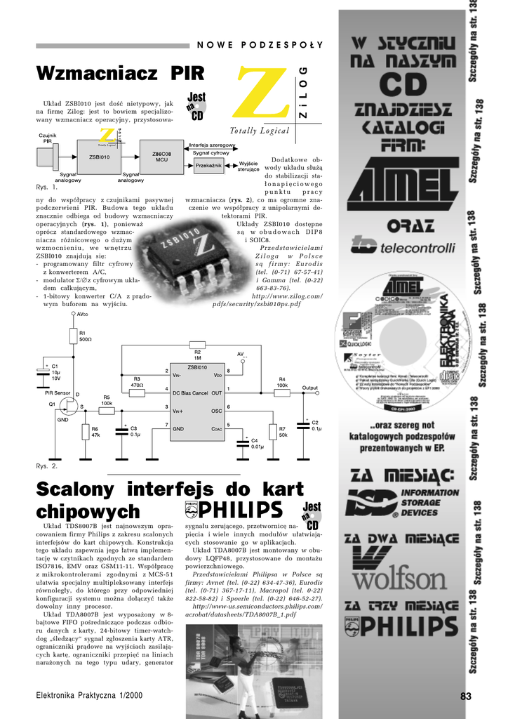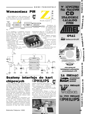 NOWE PODZESPOŁY Wzmacniacz PIR Uk³ad ZSBI010 jest doúÊ nietypowy, jak na firmÍ Zilog: jest to bowiem specjalizowany wzmacniacz operacyjny, przystosowa- Rys. 1. ny do wspÛ³pracy z†czujnikami pasywnej podczerwieni PIR. Budowa tego uk³adu znacznie odbiega od budowy wzmacniaczy operacyjnych (rys. 1), poniewaø oprÛcz standardowego wzmacniacza rÛønicowego o†duøym wzmocnieniu, we wnÍtrzu ZSBI010 znajduj¹ siÍ: - programowany filtr cyfrowy z†konwerterem A/C, - modulator Σ/∆ z†cyfrowym uk³adem ca³kuj¹cym, - 1-bitowy konwerter C/A z†pr¹dowym buforem na wyjúciu. Dodatkowe obwody uk³adu s³uø¹ do stabilizacji sta³onapiÍciowego punktu pracy wzmacniacza (rys. 2), co ma ogromne znaczenie we wspÛ³pracy z†unipolarnymi detektorami PIR. Uk³ady ZSBI010 dostÍpne s¹ w†obudowach DIP8 i†SOIC8. Przedstawicielami Ziloga w†Polsce s¹ firmy: Eurodis (tel. (0-71) 67-57-41) i Gamma (tel. (0-22) 663-83-76). http://www.zilog.com/ pdfs/security/zsbi010ps.pdf Rys. 2. Scalony interfejs do kart chipowych Uk³ad TDS8007B jest najnowszym opracowaniem firmy Philips z†zakresu scalonych interfejsÛw do kart chipowych. Konstrukcja tego uk³adu zapewnia jego ³atw¹ implementacjÍ w†czytnikach zgodnych ze standardem ISO7816, EMV oraz GSM11-11. WspÛ³pracÍ z†mikrokontrolerami zgodnymi z†MCS-51 u³atwia specjalny multipleksowany interfejs rÛwnoleg³y, do ktÛrego przy odpowiedniej konfiguracji systemu moøna do³¹czyÊ takøe dowolny inny procesor. Uk³ad TDA8007B jest wyposaøony w†8bajtowe FIFO poúrednicz¹ce podczas odbioru danych z†karty, 24-bitowy timer-watchdog ìúledz¹cyî sygna³ zg³oszenia karty ATR, ograniczniki pr¹dowe na wyjúciach zasilaj¹cych kartÍ, ograniczniki przepiÍÊ na liniach naraøonych na tego typu udary, generator Elektronika Praktyczna 1/2000 sygna³u zeruj¹cego, przetwornicÍ napiÍcia i†wiele innych modu³Ûw u³atwiaj¹cych stosowanie go w†aplikacjach. Uk³ad TDA8007B jest montowany w†obudowy LQFP48, przystosowane do montaøu powierzchniowego. Przedstawicielami Philipsa w†Polsce s¹ firmy: Avnet (tel. (0-22) 634-47-36), Eurodis (tel. (0-71) 367-17-11), Macropol (tel. 0-22) 822-58-82) i Spoerle (tel. (0-22) 646-52-27). http://www-us.semiconductors.philips.com/ acrobat/datasheets/TDA8007B_1.pdf 83 NOWE PODZESPOŁY Odbiorniki QwikRadio na pasmo 900MHz Idealne do zastosowania w†bezprzewodowych klawiaturach, bezprzewodowych peryferiach komputerowych, dwudroønych systemach zdalnego dostÍpu (ang. RKE - Remote Keyless Entry), zabawkach, systemach zabezpieczenia itp. Umoøliwiaj¹ europejskim producentom systemÛw bezprzewodowej transmisji danych w†zakresie 450MHz przejúcie na mniej zat³oczone pasma ISM 900MHz. Nowe uk³ady scalone opracowane w†firmie Micrel Semiconductor - MICRF003 i†MICRF033 - s¹ pierwszymi jednouk³adowymi odbiornikami radiowymi zdolnymi do pracy w†pasmie 900MHz (zakres 800..1000MHz). Zapewniaj¹ zasiÍg ponad 170m przy uøyciu niesymetrycznej anteny (unipola). Maj¹ tak¹ sam¹ architekturÍ jak reszta jednouk³adowych odbiornikÛw z†rodziny QwikRadio. Eliminuj¹ potrzebÍ drogiego rÍcznego strojenia, wymaganego do optymalizacji osi¹gÛw w†konkurencyjnych rozwi¹zaniach. Pobieraj¹ tylko 4mA pr¹du zasilania, co czyni je bardzo atrakcyjnymi dla systemÛw zasilanych z†baterii. Wymagaj¹ uøycia bardzo niewielu elementÛw zewnÍtrznych, nie potrzeba zewnÍtrznych filtrÛw i†cewek. MICRF003 dysponuje trybem shutdown umoøliwiaj¹cym pracÍ impulsow¹ (duty-cyc- le operation) oraz funkcj¹ wakeup, zapewniaj¹c¹ logiczn¹ identyfikacjÍ przychodz¹cego sygna³u radiowego i†umoøliwiaj¹c¹ aktywacjÍ zewnÍtrznego dekodera lub mikrokontrolera. W³asnoúci te czyni¹ go ideANT alnym do aplikacji o†bardzo 1 ma³ym poborze mocy, jak 2 RKE i†RFID. 3 Uk³ad umoøliwia trans4 misjÍ danych z†szybkoúci¹ do 20kb/s w†trybie ustalo5 +5V nej czÍstotliwoúci oscyla6 tora lokalnego (FIXED) 7 i†5kb/s w†trybie z†prze8 miataniem czÍstotliwoúci N/C (SWP). Filtracja sygna³u 0,0047 po detekcji jest dokonyw a n a w e w n Í t r z n i e . P o - Rys. 3. przez dwa wejúcia logiczne moøna wybraÊ jedn¹ z†czterech szerokoúci pasma filtru z†zakresu 0,75..6kHz (tryb SWP) lub 2,8..22,4kHz (FIXED). MICRF003 jest dostÍpny w†16-wyprowadzeniowej obudowie SO. MICRF033 jest uk³adem znacznie uproszczonym, przeznaczonym do bardzo tanich aplikacji. Jest montowany w†8-wyprowadzeniowej obudowie SO. Ma na sta³e ustawiony MICRF003 SEL0 SWEN VSSRF REFOSC VSSRF SEL1 ANT CAGC VDDRF WAKEB VDDBB SHUT CTH DO N/C VSSBB 16 15 14 13 12 11 10 9 N/C 7,12 MHz N/C N/C 4,7 DATA OUT tryb przemiatania czÍstotliwoúci, pasmo filtru demodulatora 5kHz i†dostÍpne z†zewn¹trz wejúcie aktywacji trybu shutdown. Obydwa uk³ady pracuj¹ przy zasilaniu 4,75..5,5V, w†temperaturze z†zakresu -40..105 oC. Przedstawicielem Micrela w†Polsce jest firma Future (tel. (0-22) 618-92-02). http://www.micrel.com/_PDF/micrf003.pdf Stabilizator LDO do aplikacji USB Nowy stabilizator o†ma³ym spadku napiÍcia (LDO - Low-DropOut regulator) firmy Micrel Semiconductor jest przeznaczony specjalnie do aplikacji USB, w†ktÛrych szczegÛlne znaczenie ma ma³y spadek napiÍcia na strukturze stabilizatora. MIC29311 ma wspÛ³pracowaÊ z†tanimi prze³¹cznikami zasilania USB o†stosunkowo duøej rezystancji w†stanie w³¹czenia, np. z†nowym poczwÛrnym prze³¹cznikiem Micrela MIC2527, i†zapewniÊ pe³n¹ zgodnoúÊ ze standardem. Port USB moøe pobieraÊ do 500mA pr¹du, MIC2527 ma rezystancjÍ w†stanie w³¹czenia 300mΩ, a†wiÍc spadek napiÍcia na prze³¹czniku moøe siÍgn¹Ê 0,15V. MIC29311 zapewnia, øe napiÍcie wyjúciowe doprowadzane do szyny USB nie spadnie w†takich warunkach poniøej 4,75V. MIC29311 dostarcza do wyjúcia sta³ego napiÍcia 5,1V ±3% i†maksymalnego pr¹du o†natÍøeniu 3A. Charakteryzuje siÍ szybk¹ odpowiedzi¹ na stany przejúciowe, co zapewnia odpornoúÊ na duøe zmiany obci¹