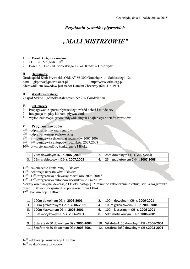 Grudziądz, dnia 11 października 2015 Regulamin zawodów pływackich „MALI MISTRZOWIE” I Termin i miejsce zawodów 1. 21.11.2015 r. godz. 1000 . 2. Basen ZSO nr 2 ul. Sobieskiego 12, os. Rządz w Grudziądzu II Organizator Grudziądzki Klub Pływacki „ORKA” 86-300 Grudziądz ul. Sobieskiego 12, e-mail: [email protected] http://www.orka.org.pl Kierownikiem zawodów jest trener Damian Zbrzeźny (604 416 197). III Współorganizatorzy Zespół Szkół Ogólnokształcących Nr 2 w Grudziądzu IV Cel imprezy 1. Propagowanie sportu pływackiego wśród dzieci i młodzieży. 2. Integracja między klubami pływackimi. 3. Wyłonienie zwycięzców indywidualnych i najlepszych sztafet zawodów. V 910 920 920 935 1000 Program zawodów -odprawa techniczna trenerów -odprawa komisji sędziowskiej -935-rozgrzewka dziewcząt roczników 2007,2008 -950-rozgrzewka chłopców roczników 2007,2008 -otwarcie zawodów, konkurencje I Bloku: 1. 3. 25m dowolnym DZ- r. 2007 ,2008 25m grzbietowym DZ- r. 2007,2008 2. 4. 25m dowolnym CH- r. 2007,2008 25m grzbietowym CH- r. 2007,2008 1130 -zakończenie konkurencji I Bloku* 1145 -dekoracja uczestników I Bloku* 1130 -1150-rozgrzewka dziewcząt roczników 2006-2001* 1150 -1210-rozgrzewka chłopców roczników 2006-2001* *-czasy orientacyjne, dekoracje I Bloku nastąpią 15 minut po zakończeniu ostatniej serii a rozgrzewka przed II Blokiem bezpośrednio po zakończeniu I Bloku 1215 konkurencje II Bloku: 1. 3. 5. 7. 100m dowolnym DZ- r. 2006-2001 100m grzbietowym DZ- r. 2006-2001 100m klasycznym DZ- r. 2006-2001 50m motylkowym DZ- r. 2006-2001 9. Sztafeta 4x50 dowolnym DZ r.2006-2004 11. Sztafeta 4x50 dowolnym DZ r.2003-2001 1600 –dekoracje konkurencji II Bloku 1630 –zakończenie zawodów 2. 4. 6. 8. 100m dowolnym CH- r. 2006-2001 100m grzbietowym CH- r. 2006-2001 100m klasycznym CH- r. 2006-2001 50m motylkowym CH- r. 2006-2001 10. Sztafeta 4x50 dowolnym CH r.2006-2004 12. Sztafeta 4x50 dowolnym CH r.2003-2001 VI Uczestnicy W zawodach prawo startu mają zawodnicy: - zgłoszeni przez klub - urodzeni w latach 2001-2008 VII Przepisy techniczne 1. Zawody rozegrane zostaną seriami na czas, ustalonymi na podstawie czasu zgłoszenia. 2. W konkurencjach indywidualnych każdy zawodnik ma prawo startu w dwóch konkurencjach. 3. Klasyfikacja prowadzona będzie w następujących kategoriach: 2001, 2002, 2003, 2004, 2005, 2006, 2007, 2008 4. W wyścigach sztafetowych klasyfikacja prowadzona będzie w dwóch kategoriach: 2003-2001, 2006-2004. Klub może wystawić dowolną ilość sztafet. VIII Zgłoszenia do zawodów 1. Obowiązuje zgłoszenie z programu Entry Edytor – Splash. Wygenerowany plik LENEX należy przesłać na adres poczty e-mail: [email protected] w nieprzekraczalnym terminie do dnia 18.11.2014r. (środa) do godz. 20.00. Zgłoszenie zostanie potwierdzone. Skreślenia i zmiany przyjmowane będą do dnia 19.11.201 r. (czwartek) do godz. 18.00. Lista startowa zostanie opublikowana na stronie internetowej www.megatiming.pl w dn.20.11.2014 r.(piątek) do godz.12.00 IX Sędziowanie 1. Komisję sędziowską powołuje Kolegium Sędziów przy Kujawsko-Pomorskim Związku Pływackim w Toruniu. 2. W czasie trwania zawodów obowiązują aktualne przepisy PZP. Zasady finansowania X 1. Koszty organizacyjne pokrywa GKP „ORKA” 2. Koszty uczestnictwa pokrywają kluby. 3. Opłata startowa zawodnika wynosi 30 zł., zgłoszenie klubu wynosi 30 zł. XI Nagrody 1. Trzem pierwszym zawodnikom w poszczególnych kategoriach i konkurencjach przyznane zostaną medale i dyplomy . 2. Zawodnicy trzech pierwszych sztafet otrzymają medale oraz dyplom. 3. Wszyscy uczestnicy I Bloku otrzymają medal, dyplom i słodki upominek. 4. Zawodnicy i zawodniczki II Bloku, którzy w poszczególnych kategoriach uzyskają najbardziej wartościowy wynik ( najlepszy start przeliczony na punkty wielobojowe FINA ) otrzymają statuetki. XII Inne 1. Nie zezwala się na start zawodników poza konkursem. 2. W związku z ograniczoną ilością miejsca na trybunach basenu szkolnego proszę dopilnować zawodników, aby torby i kurtki pozostawiali w szatni. 3. Na terenie basenu obowiązują klapki. 4. W trakcie rozgrzewki skoki startowe dozwolone są tylko na torze nr 6, który jest torem jednokierunkowym do skoków na głębokiej i nawrotów na płytkiej wodzie. 5. W celu rozgrzewki na lądzie udostępniona zastanie sala gimnastyczna A. 6. W trakcie zawodów na sali gimnastycznej B rozegrane zostaną konkurencje zręcznościowe o charakterze rekreacyjnym z upominkami. ZAPRASZAMY DO GRUDZIĄDZA