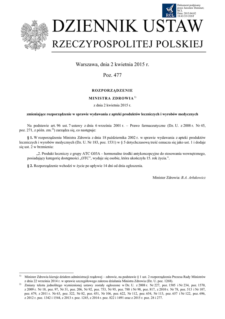 Dokument podpisany przez Jarosław Deminet; RCL Data: 2015.04.02 18:43:53 CEST DZIENNIK USTAW RZECZYPOSPOLITEJ POLSKIEJ Warszawa, dnia 2 kwietnia 2015 r. Poz. 477 RO ZP OR ZĄD ZENI E MI NIS TRA ZDR OWIA 1) z dnia 2 kwietnia 2015 r. zmieniające rozporządzenie w sprawie wydawania z apteki produktów leczniczych i wyrobów medycznych Na podstawie art. 96 ust. 7 ustawy z dnia 6 września 2001 r. – Prawo farmaceutyczne (Dz. U. z 2008 r. Nr 45, poz. 271, z późn. zm. 2)) zarządza się, co następuje: § 1. W rozporządzeniu Ministra Zdrowia z dnia 18 października 2002 r. w sprawie wydawania z apteki produktów leczniczych i wyrobów medycznych (Dz. U. Nr 183, poz. 1531) w § 5 dotychczasową treść oznacza się jako ust. 1 i dodaje się ust. 2 w brzmieniu: „2. Produkt leczniczy z grupy ATC G03A – hormonalne środki antykoncepcyjne do stosowania wewnętrznego, posiadający kategorię dostępności „OTC”, wydaje się osobie, która ukończyła 15. rok życia.”. § 2. Rozporządzenie wchodzi w życie po upływie 14 dni od dnia ogłoszenia. Minister Zdrowia: B.A. Arłukowicz 1) 2) Minister Zdrowia kieruje działem administracji rządowej – zdrowie, na podstawie § 1 ust. 2 rozporządzenia Prezesa Rady Ministrów z dnia 22 września 2014 r. w sprawie szczegółowego zakresu działania Ministra Zdrowia (Dz. U. poz. 1268). Zmiany tekstu jednolitego wymienionej ustawy zostały ogłoszone w Dz. U. z 2008 r. Nr 227, poz. 1505 i Nr 234, poz. 1570, z 2009 r. Nr 18, poz. 97, Nr 31, poz. 206, Nr 92, poz. 753, Nr 95, poz. 788 i Nr 98, poz. 817, z 2010 r. Nr 78, poz. 513 i Nr 107, poz. 679, z 2011 r. Nr 63, poz. 322, Nr 82, poz. 451, Nr 106, poz. 622, Nr 112, poz. 654, Nr 113, poz. 657 i Nr 122, poz. 696, z 2012 r. poz. 1342 i 1544, z 2013 r. poz. 1245, z 2014 r. poz. 822 i 1491 oraz z 2015 r. poz. 28 i 277.