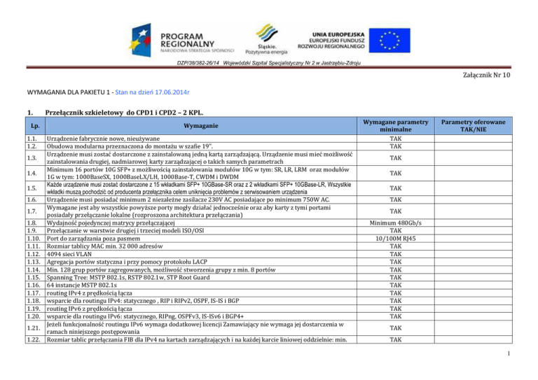DZP/38/382-26/14 Wojewódzki Szpital Specjalistyczny Nr 2 w Jastrzębiu-Zdroju Załącznik Nr 10 WYMAGANIA DLA PAKIETU 1 - Stan na dzień 17.06.2014r 1. Lp. 1.1. 1.2. 1.3. 1.4. 1.5. 1.6. 1.7. 1.8. 1.9. 1.10. 1.11. 1.12. 1.13. 1.14. 1.15. 1.16. 1.17. 1.18. 1.19. 1.20. 1.21. 1.22. Przełącznik szkieletowy do CPD1 i CPD2 – 2 KPL. Wymaganie Urządzenie fabrycznie nowe, nieużywane Obudowa modularna przeznaczona do montażu w szafie 19”. Urządzenie musi zostać dostarczone z zainstalowaną jedną kartą zarządzającą. Urządzenie musi mieć możliwość zainstalowania drugiej, nadmiarowej karty zarządzającej o takich samych parametrach Minimum 16 portów 10G SFP+ z możliwością zainstalowania modułów 10G w tym: SR, LR, LRM oraz modułów 1G w tym: 1000BaseSX, 1000BaseLX/LH, 1000Base-T, CWDM i DWDM Każde urządzenie musi zostać dostarczone z 15 wkładkami SFP+ 10GBase-SR oraz z 2 wkładkami SFP+ 10GBase-LR, Wszystkie wkładki muszą pochodzić od producenta przełącznika celem uniknięcia problemów z serwisowaniem urządzenia Urządzenie musi posiadać minimum 2 niezależne zasilacze 230V AC posiadające po minimum 750W AC. Wymagane jest aby wszystkie powyższe porty mogły działać jednocześnie oraz aby karty z tymi portami posiadały przełączanie lokalne (rozproszona architektura przełączania) Wydajność pojedynczej matrycy przełączającej Przełączanie w warstwie drugiej i trzeciej modeli ISO/OSI Port do zarządzania poza pasmem Rozmiar tablicy MAC min. 32 000 adresów 4094 sieci VLAN Agregacja portów statyczna i przy pomocy protokołu LACP Min. 128 grup portów zagregowanych, możliwość stworzenia grupy z min. 8 portów Spanning Tree: MSTP 802.1s, RSTP 802.1w, STP Root Guard 64 instancje MSTP 802.1s routing IPv4 z prędkością łącza wsparcie dla routingu IPv4: statycznego , RIP i RIPv2, OSPF, IS-IS i BGP routing IPv6 z prędkością łącza wsparcie dla routingu IPv6: statycznego, RIPng, OSPFv3, IS-ISv6 i BGP4+ Jeżeli funkcjonalność routingu IPv6 wymaga dodatkowej licencji Zamawiający nie wymaga jej dostarczenia w ramach niniejszego postępowania Rozmiar tablic przełączania FIB dla IPv4 na kartach zarządzających i na każdej karcie liniowej oddzielnie: min. Wymagane parametry minimalne TAK TAK Parametry oferowane TAK/NIE TAK TAK TAK TAK TAK Minimum 480Gb/s TAK 10/100M RJ45 TAK TAK TAK TAK TAK TAK TAK TAK TAK TAK TAK TAK 1 DZP/38/382-26/14 Wojewódzki Szpital Specjalistyczny Nr 2 w Jastrzębiu-Zdroju 1.23. 1.24. 1.25. 1.26. 1.27. 1.28. 1.29. 1.30. 1.31. 1.32. 1.33. 1.34. 1.35. 1.36. 1.37. 1.38. 1.39. 1.40. 1.41. 1.42. 1.43. 1.44. 1.45. 1.46. 1.47. 16 000 wpisów Virtual Router Redundancy Protocol (VRRP) IGMPv1, v2, and v3 PIM-SSM, PIM-DM i PIM-SM NSF Zaawansowany mechanizm kolejkowania procesora zapobiegający atakom DoS DHCP snooping RADIUS Secure Shell (SSHv2) IEEE 802.1X– dynamiczne dostarczanie polityk QoS, ACLs i sieci VLANs: zezwalające na nadzór nad dostępem użytkownika do sieci Guest VLAN Port isolation Port security: zezwalający na dostęp tylko specyficznym adresom MAC MAC-basedauthentication IP sourceguard URPF FunkcjeQoS: kreowanie kla sruchu w oparciu o access control lists (ACLs), IEEE 802.1p precedence, IP, DSCP oraz Type of Service (ToS) precedence Wsparcie dla następujących metod zapobiegania zatorom: priority queuing, weighted round robin (WRR), weighted random early discard (WRED) Urządzenie musi posiada mechanizm do badania jakości połączeń (IP SLA) z możliwością badania takich parametrów jak: jitter, opóźnienie, straty pakietów dla wygenerowanego strumienia testowego UDP. Urządzenie musi mieć możliwość pracy jako generator oraz jako odbiornik pakietów testowych IP SLA. Urządzenie musi umożliwiać konfigurację liczby wysyłanych pakietów UDP w ramach pojedynczej próbki oraz odstępu czasowego pomiędzy kolejnymi wysyłanymi pakietami UDP w ramach pojedynczej próbki. Jeżeli funkcjonalność IP SLA wymaga licencji to Zamawiający nie wymaga jej dostarczenia w ramach niniejszego postępowania Port mirroring Zdalna konfiguracja i zarządzanie przez Web (https) oraz linię komend (CLI) IEEE 802.1ab LLDP Usługi DHCP: serwer (RFC 2131), klient i relay SNMPv1, v2c, and v3 Syslog Wszystkie dostarczone wkładki SFP+ muszą pochodzić od tego samego producenta co oferowane przełączniki, muszą być z nimi kompatybilne i objęte takim samym serwisem gwarancyjnym jak przełączniki TAK TAK TAK TAK TAK TAK TAK TAK TAK TAK TAK TAK TAK TAK TAK TAK TAK TAK TAK TAK TAK TAK TAK TAK TAK 2 DZP/38/382-26/14 Wojewódzki Szpital Specjalistyczny Nr 2 w Jastrzębiu-Zdroju 1.51. Urządzenie musi być fabrycznie nowe i nieużywane wcześniej w żadnych projektach, wyprodukowane nie wcześniej niż 6 miesięcy przed dostawą i nieużywane przed dniem dostarczenia z wyłączeniem używania niezbędnego dla przeprowadzenia testu ich poprawnej pracy Urządzenie musi pochodzić z autoryzowanego kanału dystrybucji producenta przeznaczonego na teren Unii Europejskiej, a korzystanie przez Zamawiającego z dostarczonego produktu nie może stanowić naruszenia majątkowych praw autorskich osób trzecich. Zamawiający wymaga dostarczenia wraz z urządzeniem oświadczenia przedstawiciela producenta potwierdzającego ważność uprawnień gwarancyjnych na terenie Polski Zamawiający wymaga, aby dostarczony przełącznik sieciowy posiadał gwarancję minimum 5 lat, świadczoną przez Wykonawcę na bazie wsparcia serwisowego producenta. Wymiana uszkodzonego elementu w trybie 8x5xNBD. Okres gwarancji liczony będzie od daty sporządzenia protokołu zdawczo-odbiorczego przedmiotu zamówienia Bezpłatna aktualizacja oprogramowania urządzenia przez cały okres gwarancji urządzenia 2. Przełącznik dystrybucyjny do punktów dystrybucyjnych PD – 15 KPL. 1.48. 1.49. 1.50. Lp. Wymaganie 2.1. Urządzenie fabrycznie nowe, nieużywane 2.2. Parametry fizyczne 2.3. Zasilanie 2.4. Zasilanie nadmiarowe 2.5. Zakres temperatur pracy 2.6. Ilość p
