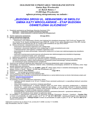 OGŁOSZENIE O PRZETARGU NIEOGRANICZONYM Gmina Kąty Wrocławskie ul. Rynek Ratusz 1 55-080 Kąty Wrocławskie ogłasza przetarg nieograniczony na zadanie : „BUDOWA DROGI UL. HEBANOWEJ W SMOLCU GMINA KĄTY WROCŁAWSKIE – ETAP BUDOWA OŚWIETLENIA ULICZNEGO” 1) Przedmiot zamówienia wg Wspólnego Słownika Zamówień CPV45316110-9 – instalowanie urządzeń oświetlenia drogowego 45231400-9 – roboty budowlane w zakresie budowy linii energetycznych 2) Termin wykonania zamówienia 30 maja 2010 r. 3.1 Zakres zamówienia obejmuje: 1) Wykonanie sieci kablowych. 2 − Wykonanie w ulicy Hebanowej w Smolcu sieci kablowej linii oświetlenia drogowego YAKY 5x16 mm długości 533 mb, montaż 16 szt. słupów oświetleniowych typu ARES 9F, montaż 16 szt. opraw oświetleniowych WSL-800, montaż szafki złączowo-pomiarowej typu ZK-18, montaż szafki oświetlenia ulic typu SOU-3/RO/F. 2) Roboty pomiarowe i zabezpieczenie placu budowy − opracowanie dokumentacji organizacji ruchu zastępczego − wyniesienie i utrzymanie organizacji ruchu zastępczego w czasie prowadzenia prac wraz z zabezpieczeniem robót zgodnie z projektem organizacji ruchu − doprowadzenie do stanu pierwotnego i odtworzenia nawierzchni na trasie sieci elektroenergetycznej oświetlenia drogowego; − wykonanie inwentaryzacji powykonawczej wybudowanej sieci elektroenergetycznej oświetlenia drogowego, − wykonanie niezbędnych badań, prób i sprawdzeń. 3. Wykonawca oświadcza, iż przedmiot umowy wykona siłami własnymi. 4. Roboty określone w ust. 2 powinny być wykonane zgodnie z posiadaną dokumentacją techniczną, specyfikacją techniczną wykonania i odbioru robót budowlanych, przepisami prawa budowlanego i sztuką budowlaną. do montowanych opraw oświetleniowych i projektorów 4) Wyklucza się możliwość składania ofert częściowych na realizację jakiejkolwiek części niniejszego zadania. 5) Zamawiający nie dopuszcza możliwości złożenia oferty wariantowej przewidującej odmienne niż określony przez niego sposób wykonania zamówienia. 6) Termin składania ofert upływa dnia 11 -12-2009 r. godz. 930. Oferty należy złożyć w siedzibie Zamawiającego: Urząd Miasta i Gminy ul. Rynek – Ratusz 1 55-080 Kąty Wrocławskie, pok. nr 1. 7) Zastosowane kryteria: cena ofertowa - waga 100 % 8) Wadium: nie wymaga się wniesienia wadium 9) Termin związania ofertą: 30 dni od dnia składania ofert 10) Specyfikacja istotnych warunków zamówienia jest udostępniona w wersji elektronicznej na stronie internetowej urzędu pod adresem www.bip.katywroclawskie.pl 11) Warunki udziału w postępowaniu: Do przetargu zostaną zakwalifikowani wykonawcy, którzy: spełniają warunki zawarte w art. 22 ust. 2 Ustawy Prawo zamówień publicznych i w specyfikacji istotnych warunków zamówienia złożą ofertę kompletną w rozumieniu niniejszej specyfikacji wykażą się zrealizowanymi, w okresie ostatnich pięciu lat przed dniem wszczęcia postępowania o udzielenie zamówienia, a jeżeli okres prowadzenie działalności jest krótszy – w tym okresie minimum 2 (dwoma) robotami budowy oświetlenia drogowego o wartości robót powyżej 100.000,00 zł brutto każda oraz przedstawią dokumenty potwierdzające, że roboty te zostały wykonane należycie posiadają kadrę z uprawnieniami do realizacji przedmiotu zamówienia (kierownik - uprawnienia elektryczne) zapewnią 36 miesięczny okres rękojmi na wykonane roboty 12) Do kontaktów z wykonawcami uprawniony jest Pracownik Wydziału Planowania, Rozwoju i Inwestycji – Czesław Stec w dniach od poniedziałku do piątku w godz. od 900 do 1400 tel. 0-71 390-72-09 – (sprawy techniczne) oraz Pełnomocnik ds. zamówień publicznych - Jadwiga Kurpiel w dniach od poniedziałku do piątku w godz. 900 do 1400 tel. 0-71 390-72-19 – (sprawy proceduralne) Ogłoszenie wywiesza się na okres 21 dni, od dnia 20.11.2009r. do dnia 11-12-2009r. Kąty Wrocławskie, dnia 20.11.2009 r.