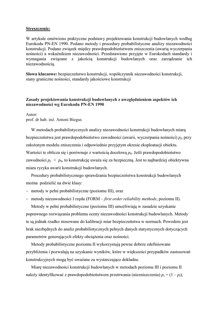 Słowa kluczowe: bezpieczeństwo konstrukcji, współczynnik niezawodności konstrukcji,