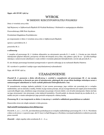 Sygn. akt III RC 156/14 WYROK W IMIENIU RZECZYPOSPOLITEJ POLSKIEJ Dnia 17 września 2014 roku Sąd Rejonowy w Ząbkowicach Śląskich III Wydział Rodzinny i Nieletnich w następującym składzie: Przewodniczący SSR Piotr Szynkura Protokolant Magdalena Przyślakiewicz po rozpoznaniu w dniu 17 września 2014 roku w Ząbkowicach Śląskich sprawy z powództwa B. J. przeciwko M. J. o alimenty I. zasądza od pozwanego M. J. tytułem alimentów na utrzymanie powoda B. J. urodz. (...) kwotę po 500 złotych miesięcznie (pięćset złotych), począwszy od dnia 08 sierpnia 2014 roku, raty płatne z góry do 10 – go dnia każdego miesiąca z ustawowymi odsetkami w razie zwłoki w terminie płatności którejkolwiek z rat do rąk powoda B. J. II. nie obciąża pozwanego kosztami postępowania w sprawie zaliczając je na rachunek Skarbu Państwa III. wyrokowi w punkcie I nadaje rygor natychmiastowej wykonalności Sygn. akt III RC 156/14 UZASADNIENIE Powód B. J. pozwem z dnia 08.08.2014 r. wniósł o zasądzenie od pozwanego M. J. na swoją rzecz alimentów w kwocie po 500 zł miesięcznie, płatnych do 10-go dnia każdego miesiąca wraz z ustawowymi odsetkami w razie zwłoki płatności którejkolwiek z rat. W uzasadnieniu swojego żądania podniósł, iż jest synem pozwanego, jego rodzice nie pozostają już w związku małżeńskim, zaś on mieszka z matką. Dodał, że jego mama pracuje, ale jej wynagrodzenie jest zajęte przez komornika z powodu długów ojca, skutkiem czego otrzymuje ona pensję w kwocie około 1 100 zł netto miesięcznie. Ojciec nie łoży na jego utrzymanie i nie utrzymuje z nim żadnych kontaktów. Powód podał, że obecnie dostał się na studia do K., a matka nie jest w stanie zabezpieczyć jego potrzeb związanych z dalszą nauką. Pozwany M. J. na rozprawie w dniu 17.09.2014 r. wniósł o oddalenie powództwa w całości. Stanowisko stron nie uległo zmianie w toku procesu. Sąd ustalił następujący stan faktyczny: Powód B. J., ur. (...) w Z. Śl., jest dzieckiem pochodzącym ze związku małżeńskiego pozwanego M. J. i E. S.. Wyrokiem z dnia 12.06.2013 r. w sprawie sygn. akt I C 1647/12 Sąd Okręgowy w Świdnicy rozwiązał małżeństwo rodziców powoda przez rozwód. Dowód: - odpis zupełny aktu urodzenia B. J. – k. 4 - odpis wyroku Sądu Okręgowego w Świdnicy z dnia 12.06.2013 r. w sprawie sygn. akt I C 1647/12 - k. 5 B. J. w bieżącym roku ukończył liceum ogólnokształcące dla dorosłych i zdał maturę. W roku akademickim 2014/2015 powód rozpoczął studia na Uniwersytecie (...) na (...) na kierunku (...)(...). Studia odbywają się w systemie stacjonarnym. W chwili obecnej powód nie otrzymał jeszcze decyzji w przedmiocie przyznania miejsca w domu studenckim ani w kwestii pomocy materialnej (stypendium socjalnego). Dowód: - decyzja o przyjęciu na studia z dnia 11.07.2014 r. - k. 8 - zeznanie świadka E. S. - k. 25-25v. - zeznanie powoda B. J. – k. 25v. - 26 Koszt wyżywienia powoda wynosi około 300 zł miesięcznie, zaś wydatki na zakup odzieży i środków higienicznych stanowią kwotę rzędu 200 zł w skali miesiąca. Koszt zakupu biletu miesięcznego komunikacji miejskiej w K. to wydatek rzędu 100 zł. Koszt dojazdu na trasie B. - K. wynosi około 35 zł w jedną stronę. Dowód: - zeznanie świadka E. S. - k. 25-25v. - zeznanie powoda B. J. – k. 25v. - 26 B. J. na stałe mieszka wraz z matką E. S. w jednorodzinnym domu w B. przy ul. (...), należącym do matki powoda. Koszty utrzymania domu oscylują wokół kwoty 355 zł miesięcznie, na co składają się: opłata za energię elektryczną około 144 zł, opłata za gaz - około 110 zł, opłata za wodę - około 60 zł, opłata za wywóz nieczystości - 22 zł, podatek od nieruchomości - około 17 zł (około 200 zł rocznie). Dodatkowo matka powoda ponosi koszty zakupu opału w okresie grzewczym. Łącznie w domu mieszkają trzy osoby. Dowód: - dowody wpłat należności za energię elektryczną, gaz, wodę, wywóz nieczystości - k. 15-22 Matka powoda E. S. pracuje zawodowo w Niepublicznym Zakładzie Opieki Zdrowotnej (...) Sp. z o.o. w K., osiągając wynagrodzenie za pracę w kwocie około 1 530 zł netto miesięcznie. Wynagrodzenie jest obciążone z tytułu egzekucji komorniczej kwotą około 348 zł miesięcznie. Zadłużenie pochodzi z tytułu nie spłaconych kredytów bankowych zaciąganych przez M. J. w związku z prowadzeniem działalności gospodarczej jeszcze w czasie trwania małżeństwa z matką powoda. Kwota zadłużenia w chwili obecnej wynosi około 150 000 zł. Dowód: - zaświadczenia o zatrudnieniu i wynagrodzeniu matki powoda – k. 7, 23 - zeznanie świadka B. M. – k. 30v.-31 Pozwany M. J. z zawodu jest inżynierem budownictwa. Obecnie jest zarejestrowany w urzędzie pracy jako osoba bezrobotna i odbywa staż w (...) w Z. Śl., za co otrzymuje stypendium w wysokości około 800 zł miesięcznie. Wcześniej pozwany prowadził działalność gospodarczą w zakresie handlu materiałami instalacyjnymi, która aktualnie jest zawieszona. Na pozwanym ciąży obowiązek zapłaty kwoty około 20 000 zł tytułem podatku dochodowego od nieudokumentowanego zbycia towarów. Pozwany nie ma żadnych przeciwwskazań zdrowotnych do podejmowania zatrudnienia, jest osobą w pełni zdolną do pracy. Dowód: - zeznanie pozwanego M. J. – k. 26 - 26v. Pozwany nie ma obecnie stałego miejsca zamieszkania - najczęściej przebywa u swojej matki w miejscowości D., niekiedy pomieszkuje u znajomych. Pozwany pomaga swojej matce w pracach gospodarskich oraz partycypuje w kosztach zakupu opału w kwocie koło 200 zł miesięcznie. Pozwany szacuje swój koszt utrzymania na kwotę 1 500 zł miesięcznie. Dowód: - zeznanie pozwanego M. J. – k. 26 - 26v. M. J. posiada samochód dostawczy marki I., rok produkcji 2000. W ostatnim czasie na naprawę w/w pojazdu przeznaczył kwotę około 2 500 zł. Pozwany nie jest właścicielem żadnych nieruchomości ani nie posiada żadn