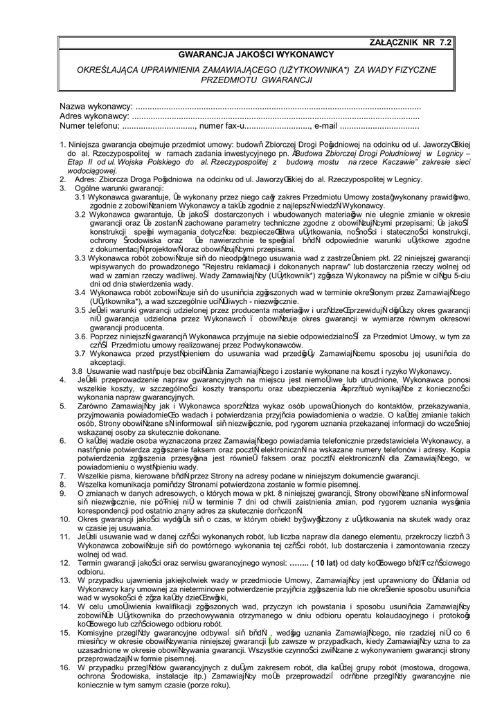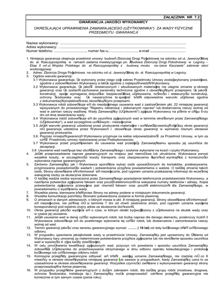 ZAŁĄCZNIK NR 7.2 GWARANCJA JAKOŚCI WYKONAWCY OKREŚLAJĄCA UPRAWNIENIA ZAMAWIAJĄCEGO (UŻYTKOWNIKA*) ZA WADY FIZYCZNE PRZEDMIOTU GWARANCJI Nazwa wykonawcy: .......................................................................................................................... Adres wykonawcy: ........................................................................................................................... Numer telefonu: ..............................., numer fax-u............................, e-mail .................................. 1. Niniejsza gwarancja obejmuje przedmiot umowy: budowę Zbiorczej Drogi Południowej na odcinku od ul. Jaworzyńskiej do al. Rzeczypospolitej w ramach zadania inwestycyjnego pn. „Budowa Zbiorczej Drogi Południowej w Legnicy – Etap II od ul. Wojska Polskiego do al. Rzeczypospolitej z budową mostu na rzece Kaczawie” zakresie sieci wodociągowej. 2. Adres: Zbiorcza Droga Południowa na odcinku od ul. Jaworzyńskiej do al. Rzeczypospolitej w Legnicy. 3. Ogólne warunki gwarancji: 3.1 Wykonawca gwarantuje, że wykonany przez niego cały zakres Przedmiotu Umowy został wykonany prawidłowo, zgodnie z zobowiązaniem Wykonawcy a także zgodnie z najlepszą wiedzą Wykonawcy. 3.2 Wykonawca gwarantuje, że jakość dostarczonych i wbudowanych materiałów nie ulegnie zmianie w okresie gwarancji oraz że zostaną zachowane parametry techniczne zgodne z obowiązującymi przepisami; że jakość konstrukcji spełni wymagania dotyczące: bezpieczeństwa użytkowania, nośności i stateczności konstrukcji, ochrony środowiska oraz że nawierzchnie te spełniać będą odpowiednie warunki użytkowe zgodne z dokumentacją projektową oraz obowiązującymi przepisami. 3.3 Wykonawca robót zobowiązuje się do nieodpłatnego usuwania wad z zastrzeżeniem pkt. 22 niniejszej gwarancji wpisywanych do prowadzonego "Rejestru reklamacji i dokonanych napraw" lub dostarczenia rzeczy wolnej od wad w zamian rzeczy wadliwej. Wady Zamawiający (Użytkownik*) zgłasza Wykonawcy na piśmie w ciągu 5-ciu dni od dnia stwierdzenia wady. 3.4 Wykonawca robót zobowiązuje się do usunięcia zgłoszonych wad w terminie określonym przez Zamawiającego (Użytkownika*), a wad szczególnie uciążliwych - niezwłocznie. 3.5 Jeżeli warunki gwarancji udzielonej przez producenta materiałów i urządzeń przewidują dłuższy okres gwarancji niż gwarancja udzielona przez Wykonawcę – obowiązuje okres gwarancji w wymiarze równym okresowi gwarancji producenta. 3.6. Poprzez niniejszą gwarancję Wykonawca przyjmuje na siebie odpowiedzialność za Przedmiot Umowy, w tym za część Przedmiotu umowy realizowanej przez Podwykonawców. 3.7 Wykonawca przed przystąpieniem do usuwania wad przedłoży Zamawiającemu sposobu jej usunięcia do akceptacji. 3.8 Usuwanie wad następuje bez obciążania Zamawiającego i zostanie wykonane na koszt i ryzyko Wykonawcy. 4. Jeżeli przeprowadzenie napraw gwarancyjnych na miejscu jest niemożliwe lub utrudnione, Wykonawca ponosi wszelkie koszty, w szczególności koszty transportu oraz ubezpieczenia „sprzętu” wynikające z konieczności wykonania napraw gwarancyjnych. 5. Zarówno Zamawiający jak i Wykonawca sporządza wykaz osób upoważnionych do kontaktów, przekazywania, przyjmowania powiadomień o wadach i potwierdzania przyjęcia powiadomienia o wadzie. O każdej zmianie takich osób, Strony obowiązane są informować się niezwłocznie, pod rygorem uznania przekazanej informacji do wcześniej wskazanej osoby za skutecznie dokonane. 6. O każdej wadzie osoba wyznaczona przez Zamawiającego powiadamia telefonicznie przedstawiciela Wykonawcy, a następnie potwierdza zgłoszenie faksem oraz pocztą elektroniczną na wskazane numery telefonów i adresy. Kopia potwierdzenia zgłoszenia przesyłana jest również faksem oraz pocztą elektroniczną dla Zamawiającego, w powiadomieniu o wystąpieniu wady. 7. Wszelkie pisma, kierowane będą przez Strony na adresy podane w niniejszym dokumencie gwarancji. 8. Wszelka komunikacja pomiędzy Stronami potwierdzona zostanie w formie pisemnej. 9. O zmianach w danych adresowych, o których mowa w pkt. 8 niniejszej gwarancji, Strony obowiązane są informować się niezwłocznie, nie później niż w terminie 7 dni od chwili zaistnienia zmian, pod rygorem uznania wysłania korespondencji pod ostatnio znany adres za skutecznie doręczoną. 10. Okres gwarancji jakości wydłuża się o czas, w którym obiekt był wyłączony z użytkowania na skutek wady oraz w czasie jej usuwania. 11. Jeżeli usuwanie wad w danej części wykonanych robót, lub liczba napraw dla danego elementu, przekroczy liczbę 3 Wykonawca zobowiązuje się do powtórnego wykonania tej części robót, lub dostarczenia i zamontowania rzeczy wolnej od wad. 12. Termin gwarancji jakości oraz serwisu gwarancyjnego wynosi: …….. ( 10 lat) od daty końcowego bądź częściowego odbioru. 13. W przypadku ujawnienia jakiejkolwiek wady w przedmiocie Umowy, Zamawiający jest uprawniony do żądania od Wykonawcy kary umownej za nieterminowe potwierdzenie przyjęcia zgłoszenia lub nie określenie sposobu usunięcia wad w wysokości …zł za każdy dzień zwłoki, 14. W celu umożliwienia kwalifikacji zgłoszonych wad, przyczyn ich powstania i sposobu usunięcia Zamawiający zobowiąże Użytkownika do przechowywania otrzymanego w dniu odbioru operatu kolaudacyjnego i protokołu końcowego lub częściowego odbioru robót. 15. Komisyjne przeglądy gwarancyjne odbywać się będą , według uznania Zamawiającego, nie rzadziej niż co 6 miesięcy w okresie obowiązywania niniejszej gwarancji lub zawsze w przypadkach, kiedy Zamawiający uzna to za uzasadnione w okresie obowiązywania gwarancji. Wszystkie czynności związane z wykonywaniem gwarancji strony przeprowadzają w formie pisemnej. 16. W przypadku przeglądów gwarancyjnych z dużym zakresem robót, dla każdej grupy robót (mostowa, drogowa, ochrona środowiska, instalacje itp.