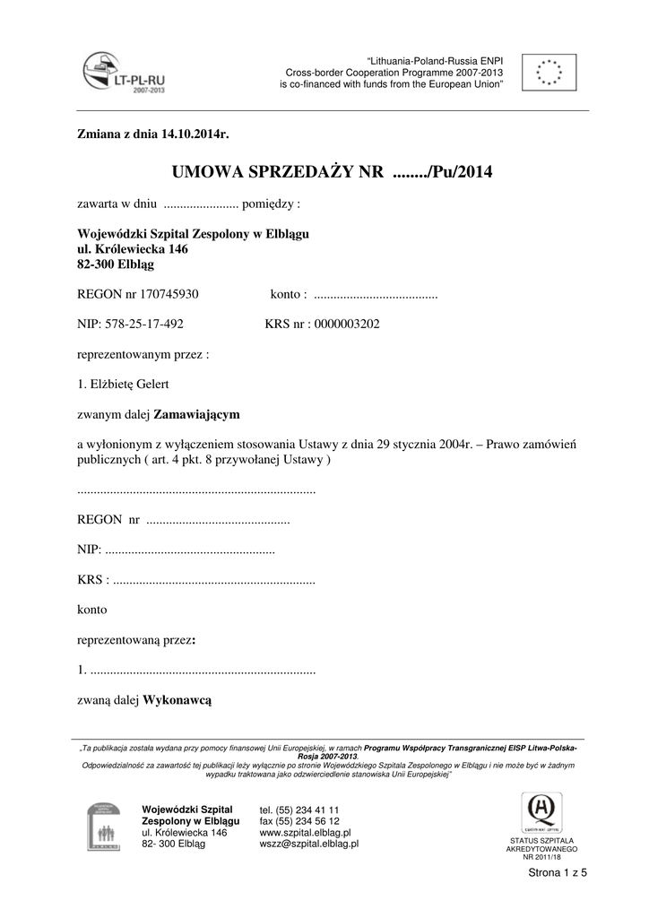 “Lithuania-Poland-Russia ENPI Cross-border Cooperation Programme 2007-2013 is co-financed with funds from the European Union” Zmiana z dnia 14.10.2014r. UMOWA SPRZEDAŻY NR ......../Pu/2014 zawarta w dniu ....................... pomiędzy : Wojewódzki Szpital Zespolony w Elblągu ul. Królewiecka 146 82-300 Elbląg REGON nr 170745930 NIP: 578-25-17-492 konto : ...................................... KRS nr : 0000003202 reprezentowanym przez : 1. Elżbietę Gelert zwanym dalej Zamawiającym a wyłonionym z wyłączeniem stosowania Ustawy z dnia 29 stycznia 2004r. – Prawo zamówień publicznych ( art. 4 pkt. 8 przywołanej Ustawy ) ......................................................................... REGON nr ............................................ NIP: .................................................... KRS : .............................................................. konto reprezentowaną przez: 1. ..................................................................... zwaną dalej Wykonawcą „Ta publikacja została wydana przy pomocy finansowej Unii Europejskiej, w ramach Programu Współpracy Transgranicznej EISP Litwa-PolskaRosja 2007-2013. Odpowiedzialność za zawartość tej publikacji leży wyłącznie po stronie Wojewódzkiego Szpitala Zespolonego w Elblągu i nie może być w żadnym wypadku traktowana jako odzwierciedlenie stanowiska Unii Europejskiej” Wojewódzki Szpital Zespolony w Elblągu ul. Królewiecka 146 82- 300 Elbląg tel. (55) 234 41 11 fax (55) 234 56 12 www.szpital.elblag.pl [email protected] STATUS SZPITALA AKREDYTOWANEGO NR 2011/18 Strona 1 z 5 “Lithuania-Poland-Russia ENPI Cross-border Cooperation Programme 2007-2013 is co-financed with funds from the European Union” §1 1. Przedmiotem umowy jest sprzedaż, dostawa sprzętu AGD w 2 pakietach: Pakiet nr 1: • Ekspres do kawy – szt. 1 • Telefon bezprzewodowy – szt.1 • Czajnik elektryczny – szst.1 • Lodówka – szt.1 • Kuchenka mikrofalowa – szt.1 Pakiet nr 2: • Termos gastronomiczny z podgrzewaczem – szt.2 o parametrach zgodnych z przedstawionymi w ofercie Wykonawcy z dnia ..............................r., która stanowi załącznik do niniejszej umowy. – w związku z realizacją projektu w ramach Programu Współpracy Transgranicznej EISP Litwa – Polska – Rosja 2007 – 2013 pn. „Rozwój nowoczesnych zespołów ratownictwa medycznego polegający na modernizacji infrastruktury, rozbudowie systemu wspomagania decyzji oraz podniesieniu jakości świadczeń medycznych w oparciu o współpracę transgraniczną” nr umowy ILPR.02.02.00-28-089/10-00, zgodnie z budżetem projektu linii budżetowej 3. Wyposażenie i dostawy Aplicant, Activiti 4 : • 3.3.16. Ekspres do kawy, • 3.3.17. Telefon, • 3.3.18. Czajnik elektryczny, • 3.3.19. Lodówka, • 3.3.20. Kuchenka mikrofalowa, • 3.3.23. Termos gastronomiczny z podgrzewaczem. 2. Wykonawca gwarantuje, że dostarczany przedmiot zamówienia posiada dokumenty dopuszczające do obrotu i używania (atesty, certyfikaty) 1. Dostawa przedmiotu zamówienia odbędzie się jednorazowo w uzgodnieniu z Zamawiającym. 2. Wykonawca dostarczy przedmiot umowy do Zamawiającego własnym lub wynajętym środkiem transportu, na swój koszt i ryzyko w dni robocze Zamawiającego, tj. poniedziałek-piątek w godzinach pracy Zamawiającego. 3. Wykonawca w terminie do 3 dni roboczych od podpisania umowy przedłoży Zamawiającemu do ostatecznej akceptacji katalog producenta z podaniem numeru katalogowego, nazwy producenta, opisu i zdjęcia oferowanego produktu. 4. Wykonawca zobowiązuje się do dostarczenia przedmiotu zamówienia w terminie nie przekraczającym 4 tygodni licząc od daty podpisania umowy. 5. Osobami odpowiedzialnymi za przyjęcie ilościowe przedmiotu zamówienia są: ............................................................................................................................................... „Ta publikacja została wydana przy pomocy finansowej Unii Europejskiej, w ramach Programu Współpracy Transgranicznej EISP Litwa-PolskaRosja 2007-2013. Odpowiedzialność za zawartość tej publikacji leży wyłącznie po stronie Wojewódzkiego Szpitala Zespolonego w Elblągu i nie może być w żadnym wypadku traktowana jako odzwierciedlenie stanowiska Unii Europejskiej” Strona 2 z 5 “Lithuania-Poland-Russia ENPI Cross-border Cooperation Programme 2007-2013 is co-financed with funds from the European Union” §3 Pakiet nr 1: 1. Wartość umowy wynosi: ........................................................................................ zł netto Słownie : ………………………………………………………………………………………. 2. Wartość umowy wynosi: ........................................................................................ zł brutto Słownie : ………………………………………………………………………………………. 3. Cena zawiera podatek VAT w kwocie ............................................................................... zł Pakiet nr 2: 1. Wartość umowy wynosi: ........................................................................................ zł netto Słownie : ………………………………………………………………………………………. 2. Wartość umowy wynosi: ........................................................................................ zł brutto Słownie : ………………………………………………………………………………………. 3. Cena zawiera podatek VAT w kwocie ............................................................................... zł §4 1. 2. 3. a) b) c) d) 4. 5. Zamawiający zapłaci Wykonawcy za dostarczony przedmiot zamówienia cenę zaoferowaną w ofercie Wykonawcy z dnia ...................................... r. Ceny jednostkowe przedmiotu niniejszej umowy przedstawione w ofercie z dnia .............................. r. n