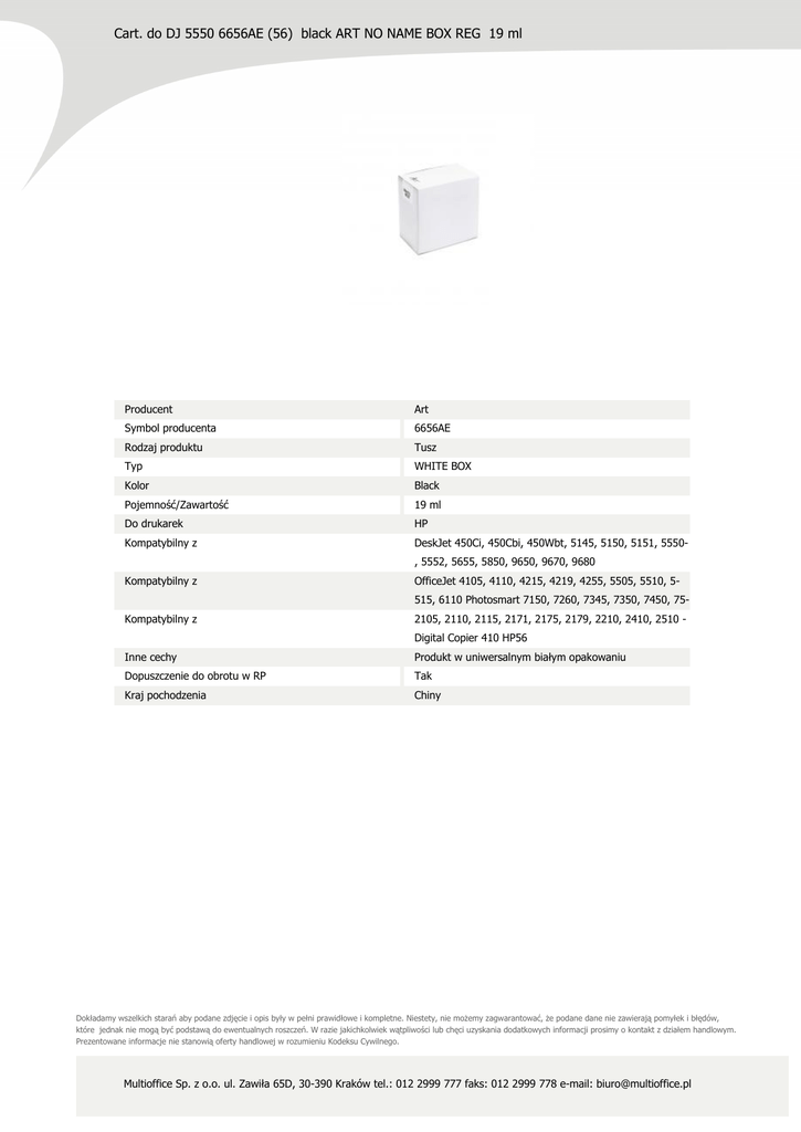 Cart. do DJ 5550 6656AE (56) black ART NO NAME BOX REG 19 ml Producent Art Symbol producenta 6656AE Rodzaj produktu Tusz Typ WHITE BOX Kolor Black Pojemność/Zawartość 19 ml Do drukarek HP Kompatybilny z DeskJet 450Ci, 450Cbi, 450Wbt, 5145, 5150, 5151, 5550, 5552, 5655, 5850, 9650, 9670, 9680 Kompatybilny z OfficeJet 4105, 4110, 4215, 4219, 4255, 5505, 5510, 5515, 6110 Photosmart 7150, 7260, 7345, 7350, 7450, 75- Kompatybilny z 2105, 2110, 2115, 2171, 2175, 2179, 2210, 2410, 2510 Digital Copier 410 HP56 Inne cechy Produkt w uniwersalnym białym opakowaniu Dopuszczenie do obrotu w RP Tak Kraj pochodzenia Chiny Dokładamy wszelkich starań aby podane zdjęcie i opis były w pełni prawidłowe i kompletne. Niestety, nie możemy zagwarantować, że podane dane nie zawierają pomyłek i błędów, które jednak nie mogą być podstawą do ewentualnych roszczeń. W razie jakichkolwiek wątpliwości lub chęci uzyskania dodatkowych informacji prosimy o kontakt z działem handlowym. Prezentowane informacje nie stanowią oferty handlowej w rozumieniu Kodeksu Cywilnego. Multioffice Sp. z o.o. ul. Zawiła 65D, 30-390 Kraków tel.: 012 2999 777 faks: 012 2999 778 e-mail: [email protected]