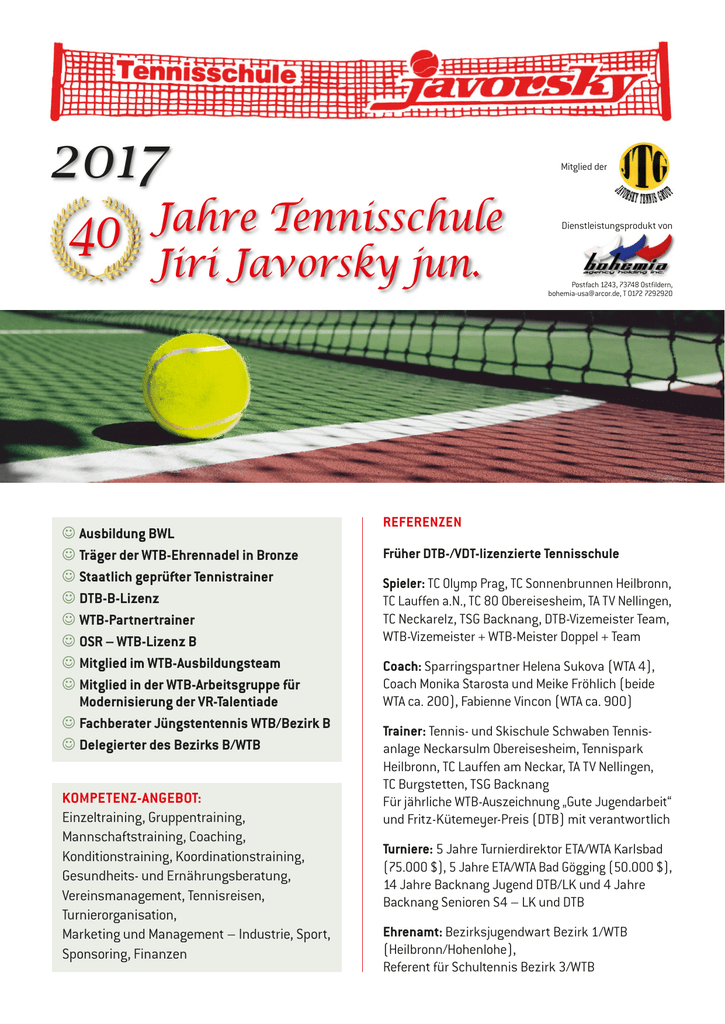 2017 40 Jahre Tennisschule Jiri Javorsky jun. ☺ Ausbildung BWL ☺ Träger der WTB-Ehrennadel in Bronze ☺ Staatlich geprüfter Tennistrainer ☺ DTB-B-Lizenz ☺ WTB-Partnertrainer ☺ OSR – WTB-Lizenz B ☺ Mitglied im WTB-Ausbildungsteam ☺ Mitglied in der WTB-Arbeitsgruppe für Modernisierung der VR-Talentiade ☺ Fachberater Jüngstentennis WTB/Bezirk B ☺ Delegierter des Bezirks B/WTB KOMPETENZ-ANGEBOT: Einzeltraining, Gruppentraining, Mannschaftstraining, Coaching, Konditionstraining, Koordinationstraining, Gesundheits- und Ernährungsberatung, Vereinsmanagement, Tennisreisen, Turnierorganisation, Marketing und Management – Industrie, Sport, Sponsoring, Finanzen Mitglied der Dienstleistungsprodukt von Postfach 1243, 73748 Ostfildern, [email protected], T 0172 7292920 REFERENZEN Früher DTB-/VDT-lizenzierte Tennisschule Spieler: TC Olymp Prag, TC Sonnenbrunnen Heilbronn, TC Lauffen a.N., TC 80 Obereisesheim, TA TV Nellingen, TC Neckarelz, TSG Backnang, DTB-Vizemeister Team, WTB-Vizemeister + WTB-Meister Doppel + Team Coach: Sparringspartner Helena Sukova (WTA 4), Coach Monika Starosta und Meike Fröhlich (beide WTA ca. 200), Fabienne Vincon (WTA ca. 900) Trainer: Tennis- und Skischule Schwaben Tennisanlage Neckarsulm Obereisesheim, Tennispark Heilbronn, TC Lauffen am Neckar, TA TV Nellingen, TC Burgstetten, TSG Backnang Für jährliche WTB-Auszeichnung „Gute Jugendarbeit“ und Fritz-Kütemeyer-Preis (DTB) mit verantwortlich Turniere: 5 Jahre Turnierdirektor ETA/WTA Karlsbad (75.000 $), 5 Jahre ETA/WTA Bad Gögging (50.000 $), 14 Jahre Backnang Jugend DTB/LK und 4 Jahre Backnang Senioren S4 – LK und DTB Ehrenamt: Bezirksjugendwart Bezirk 1/WTB (Heilbronn/Hohenlohe), Referent für Schultennis Bezirk 3/WTB