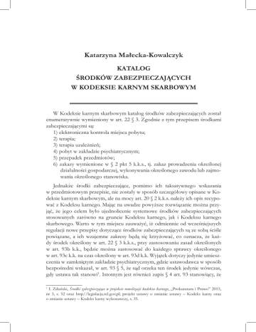 Katarzyna Małecka-Kowalczyk KATALOG ŚRODKÓW ZABEZPIECZAJĄCYCH W KODEKSIE KARNYM SKARBOWYM W Kodeksie karnym skarbowym katalog środków zabezpieczających został enumeratywnie wymieniony w art. 22 § 3. Zgodnie z tym przepisem środkami zabezpieczającymi są: 1) elektroniczna kontrola miejsca pobytu; 2) terapia; 3) terapia uzależnień; 4) pobyt w zakładzie psychiatrycznym; 5) przepadek przedmiotów; 6) zakazy wymienione w § 2 pkt 5 k.k.s., tj. zakaz prowadzenia określonej działalności gospodarczej, wykonywania określonego zawodu lub zajmowania określonego stanowiska. Jednakże środki zabezpieczające, pomimo ich taksatywnego wskazania w przedmiotowym przepisie, nie zostały w sposób szczegółowy opisane w Kodeksie karnym skarbowym, ale na mocy art. 20 § 2 k.k.s. należy ich opis recypować z Kodeksu karnego. Mając na uwadze powyższe rozwiązanie można przyjąć, że jego celem było ujednolicenie systemowe środków zabezpieczających stosowanych zarówno na gruncie Kodeksu karnego, jak i Kodeksu karnego skarbowego. Warto w tym miejscu zauważyć, iż odmiennie od wcześniejszych regulacji nowe przepisy dotyczące środków zabezpieczających są ze sobą ściśle powiązane, a ich wzajemne zakresy będą się krzyżować, co oznacza, że każdy środek określony w art. 22 § 3 k.k.s., przy zastosowaniu zasad określonych w art. 93b k.k., będzie można zastosować do każdego sprawcy określonego w art. 93c k.k. na czas określony w art. 93d k.k. Wyjątek dotyczy jedynie umieszczenia w zamkniętym zakładzie psychiatrycznym, gdzie ustawodawca w sposób bezpośredni wskazał, w art. 93 § 5, że sąd orzeka ten środek jedynie wówczas, gdy ustawa tak stanowi1. Istotnym jest również zapis § 4 art. 93 stanowiący, że I. Zduński, Środki zabezpieczające w projekcie nowelizacji kodeksu karnego, „Prokuratura i Prawo” 2015, nr 3, s. 52 oraz http//legislacja.rcl.gov.pl; projekt ustawy o zmianie ustawy – Kodeks karny oraz o zmianie ustawy – Kodeks karny wykonawczy, s. 35. 1 100 Katarzyna Małecka-Kowalczyk wobec tego samego sprawcy można orzec więcej niż jeden środek karny (również w tym przypadku należy pamiętać o zasadzie współmierności orzekanych środków). Wprowadzenie nowych rozwiązań w zakresie środków zabezpieczających zarówno na gruncie prawa karnego jak i jego niejako odwzorowanie w przepisach Kodeksu karnego skarbowego, a także innych ustaw (w tym tej z dnia 22 listopada 2013 r. o postępowaniu wobec osób z zaburzeniami psychicznymi stwarzającymi zagrożenie życia lub wolności seksualnej innych osób), zdaniem części doktryny może prowadzić do powstania nowej gałęzi prawa – prawa zabezpieczającego, którego główną funkcją będzie zabezpieczenie społeczeństwa przed naruszeniem dóbr prawnych przez osoby z szeroko rozumianym zaburzeniem osobowości2. Zagadnienia ogólne Środek zabezpieczający na gruncie przepisów Kodeksu karnego skarbowego może zostać orzeczony wobec osoby3, która dopuściła się popełnienia przestępstwa skarbowego: − która nie ponosi odpowiedzialności ze względu na niepoczytalność (postępowanie zostało umorzone wobec sprawcy na podstawie art. 11 § 1 k.k.s. z uwagi na niepoczytalność sprawcy); − miała ograniczoną poczytalność określoną w art. 11 § 2 k.k.s.; − poniosła odpowiedzialność za popełnienie przestępstwa w związku z uzależnieniem od alkoholu lub działania podobnego środka. Pozostały krąg podmiotów wskazanych w artykule 93b § 3 i 4 nie będzie miał zastosowania do sprawców przestępstw i wykroczeń skarbowych4. A. Barczak-Oplustii, Charakter środków zabezpieczających w nowelizacji kodeks karnego z 20.02.2015. Wprowadzenie do dyskusji, „Palestra” 2015, nr 7-8/2015, k. 114. 3 Odnotować można również, że ustawodawca posługuje się terminem sprawcy, co zdaniem np. K. Postulskiego oznacza, iż ma on zastosowanie jedynie do grupy podmiotów umieszczonych w art. 18 § 1 k.k. (sprawca pojedynczy, współsprawca, sprawca polecający) i nie może być stosowany do niesprawczych form popełnienia przestępstwa w postaci podżegania i pomocnictwa. Należy podkreślić, że podżegacz i pomocnik popełniają własne przestępstwa i jako postacie zjawiskowe przestępstwa są one zrealizowane (w odróżnieniu od postaci sprawczych w momencie realizacji znamion tych postaci zjawiskowych) w momencie zakończenia nakłania lub udzielania pomocy. K. Postulski, Środki zabezpieczające jako forma reakcji karnej, GSP 2008, nr 1 s. 313, por. również wyrok SA w Białymstoku z dnia 25.06.2002 r. sygn II AKa 112/02 KZS 2002, nr 12, poz. 51. 4 Wartym podkreślenia jest, iż nowe przepisy – odmiennie niż stare – wskazują, że w przypadku sprawców czynów zabronionych popełnionych w stanie całkowitej lub częściowej niepoczytalności, związek czynu z chorobą psychiczną lub umysłową niezbędny jest tylko dla zastosowania środka zabezpieczającego w postaci umieszczenia w zakładzie psychiatrycznym. Zakres zaburzeń został również rozszerzony o zaburzenia osobowości. 2 Katalog środków zabezpieczających w Kodeksie karnym skarbowym 101 Artykuły 93b i 93d k.k. wskazują natomiast na przesłanki i mechanizmy stosowania środków zabezpieczających z wyjątkiem tych, które dotyczą sprawców skazanych na karę 25 lat lub dożywotniego pozbawienia wolności. W tym miejscu wartym podkreślenia jest fakt, iż środek zabezpieczający nie jest karą i nie może być tak traktowany, dlatego jego orzeczenie jest możliwe jedynie wówczas, gdy jest to konieczne, aby zapobiec ponownemu popełnieniu przez sprawcę czynu zabronionego, a inne środki prawne, które mogą zostać orzeczone są niewystarczające. Wyrażona zasada subsydiarności wskazuje, iż sąd powinien rozważyć czy prawdopodobieństwo popełnienia przez sprawcę nowego czynu zabronionego może być zredukowane w drodze leczenia bez orzeczenia środka zabezpieczającego, co oznac