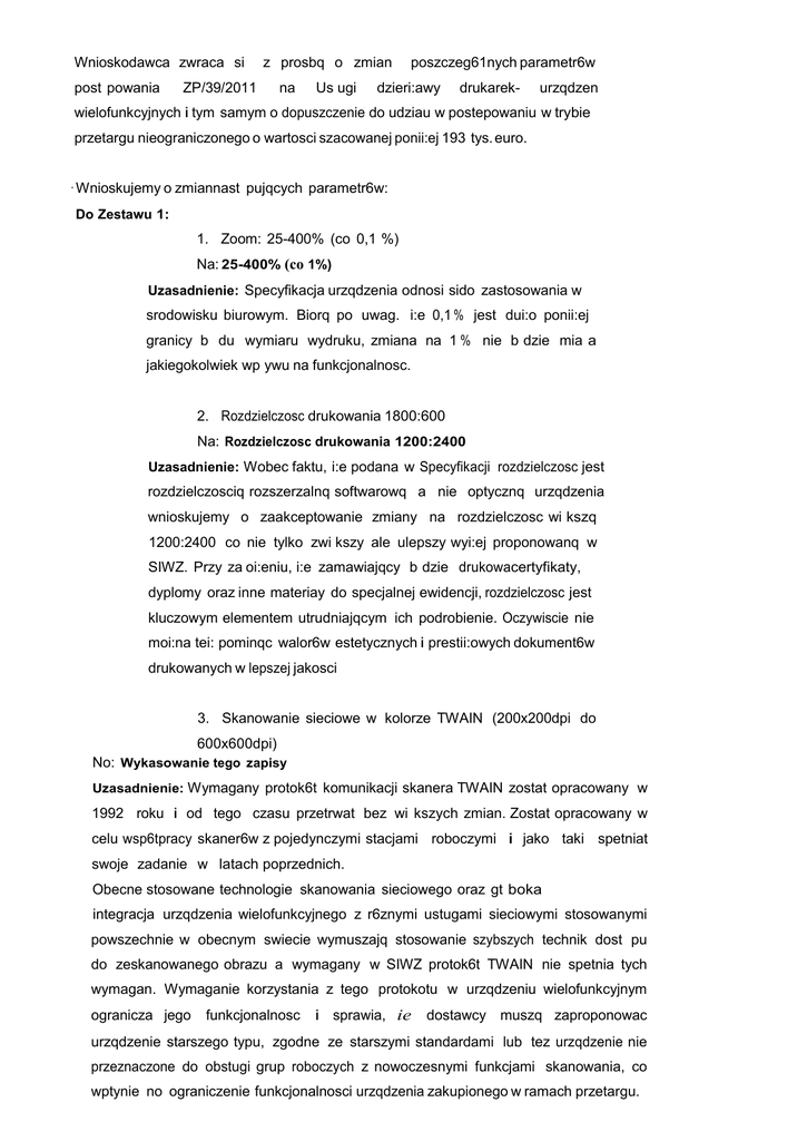 Wnioskodawca zwraca si post powania z prosbq o zmian ZP/39/2011 na Us ugi poszczeg61nych parametr6w dzieri:awy drukarek- urzqdzen wielofunkcyjnych i tym samym o dopuszczenie do udziau w postepowaniu w trybie przetargu nieograniczonego o wartosci szacowanej ponii:ej 193 tys. euro. · Wnioskujemy o zmiannast pujqcych parametr6w: Do Zestawu 1: 1. Zoom: 25-400% (co 0,1 %) Na: 25-400% (co 1%) Uzasadnienie: Specyfikacja urzqdzenia odnosi sido zastosowania w srodowisku biurowym. Biorq po uwag. i:e 0,1 % jest dui:o ponii:ej granicy b du wymiaru wydruku, zmiana na 1 % nie b dzie mia a jakiegokolwiek wp ywu na funkcjonalnosc. 2. Rozdzielczosc drukowania 1800:600 Na: Rozdzielczosc drukowania 1200:2400 Uzasadnienie: Wobec faktu, i:e podana w Specyfikacji rozdzielczosc jest rozdzielczosciq rozszerzalnq softwarowq a nie optycznq urzqdzenia wnioskujemy o zaakceptowanie zmiany na rozdzielczosc wi kszq 1200:2400 co nie tylko zwi kszy ale ulepszy wyi:ej proponowanq w SIWZ. Przy za oi:eniu, i:e zamawiajqcy b dzie drukowacertyfikaty, dyplomy oraz inne materiay do specjalnej ewidencji, rozdzielczosc jest kluczowym elementem utrudniajqcym ich podrobienie. Oczywiscie nie moi:na tei: pominqc walor6w estetycznych i prestii:owych dokument6w drukowanych w lepszej jakosci 3. Skanowanie sieciowe w kolorze TWAIN (200x200dpi do 600x600dpi) No: Wykasowanie tego zapisy Uzasadnienie: Wymagany protok6t komunikacji skanera TWAIN zostat opracowany w 1992 roku i od tego czasu przetrwat bez wi kszych zmian. Zostat opracowany w celu wsp6tpracy skaner6w z pojedynczymi stacjami roboczymi i jako taki spetniat swoje zadanie w latach poprzednich. Obecne stosowane technologie skanowania sieciowego oraz gt boka integracja urzqdzenia wielofunkcyjnego z r6znymi ustugami sieciowymi stosowanymi powszechnie w obecnym swiecie wymuszajq stosowanie szybszych technik dost pu do zeskanowanego obrazu a wymagany w SIWZ protok6t TWAIN nie spetnia tych wymagan. Wymaganie korzystania z tego protokotu w urzqdzeniu wielofunkcyjnym ogranicza jego funkcjonalnosc i sprawia, ie dostawcy muszq zaproponowac urzqdzenie starszego typu, zgodne ze starszymi standardami lub tez urzqdzenie nie przeznaczone do obstugi grup roboczych z nowoczesnymi funkcjami skanowania, co wptynie no ograniczenie funkcjonalnosci urzqdzenia zakupionego w ramach przetargu. W zwiqzku z powyzszym wnosimy o wykreslenie wymagania stosowania protokotu TWAIN w specyfikacji urzqdzenia. Lj. Zasilanie 220- 2Lj00 V 50/60Hz/ 8A No: 220-240 V S0/60Hz/10A Uzasadnienie: Wymagane w SIWZ parametry pracy urzqdzen dotyczqce rzeczywistych pr dkosci druku oraz maksymalnych czas6w nagrzewania i rozpocz cia pracy urzqdzenia wiqzq siz odpowiednio szybkim rozgrzaniem zespotu obrazujqcego urzqdzenia i - co za tym idzie - wymagajq dostarczenia prqdu o odpowiednim chwilowym nat zeniu. Podane w SIWZ wymaganie nat zenia prqdu moze spowodowac, ie zam6wione urzqdzenie nie b dzie w stanie - w rzeczywistych warunkach pracy - zapewnic spetnienia deklarowanych parametr6w pr dkosci i czas6w uruchamiania urzqdzenia i b dzie odbiegac znacznie od tych, uzyskiwanych w warunkach laboratoryjnych a podanych w specyfikacji. Niniejszym, w celu zapewnienia wymaganych w SIWZ parametr6w majqcych scisle wptyw no spos6b dziatania i obstugi urzqdzenia przez uzytkownik6w koncowych wnosimy o zmian wymagania maksymalnego nat zenia prqdu z 8A no 1OA. 5. Automatyczny dwustronny podajnik orygina 6w - Rozmiar papieru A6 - A3 Na: Rozmiar papieru AS- A3 Uzasadnienie: W urzqdzeniach wielofunkcyjnych obs ugujqcych format A3 wymaganie minimalnego rozmiaru A6 nie podnosi funkcjonalnosci, a nawet wp ywa na jego zmniejszenie poniewai: format A6 nie jest stosowany jako standardowy w dokumentacji przeznaczonej do typowo ui:ywanej z automatycznego dwustronnego Do ich obs ugiwania wymagane sq podajnika dokument6w. specjalistyczne rozwiqzania mechaniczne, kt6re powodujq zwi kszenie wsp6kzynnika powstawania usterek i zacic papieru z DADF oraz znaczne skr6cenie parametru MTBF urzqdzenia wielofunkcyjnego. 6. Automatyczny Dwustronny podajnik orygina 6w Gramatura papieru 35-210 g/m jednostronnie Na: 50 -128 g/m jedno i dwustronnie Uzasadnienie: Wymagania minimalne dostosowane do papieru 35 g/m mogq spowodowac uszkodzenia umieszczanych w podajniku DADF. Do Zestawu 2: 1. Zoom: 25-400% (co 0,1 %) Na: 25-400% (co 1%) Uzasadnienie: Specyfikacja urzqdzenia odnosi sido zastosowania w srodowisku biurowym. Biorq po uwag. i:e 0,1 % jest dui:o ponii:ej granicy b du wymiaru wydruku, zmiana na 1 % nie b dzie mia a jakiegokolwiek wpzywu na funkcjonalnosc. 2. Rozdzielczosc drukowania 1800:600 Na: Rozdzielczosc drukowania 1200:1200 Uzasadnienie: Wobec faktu, i:e podana w Specyfikacji rozdzielczosc jest rozdzielczosciq rozszerzalnq softwarowq, a nie optycznq urzqdzenia wnioskujemy zaakceptowanie zmiany o na rozdzielczosc wi kszq 1200:1200 co nie tylko zwi kszy ale ulepszy wyi:ej proponowanq w SIWZ. Przy za oi:eniu, i:e zamawiajqcy b dzie drukowacertyfikaty, dyplomy oraz inne materiay do specjalnej ewidencji, rozdzielczosc jest kluczowym elementem utrudniajqcym ich podrobienie. Oczywiscie nie moi:na tei: pominqc walor6w estetycznych i prestii:owych dokument6w drukowanych w lepszej jakosci 4. Zasilanie 220- 2400 V 50/60Hz/ 8A Na: 220 - 240 V S0/60Hz/1OA Uzasadnienie: Wymagane w SIWZ parametry pracy urzqdzen dotyczqce rzeczywistych pr dkosci druku oraz maksymalnych czas6w nagrzewania i rozpocz cia pracy urzqdzenia wiqi:q siz odpowiednio szybkim rozgrzaniem zespotu obrazujqcego urzqdzenia i - co za tym idzie wymagajq dostarczenia prqdu o odpowiednim chwilowym nat i:eniu. Podane w SIWZ wymaganie nat i:enia prqdu moi:e spowodowac, i:e zam6wione urzqdzenie nie b dzie w stanie - w rzeczywistych warunkach pracy - zapewnic spetnienia deklarowanych parametr6w pr dkosci i czas6w uruchamiania urzqdzenia i b dzie odbiegac znacznie od tych, uzyskiwanych w warunkach laboratoryjnych a podanych w specyfikacji. Niniejszym, w celu zapewnienia wymaganych w SIWZ parametr6w majqcych scisle wptyw 