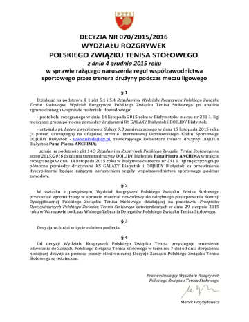 DECYZJA NR 070/2015/2016 WYDZIAŁU ROZGRYWEK POLSKIEGO ZWIĄZKU TENISA STOŁOWEGO z dnia 4 grudnia 2015 roku w sprawie rażącego naruszenia reguł współzawodnictwa sportowego przez trenera drużyny podczas meczu ligowego §1 Działając na podstawie § 1 pkt 5.1 i 5.4 Regulaminu Wydziału Rozgrywek Polskiego Związku Tenisa Stołowego, Wydział Rozgrywek Polskiego Związku Tenisa Stołowego po analizie zgromadzonego w sprawie materiału dowodowego: - protokołu rozegranego w dniu 14 listopada 2015 roku w Białymstoku meczu nr 231 1. ligi mężczyzn grupa północna pomiędzy drużynami KS GALAXY Białystok i DOJLIDY Białystok; - artykułu pt. Łatwe zwycięstwo z Galaxy 7:3 zamieszczonego w dniu 15 listopada 2015 roku (a potem usuniętego) na oficjalnej stronie internetowej Uczniowskiego Klubu Sportowego DOJLIDY Białystok - www.uksdojlidy.pl, zawierającego komentarz trenera drużyny DOJLIDY Białystok Pana Piotra ANCHIMA; uznaje na podstawie pkt 14.3 Regulaminu Rozgrywek Polskiego Związku Tenisa Stołowego na sezon 2015/2016 działania trenera drużyny DOJLIDY Białystok Pana Piotra ANCHIMA w trakcie rozegranego w dniu 14 listopada 2015 roku w Białymstoku meczu nr 231 1. ligi mężczyzn grupa północna pomiędzy drużynami KS GALAXY Białystok i DOJLIDY Białystok za przewinienie dyscyplinarne będące rażącym naruszeniem reguły współzawodnictwa sportowego podczas zawodów. §2 W związku z powyższym, Wydział Rozgrywek Polskiego Związku Tenisa Stołowego przekazuje zgromadzony w sprawie materiał dowodowy do odrębnego postępowania Komisji Dyscyplinarnej Polskiego Związku Tenisa Stołowego działającej na podstawie Przepisów Dyscyplinarnych Polskiego Związku Tenisa Stołowego zatwierdzonych w dniu 29 sierpnia 2015 roku w Warszawie podczas Walnego Zebrania Delegatów Polskiego Związku Tenisa Stołowego. §3 Decyzja wchodzi w życie z dniem podjęcia. §4 Od decyzji Wydziału Rozgrywek Polskiego Związku Tenisa przysługuje wniesienie odwołania do Zarządu Polskiego Związku Tenisa Stołowego w terminie 7 dni od dnia doręczenia niniejszej decyzji za pomocą poczty elektronicznej. Decyzje Zarządu Polskiego Związku Tenisa Stołowego są ostateczne. Przewodniczący Wydziału Rozgrywek Polskiego Związku Tenisa Stołowego Marek Przybyłowicz
