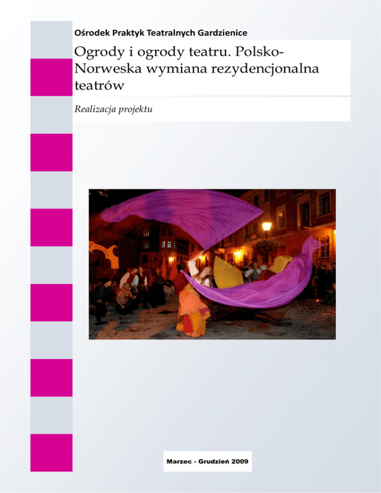 Ośrodek Praktyk Teatralnych Gardzienice Ogrody i ogrody teatru. PolskoNorweska wymiana rezydencjonalna teatrów Realizacja projektu Marzec - Grudzień 2009 OŚRODEK PRAKTYK TEATRALNYCH GARDZIENICE SPIS TREŚCI O Ośrodku 3 Opis projektu 4 Partnerzy projektu 5 Realizacja projektu 6-7 Kontakt 8 Str. 2 OŚRODEK PRAKTYK TEATRALNYCH GARDZIENICE O OŚRODKU PRAKTYK TEATRALNYCH „GARDZIENICE” Ośrodek Praktyk Teatralnych Gardzienice istnieje od 1977 r. Początkowo działał jako stowarzyszenie, zaś w 1990 r. stał sie publiczną instytucją kultury. Ośrodek Praktyk Teatralnych "Gardzienice" to jedna z najbardziej znanych grup teatru eksperymentalnego na świecie. Byli pionierami nowego trendu w teatrze światowym. Dorobek Gardzienic wywarł wielki wpływ na wielu praktyków teatru na całym świecie i był szeroko opisywany w wielu publikacjach. Zespół stał się dobrze rozpoznawalny dzięki swym rygorystycznym badaniom w zakresie rdzennych i antycznych tradycji muzycznych, swym cielesnym i głosowym technikom w pracy aktorskiej, swemu zaangażowaniu w tworzenie teatru w naturalnym środowisku i naciskowi kładzionemu na zasady wzajemności i muzyczności. W ostatnich latach teatr skupia uwagę na Starożytnej Grecji jako źródle europejskiej kultury. Eksploruje się tu zapomniane techniki aktorskie teatru antycznej Grecji, odnosząc się do istniejących ikonograficznych i literackich źródeł, jak też do zabytków muzyki antycznej Grecji oraz do technik cielesnych. Str. 3 OŚRODEK PRAKTYK TEATRALNYCH GARDZIENICE Ogrody i ogrody teatru. Polsko-Norweska wymiana rezydencjonalna teatrów Opis projektu Projekt odwoływał do długoletniej współpracy dwóch teatrów eksperymentalnych: polskiego Ośrodka Praktyk Teatralnych Gardzienice oraz norweskiego zespołu Stella Polaris. Oba wyrosły z poszukiwania inspiracji w kulturach archaicznych i tradycyjnych oraz środowisku naturalnym. Dla obu też ważnym elementem jest edukacja kulturalna. Punktem wyjścia do wspólnego projektu była leżąca u podstaw teatru Gardzienice idea ekologii teatru, relacja między sztuką a środowiskiem naturalnym. W związku z powyższym założono, iż projekt będzie prowadzony w miejscach, w których natura i ogrody stykają się ze sztuką. Rola środowiska naturalnego jako inspiracji i ważnego elementu w teatrze stanowiła przedmiot refleksji specjalistów uczestniczących w zaplanowanych działaniach. Zasadniczym elementem projektu była wzajemna wymiana rezydencji. Przez cztery tygodnie każdy z teatrów gościł w siedzibie Partnera, prezentując ogrody swojej twórczości (spektakle dla szerokiej publiczności) oraz ogrody tradycji kulturalnych, które legły u podstaw inspiracji artystycznych (wystawy, pokazy filmów). Oba teatry prowadziły również w tym czasie intensywną działalność edukacyjną poprzez organizację serii warsztatów. W działaniach projektu wzięli udział nie tylko artyści należący do zespołów obu teatrów. Dzięki warsztatom, sesji naukowej, publicznym prezentacjom i wystawom, krąg odbiorców powiększył się o rzesze animatorów kultury z Polski i Norwegii oraz szeroką publiczność. W projekcie udział wzięło ponad 40 artystów, a zaproponowane wydarzenia artystyczne zobaczyło ponad 3 tysiące widzów. Str. 4 OŚRODEK PRAKTYK TEATRALNYCH GARDZIENICE PARTNERZY PROJEKTU Stella Polaris to najstarsza norweska grupa teatralna należąca do tzw. teatru ulicznego, założona w r. 1985 przez Merete Klingen i Pera Borga (od 2006 r. jest publiczną instytucją kultury). Stella Polaris realizowała projekty artystyczne zainspirowane kulturami mniejszościowymi i archaicznymi (Romowie, lud Sami, Maorysi, kultury afrykańskie, indyjskie, mieszkańcy Bali etc.). Ideą, którą propaguje, jest dzielenie radości ducha i energii płynącej z współdziałania ludzi różnych kultur. Teatr wystawiał przedstawienia na całym świecie. Jest również zaangażowany w projekty edukacyjne. Fot. J. Holcgreber Str. 5 OŚRODEK PRAKTYK TEATRALNYCH GARDZIENICE REALIZACJA PROJEKTU Rezydencja Teatru Gardzienice w Norwegii—wrzesień 202009 (Borre, Fossness, Oslo) 6 września 2009 miało miejsce uroczyste otwarcie rezydencji polskiego teatru Gardzienic w Midgar Historical Centre w Borre-Horten w Norwegii. W trakcie inauguracji przybliżono norweskim widzom cele i działalność Teatr Gardzienice. Zaprezentowano filmy z archiwum Teatru Gardzienice, wystawę multimedialną zdjęć i fotogramów z ponad 30-letniej historii „Gardzienic”. Muzycy i aktorzy teatru wykonali koncert pieśni znajdujących się w repertuarze Gardzienic oraz zaprezentowali sceny z archiwalnych i współczesnych spektakli prezentowanych na deskach Teatru Gardzienice w XX wieku. W celu zaprezentowana szerokiej publiczności bogactwa twórczości polskiego teatru w trakcie pobytu zorganizowano dwa maratony teatralne pod nazwą Kosmos Gardzienic. Na każdy z nich złożyły się prezentacje spektakli z repertuaru Teatru Gardzienice w reżyserii Włodzimierza Staniewskiego: Metamorfozy albo Złoty Osioł, Ifigenia w A…, Electra, jak również spektakl Akademii Praktyk Teatralnych: Ifigenia Cygańska. Spektakle prezentowano zarówno publiczności w Stokke, jak i w Oslo. Spektaklom towarzyszyły wystawy multimedialne oraz filmy z archiwum Gardzienic. W trakcie pobytu polskich artystów w Norwegii odbyły się trzy trzydniowe sesje warsztatowe w siedzibie partnera projektu w Fossnes. Master Classes adresowane były do twórców i entuzjastów teatru, grup teatralnych i studentów. Włodzimierz Staniewski, Mariusz Gołaj i aktorzy Teatru Gardzienice odsłonili powiązania między starożytnymi technikami aktorskimi, a wciąż żywymi rytuałami teatralnymi. Uczyli również techniki aktorskiej i reżyserskiej wypracowanej w ciągu szeregu lat w Gardzienicach. Rezydencja Stella Polaris w Polsce—październik 2009 (Gardzienice, Lublin) Równie barwnie i ciekawie przebiegała wizyta norweskiego teatru Stella Polaris, k
