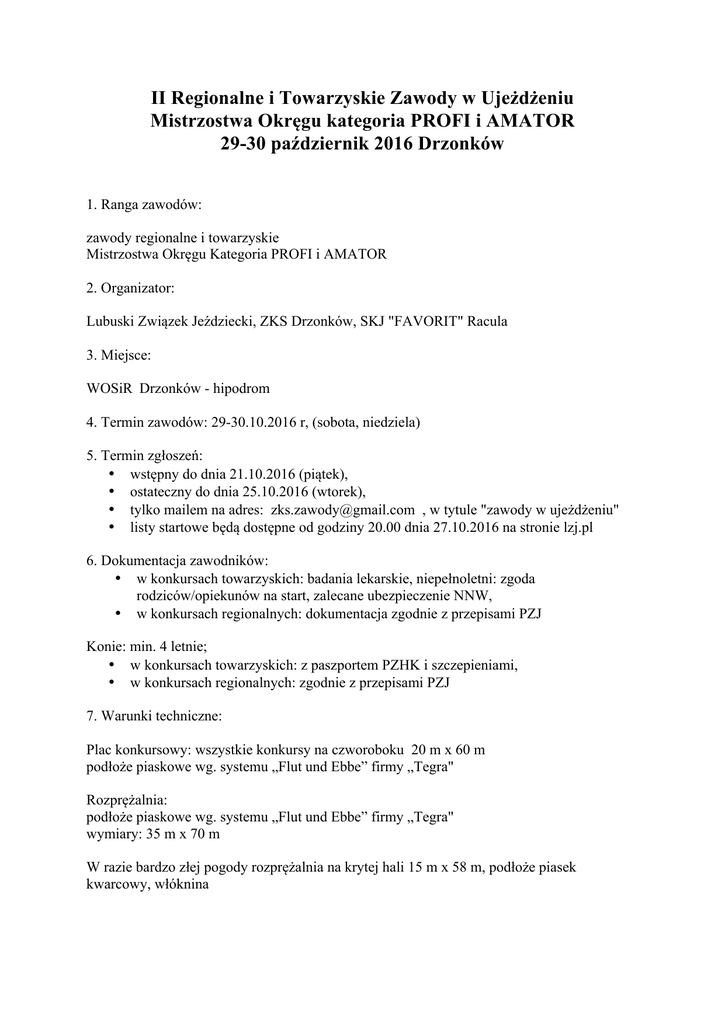 II Regionalne i Towarzyskie Zawody w Ujeżdżeniu Mistrzostwa Okręgu kategoria PROFI i AMATOR 29-30 październik 2016 Drzonków 1. Ranga zawodów: zawody regionalne i towarzyskie Mistrzostwa Okręgu Kategoria PROFI i AMATOR 2. Organizator: Lubuski Związek Jeździecki, ZKS Drzonków, SKJ "FAVORIT" Racula 3. Miejsce: WOSiR Drzonków - hipodrom 4. Termin zawodów: 29-30.10.2016 r, (sobota, niedziela) 5. Termin zgłoszeń: • wstępny do dnia 21.10.2016 (piątek), • ostateczny do dnia 25.10.2016 (wtorek), • tylko mailem na adres: [email protected] , w tytule "zawody w ujeżdżeniu" • listy startowe będą dostępne od godziny 20.00 dnia 27.10.2016 na stronie lzj.pl 6. Dokumentacja zawodników: • w konkursach towarzyskich: badania lekarskie, niepełnoletni: zgoda rodziców/opiekunów na start, zalecane ubezpieczenie NNW, • w konkursach regionalnych: dokumentacja zgodnie z przepisami PZJ Konie: min. 4 letnie; • w konkursach towarzyskich: z paszportem PZHK i szczepieniami, • w konkursach regionalnych: zgodnie z przepisami PZJ 7. Warunki techniczne: Plac konkursowy: wszystkie konkursy na czworoboku 20 m x 60 m podłoże piaskowe wg. systemu „Flut und Ebbe” firmy „Tegra" Rozprężalnia: podłoże piaskowe wg. systemu „Flut und Ebbe” firmy „Tegra" wymiary: 35 m x 70 m W razie bardzo złej pogody rozprężalnia na krytej hali 15 m x 58 m, podłoże piasek kwarcowy, włóknina 8. Uczestnicy: Zawodnicy zrzeszeni w PZJ i WZJ oraz zawodnicy niezrzeszeni 9. Osoby oficjalne: Sędzia Główny: Janusz Lawin Sędzia WZJ: Eliza Skórczyńska Komisarz: Joanna Dykrzak Sekretariat: Ewa Piątkowska Lekarz weterynarii zawodów: Katarzyna Pakulska 10. Dyrektor zawodów: Joanna Dykrzak , tel 500 159 410 11. Program zawodów Regionalnych i Towarzyskich CZWOROBOK ( 20 x 60 ) Piątek: rozprężalnia dostępna od godziny 15.00 do 20.00, czworobok konkursowy od godziny 18.00 do 20.00 (oświetlenie sztuczne). Sobota: (M-mistrzostwa, O-otwarte) Konkurs nr 1 L-1 ZR-M Konkurs nr 2 L-1 ZR-O Konkurs nr 3 P-4 ZR-M Konkurs nr 4 P-4 ZR-O Konkurs nr 5 N-4 ZR-O Konkurs nr 6 C-3 ZR-O Konkurs nr 7 CC-4 ZR-O Konkurs nr 8 L-1 ZT-M Konkurs nr 9 L-1 ZT-O Konkurs nr 10 P-4 ZT-M Konkurs nr 11 P-4 ZT-O Niedziela: (M-mistrzostwa, O-otwarte) Konkurs nr 12 L-3 ZR-M Konkurs nr 13 L-3 ZR-O Konkurs nr 14 P-2 ZR-M Konkurs nr 15 P-2 ZR-O Konkurs nr 16 N-5 ZR-O Konkurs nr 17 C-2 ZR-O Konkurs nr 18 CC-5 ZR-O Konkurs nr 19 L-3 ZT-M Konkurs nr 20 L-3 ZT-O Konkurs nr 21 P-2 ZT-M Konkurs nr 22 P-2 ZT-O • • • • • • • • • • obowiązuje osobna klasyfikacja dla zawodów regionalnych i towarzyskich, w rundzie towarzyskiej mogą startować tylko zawodnicy i/lub konie bez aktualnej licencji na 2016 r na starty w ujeżdżeniu, w rundzie regionalnej tylko zawodnicy i konie z aktualną licencją na 2016 r na starty w ujeżdżeniu, konkursy nie będą dzielone na serie duże konie i kuce, dozwolony jest start 2 zawodników na 1 koniu, przy czym jednocześnie w jednym dniu jeden koń może startować maksymalnie 2 razy, jeśli ta sama para startuje 2 razy w tym samym konkursie, to w rundzie towarzyskiej liczy się przejazd z lepszym wynikiem, w rundzie regionalnej liczy sie pierwszy przejazd bez względu na wynik, (dotyczy konkursów zarówno otwartych i mistrzostw), zawodnicy startujący mistrzostwach PROFI czyli konkursach regionalnych, jeśli chcą startować dwa razy w klasie L lub dwa razy w klasie P, mogą wystartować raz w konkursie mistrzostw i raz w konkursie otwartym, zawodnicy w rundzie towarzyskiej mogą startować w schludnym stroju treningowym, w rundzie regionalnej zgodnie z przepisami PZJ, na życzenie zawodników jest możliwość w ramach tzw. czworoboków otwartych przejechania i oceny programów wkkw lub innych programów ujeżdżeniowych, warunkiem jest dostarczenie danego programu najpóźniej dzień przed zawodami tj. piątek do biura zawodów, a najlepiej przesłać program w zał przy zgłoszeniu na zawody, dla zawodników z Niemiec w razie potrzeby jest możliwość przetłumaczenia konkretnych programów ujeżdżeniowych po wcześniejszym zgłoszeniu zapotrzebowania. 12. Opłaty: tylko startowe rundy Regionalne i Towarzyskie 80 zł / od startu 13. Nagrody: • we wszystkich konkursach otwartych L i P flots dla wszystkich zawodników a dla zwycięzców puchary oraz bony do sklepu wysyłkowego jeździeckiego, • we wszystkich konkursach mistrzowskich L i P w sobotę i w niedzielę flots dla wszystkich zawodników, w niedzielę pierwszych 3 zawodników mistrzostw w kategorii PROFI i AMATOR otrzymuje medale, puchary oraz nagrody rzeczowe, • w pozostałych konkursach N, C, CC w sobotę i w niedzielę flots i nagrody pieniężne dla zwycięzców, Konk. N/R nagrody finansowe – I miejsce 150 zł, II miejsce 130 zł, III miejsce 110 zł Konk. C/R nagrody finansowe – I miejsce 200 zł, II miejsce 170 zł, III miejsce 140 zł Konk. CC/R nagrody finansowe – I miejsce 250 zł, II miejsce 210 zł, III miejsce 170 zł Łączna pula nagród finansowych i rzeczowych we wszystkich konkursach ponad 5.000 zł. Prosimy o precyzyjne podawanie informacji w zgłoszeniu odnośnie startu (zawody regionalne, towarzyskie, mistrzostwa, konkursy otwarte), numer konkursu oraz kontakt telefoniczny. 14. Organizator zapewnia boksy, od piątku od godziny 12.00, opłata 50 zł. /dzień, 80 zł./doba, 160 zł./ dwie doby. Ilość boksów ograniczona. Liczy się kolejność zgłoszeń. Rezerwacja i informacje: tel. 500 159 410 Dykrzak Joanna 15. Organizator zapewnia parking dla koniowozów i przyczep. 16. Na miejscu będzie dostępny poczęstunek dla zawodników (kawa, herbata, coś słodkiego). Jest możliwość wykupienia obiadu lub całego wyżywienia w restauracji na terenie ośrodka. W sobotę odbędzie się w godzinach 20.00-24.00 ognisko integracyjne i zamykające sezon startów otwartych dla "pingwinków" i osób towarzyszących. Hotele : WOSiR Drzonków tel. 68 321 43 41 lub 68 321 43 10, ca.100m Hotelik „P