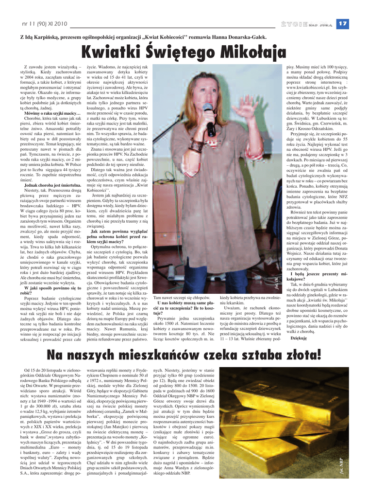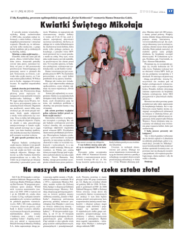 17 nr 11 (90) XI 2010 Z Idą Karpińską, prezesem ogólnopolskiej organizacji ,,Kwiat Kobiecości’’ rozmawia Hanna Donarska-Galek. Z zawodu jestem wizażystką – stylistką. Kiedy zachorowałam w 2004 roku, zaczęłam szukać informacji, a także kobiet, z którymi mogłabym porozmawiać i otrzymać wsparcie. Okazało się, że informacje były tylko medyczne, a grupy kobiet podobnie jak ja dotkniętych tą chorobą, żadnej. Mówimy o raku szyjki macicy… Chorobie, która tak samo jak rak piersi, zbiera wśród kobiet śmiertelne żniwo. Amazonki potrafiły oswoić raka piersi, natomiast kobiety od pasa w dół pozostawały przeźroczyste. Temat krępujący, nie poruszany nawet w pismach dla pań. Tymczasem, na świecie, z powodu raka szyjki macicy, co 2 minuty umiera jedna kobieta. W Polsce jest to liczba sięgająca 44 tysięcy rocznie. To zupełnie niepotrzebna śmierć. Jednak choroba jest śmiertelna. Niestety, tak. Przenoszona drogą płciową przez mężczyzn zarażających swoje partnerki wirusem brodawczaka ludzkiego – HPV. W ciągu całego życia 80 proc. kobiet bywa przynajmniej jeden raz zarażonych tym wirusem. Organizm ma możliwość, nawet kilka razy, zwalczyć go, ale może przyjść moment, kiedy spada odporność, a wtedy wirus uaktywnia się i rozwija. Trwa to kilka lub kilkanaście lat, bez żadnych objawów. Chyba, że chodzi o raka gruczołowego umiejscowionego w kanale szyjki, który potrafi rozwinąć się w ciągu roku i jest dużo bardziej zjadliwy. Ale choroba nie musi być śmiertelna, jeśli zostanie wcześnie wykryta. W jaki sposób powinno się to robić? Poprzez badanie cytologiczne szyjki macicy. Jedynie w ten sposób można wykryć wirusa HPV, ponieważ rak szyjki nie boli i nie daje żadnych objawów. Dlatego skuteczne są tylko badania kontrolne przeprowadzane raz w roku. Powinno się je rozpocząć po inicjacji seksualnej i prowadzić przez całe życie. Wiadomo, że najczęściej rak zaawansowany dotyka kobiety w wieku od 15 do 41 lat, czyli w okresie największej aktywności życiowej i zawodowej. Ale bywa, że atakuje też w wieku kilkudziesięciu lat. Zachorować może kobieta, która miała tylko jednego partnera seksualnego, a ponadto wirus HPV może przenosić się w czasie porodu, z matki na córkę. Przy tym, wirus raka szyjki macicy jest tak maleńki, że prezerwatywa nie chroni przed nim. To wszystko sprawia, że badania cytologiczne, wykonywane systematycznie, są tak bardzo ważne. Znana i stosowana jest już szczepionka przeciw HPV. Na Zachodzie powszechnie, u nas, część kobiet podchodzi do tej sprawy nieufnie. Dlatego tak ważna jest świadomość, czyli odpowiednia edukacja społeczeństwa, czym właśnie zajmuje się nasza organizacja ,,Kwiat Kobiecości’’. Jestem jak najbardziej za szczepieniem. Gdyby ta szczepionka była dostępna wtedy, kiedy byłam dzieckiem, czyli dwadzieścia parę lat temu, nie miałabym problemu z chorobą i nie przeżyła traumy z nią związanej. Jak zatem powinna wyglądać pełna ochrona kobiet przed rakiem szyjki macicy? Optymalna ochrona, to połączenie szczepień z cytologią. Bo, tak jak badanie cytologiczne pozwala wykryć chorobę, tak szczepionka wspomaga odporność organizmu przed wirusem HPV. Przykładem skuteczności profilaktyki jest Szwecja. Obowiązkowe badania cytologiczne i powszechność szczepień sprawiły, że tam notuje się kilka zachorowań w roku i to wcześnie wykrytych i wyleczalnych. A u nas kobiety nadal umierają. Muszę powiedzieć, że Polska jest czarną dziurą na mapie Europy pod względem zachorowalności na raka szyjki macicy. Nawet Rumunia, kraj biedny, stosuje powszechnie szczepienia refundowane przez państwo. fot. IK Kwiatki Świętego Mikołaja Tam nawet szczepi się chłopców. U nas kobiety muszą same płacić za te szczepienia? Ile to kosztuje? Prywatnie jedna szczepionka około 1500 zł. Natomiast leczenie kobiety z zaawansowanym nowotworem kosztuje 80 tys. zł. Nie licząc kosztów społecznych m. in. kiedy kobieta przebywa na zwolnieniu lekarskim. Uważam, że rachunek ekonomiczny jest prosty. Dlatego też nasza organizacja wystosowała petycję do ministra zdrowia z prośbą o refundację szczepień dziewczynek przed inicjacją seksualną tj. w wieku 11 – 13 lat. Właśnie zbieramy pod- pisy. Musimy mieć ich 100 tysięcy, a mamy ponad połowę. Podpisy można składać drogą elektroniczną poprzez stronę internetową : www.kwiatkobiecości.pl. Im szybciej je zbierzemy, tym wcześniej zaczniemy chronić nasze dzieci przed chorobą. Warto jednak zauważyć, że niektóre gminy same podjęły działania, by bezpłatnie szczepić dziewczynki. W Lubuskiem są to: gm. Świdnica, gm. Czerwieńsk, m. Żary i Krosno Odrzańskim. Przyjmuje się, że szczepionki podaje się zwykle kobietom do 55 roku życia. Najlepiej wykonać test na obecność wirusa HPV. Jeśli go nie ma, podajemy szczepionkę w 3 dawkach. Po miesiącu od pierwszej – drugą, a po pół roku – trzecią. Co, oczywiście nie zwalnia pań od badań cytologicznych wykonywanych raz w roku – co powtarzam bez końca. Ponadto, kobiety otrzymują imienne zaproszenia na bezpłatne badania cytologiczne, które NFZ przygotował w placówkach służby zdrowia. Również ten tekst powinny panie potraktować jako takie zaproszenie do bezpłatnego badania. Już w najbliższym czasie będzie można zasięgnąć szczegółowych informacji na miejscu w Zielonej Górze, ponieważ powstaje oddział naszej organizacji, który poprowadzi Donata Wojnicz. Nasze działania tutaj zaczynamy od edukacji oraz tworzenia grup wsparcia kobiet, które już zachorowały. I będą jeszcze prezenty mikołajowe? Tak, w dniu 6 grudnia wybieramy się do dwóch szpitali w Lubuskiem na oddziały ginekologii, gdzie w ramach akcji ,,kwiatki św. Mikołaja’’ nasze koordynatorki będą rozdawać drobne upominki kosmetyczne, co powinno stać się okazją do rozmów z pacjentkami, ich wsparcia psychologicznego, d