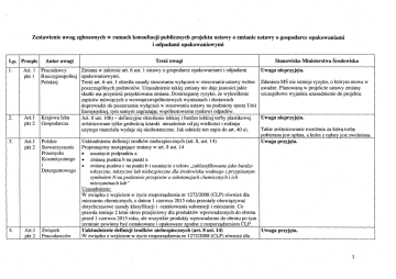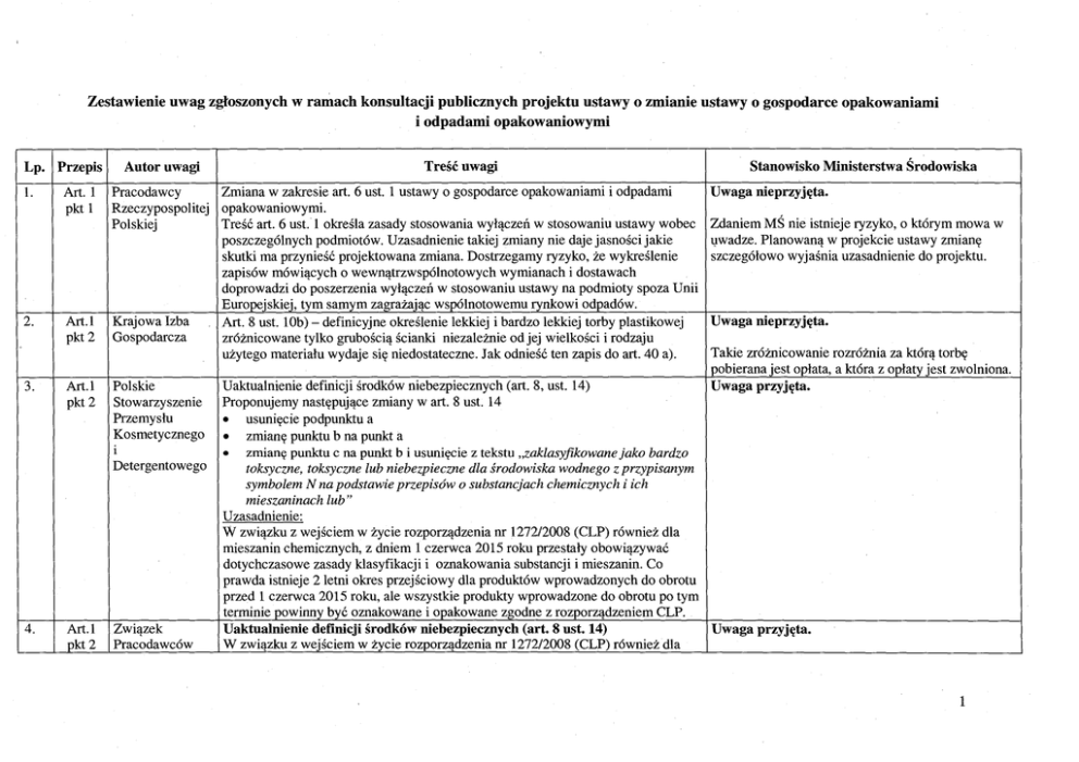 Zestawienie uwag zgłoszonych w ramach konsultacji publicznych projektu ustawy o zmianie ustawy o gospodarce opakowaniami i odpadami opakowaniowymi Lp. Przepis 1. 2. 3. 4. Art. 1 pkt 1 Art.1 pkt 2 Art.1 pkt 2 Art.1 pkt 2 Autor uwagi Treść uwagi Zmiana w zakresie a rt. 6 ust. 1 ustawy o gospodarce opakowaniami i odpadami Pracodawcy Rzeczypospolitej opakowaniowymi. Treść art. 6 ust. 1 określa zasady stosowania wy łączeń w stosowaniu ustawy wobec Polskiej poszczególnych podmiotów. Uzasadnienie takiej zmiany nie daje jasno ści jakie skutki ma przynie ść projektowana zmiana. Dostrzegamy ry zyko, że wykre ślenie zapisów mówiących o wewnątrzwspólnotowych wymianach i dostawach doprowadzi do poszerzenia wy łączeń w stosowaniu ustawy na podmioty spoza Unii Europejskiej, tym samym zagra żaj ąc wspólnotowemu rynkowi odpadów. Krajowa Izba Art. 8 ust. 10b) — definicyjne okre ślenie lekkiej i bardzo lekkiej torby plastikowej Gospodarcza zróżnicowane tylko grubo ścią ścianki niezależnie od jej wielko ści i rodzaju użytego materiału wydaje się niedostateczne. Jak odnie ść ten zapis do a rt. 40 a). Polskie Stowarzyszenie Przemys łu Kosmetycznego i Detergentowego Związek Pracodawców Uaktualnienie definicji środków niebezpiecznych ( art. 8, ust. 14) Proponujemy następuj ące zmiany w a rt. 8 ust. 14 • usunięcie podpunktu a • zmianę punktu b na punkt a • zmianę punktu c na punkt b i usunięcie z tekstu „zaklasyfikowane jako bardzo Stanowisko Ministerstwa Środowiska Uwaga nieprzyj ęta. Zdaniem MŚ nie istnieje ry zyko, o którym mowa w uwadze. Planowan ą w projekcie ustawy zmian ę szczegółowo wyjaśnia uzasadnienie do projektu. Uwaga nieprzyj ęta. Takie zróżnicowanie rozróżnia za którą torbę pobierana jest opłata, a która z op łaty jest zwolniona. Uwaga przyj ęta. toksyczne, toksyczne lub niebezpieczne dla środowiska wodnego z przypisanym symbolem N na podstawie przepisów o substancjach chemicznych i ich mieszaninach lub" Uzasadnienie: W związku z wej ściem w życie rozporządzenia nr 1272/2008 (CLP) równie ż dla mieszanin chemicznych, z dniem 1 czerwca 2015 roku przesta ły obowiązywać dotychczasowe zasady klasyfikacji i oznakowania substancji i mieszanin. Co prawda istnieje 2 letni okres przej ściowy dla produktów wprowadzonych do obrotu przed 1 czerwca 2015 roku, ale wszystkie produkty wprowadzone do obrotu po tym terminie powinny by ć oznakowane i opakowane zgodne z rozporz ądzeniem CLP. Uaktualnienie definicji środków niebezpiecznych (art. 8 ust. 14) W związku z wejściem w życie rozporządzenia nr 1272/2008 (CLP) równie ż dla Uwaga przyj ęta. Przemyslu Opakowań i Produktów w Opakowaniach EKO-PAK 5. 6. 7. Art. 1 pkt 2 lit. b Art. 1 pkt 2 lit. b Art.1 pkt 3 lit. a Polskie Stowarzyszenie Przemyslu Kosmetycznego i Detergentowego COBRO — Instytut Badawczy Opakowań Krajowa Izba Gospodarcza mieszanin chemicznych, z dniem 1 czerwca 2015 r. przesta ły obowiązywać dotychczasowe zasady klasyfikacji i oznakowania substancji i mieszanin. Co prawda istnieje 2 letni okres przej ściowy dla produktów wprowadzonych do obrotu przed 1.06. 2015 roku, ale wszystkie produkty wprowadzone do obrotu po tym terminie powinny by ć zgodne z rozporz ądzeniem CLP. Dlatego wnosimy o: usunięcie podpunktu a) wa rt. 8, pkt 14, • • zmianę punktu b) na punkt a), zmianę punktu c) na punkt b) i usuni ęcie z tekstu „zaklasyfikowane jako bardzo toksyczne, toksyczne lub niebezpieczne dla środowiska wodnego z przypisanym symbolem N na podstawie przepisów o substancjach chemicznych i ich mieszaninach tub". Zmiana w a rt. 1 punkt 2b) odnoszącym się do art. 6 obecnej ustawy Proponujemy w 2 ostatnich wierszach p. 10_a) „g łówny strukturalny składnik" zmienić na „główny materiał", aby zapis był spójny z p. 101b), w którym mowa jest o materiale toreb. Prawidłowa nazwa użytej jednostki długości brzmi mikrometr. Chciałbym zwrócić uwagę na błędne używanie terminu "plastik" w ww projekcie. Słowo plastik jest bezpo średnim przekładem z angielskiego plastic, jednak zarówno w t łumaczeniach fachowych jak i dyrektywie tworzywowej słowo to powinno być i jest tłumaczone jako „tworzywo". Plastik jest jedynie s łowem używanym potocznie dlatego zach ęcamy do posługiwania się zwrotem "tworzywo" jako terminem stosowanym od lat w ogólnie przyj ętej terminologii. Proponuje się nadać brzmienie a rt. 17. ust. 4 na: „4. Organizacja odzysku opakowa ń przejmuje za op łatą obowiązek wprowadzaj ącego produkty w opakowaniach na podstawie zawa rtej z nim w formie pisemnej pod rygorem niewa żności umowy, w odniesieniu do calej masy opakowa ń jednego lub kilku rodzajów, jakie wprowadzaj ący produkty w opakowaniach wprowadził do obrotu w d an ym roku kalendarzowym." oraz dodać ust. 4a i 4b w brzmieniu: „4a. Opłaty pobierane przez organizacje odzysku od przedsi ębiorców wprowadzaj ących za przej ęcie obowiązku w odniesieniu do okre ślonego w przepisach prawa rodzaju i masy opakowa ń powinny pokrywać pełne koszty Uwaga częściowo przyj ęta. Termin „mikrometr" został przyj ęty. Uwaga przyj ęta. . Termin „plastik" zostanie zamieniony terminem ,,tworzywo sztuczne". Uwaga nieprzyj ęta. Określanie tych kosztów przez organizacje odzysku opakowań mogłoby powodować ich zawyżanie, co prowadziłoby do zwiększenia zysków organizacji, a nie faktycznego przekazywanie tych środków na selektywną zbiórkę. 2 . 8. Art. 1 Polskie dotyczące zbiórki selektywnej, sortowania, transpo rtu i przetwarzania okre ślonych odpadów opakowaniowych, jak również koszty zapewnienia odpowiednich informacji konsumentom w zakresie prawidłowego postępowania z odpadami opakowaniowymi oraz koszty publicznych kampanii edukacyjnych, o których mowa w art. 19." „4b. Organizacja odzysku jest obowi ązana posiadać kalkulacj ę kosztów składowych pobieranej od przedsi ębiorców wprowadzaj ących opłaty 