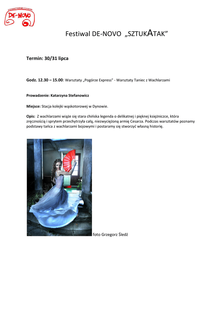 Festiwal DE-NOVO „SZTUKATAK” Termin: 30/31 lipca Godz. 12.30 – 15.00: Warsztaty „Pogórze Express” - Warsztaty Taniec z Wachlarzami Prowadzenie: Katarzyna Stefanowicz Miejsce: Stacja kolejki wąskotorowej w Dynowie. Opis: Z wachlarzami wiąże się stara chioska legenda o delikatnej i pięknej księżniczce, która zręcznością i sprytem przechytrzyła całą, niezwyciężoną armię Cesarza. Podczas warsztatów poznamy podstawy taoca z wachlarzami bojowymi i postaramy się stworzyd własną historię. foto Grzegorz Śledź Termin: 31 lipca (niedziela) Godz. 19.00 KONCERT ZESPOŁU KORJEN Skład: Aida Mujačic – vocal, klawisze Světlana Sarkisjanova – vocal, klawisze Ewa Žurakowska – vocal Marek Novak– gitara akustyczna Honza Šikl – perkusja, klawisze Milan Mikšicek – gitara basowa Miejsce: Stacja kolejki wąskotorowej w Dynowie. Opis: KORJEN to grupa muzyczna, której członkowie poszukują własnych korzeni poprzez inspiracje muzyką tradycyjną. „Muzyka, którą gramy jest fuzją motywów z Bułgarii, Bośni, Serbii, Armenii, Słowacji, Skandynawii i Polski. Filtrujemy to, co w muzyce tradycyjnej fascynujące przez własną wrażliwośd muzyczną, nadając kompozycjom współczesne naszemu pokoleniu brzmienie. Estetyka, w której się poruszamy to pogranicze folku, rocka i jazzu. Wokalna – żeoska częśd zespołu to głosy pochodzące z Bośni, Słowacji i Polski; instrumentalna – męska to czeski band: gitara, bas, klawisze, perkusja. Spotkaliśmy się w sercu Środkowej Europy, w czeskiej Pradze; stąd podróżujemy – muzycznie i dosłownie w różne zakątki Europy, które przybliżamy podczas koncertów publiczności”. www.denovo.net.pl