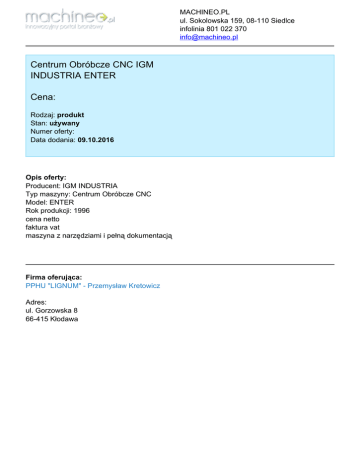 MACHINEO.PL ul. Sokolowska 159, 08-110 Siedlce infolinia 801 022 370 [email protected] Centrum Obróbcze CNC IGM INDUSTRIA ENTER Cena: Rodzaj: produkt Stan: używany Numer oferty: Data dodania: 09.10.2016 Opis oferty: Producent: IGM INDUSTRIA Typ maszyny: Centrum Obróbcze CNC Model: ENTER Rok produkcji: 1996 cena netto faktura vat maszyna z narzędziami i pełną dokumentacją Firma oferująca: PPHU "LIGNUM" - Przemysław Kretowicz Adres: ul. Gorzowska 8 66-415 Kłodawa