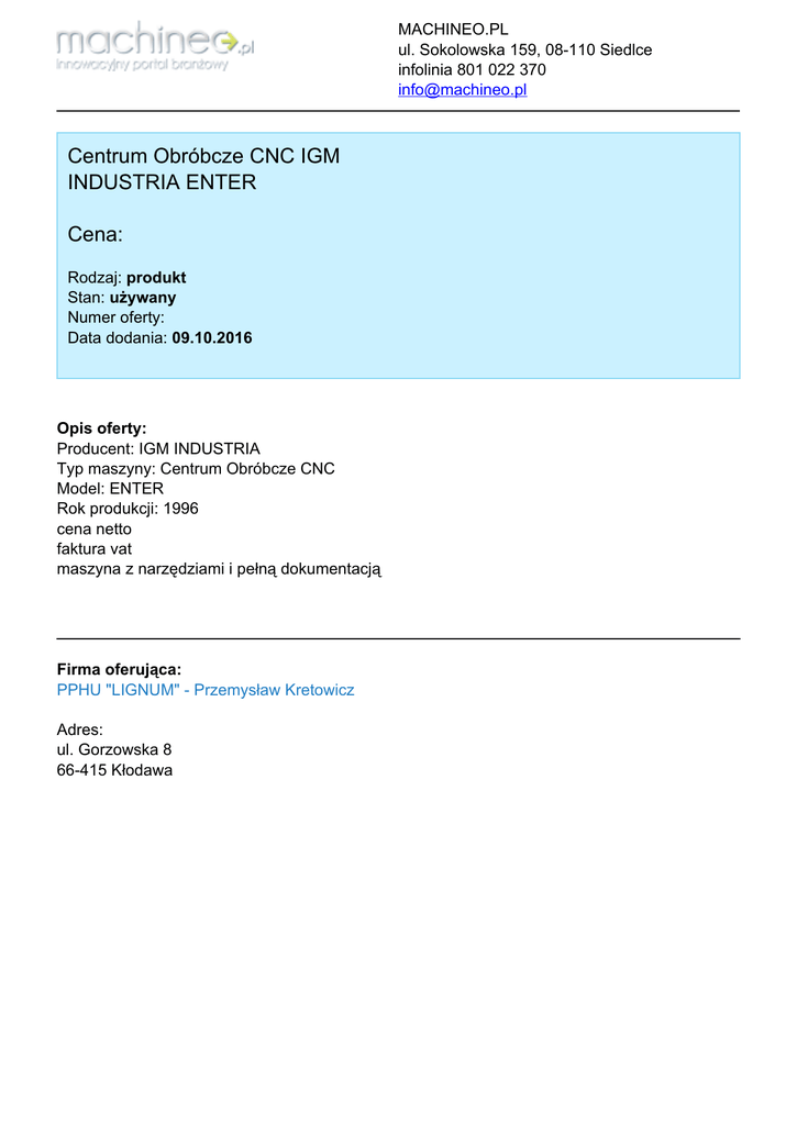 Centrum Obróbcze CNC IGM INDUSTRIA ENTER Cena