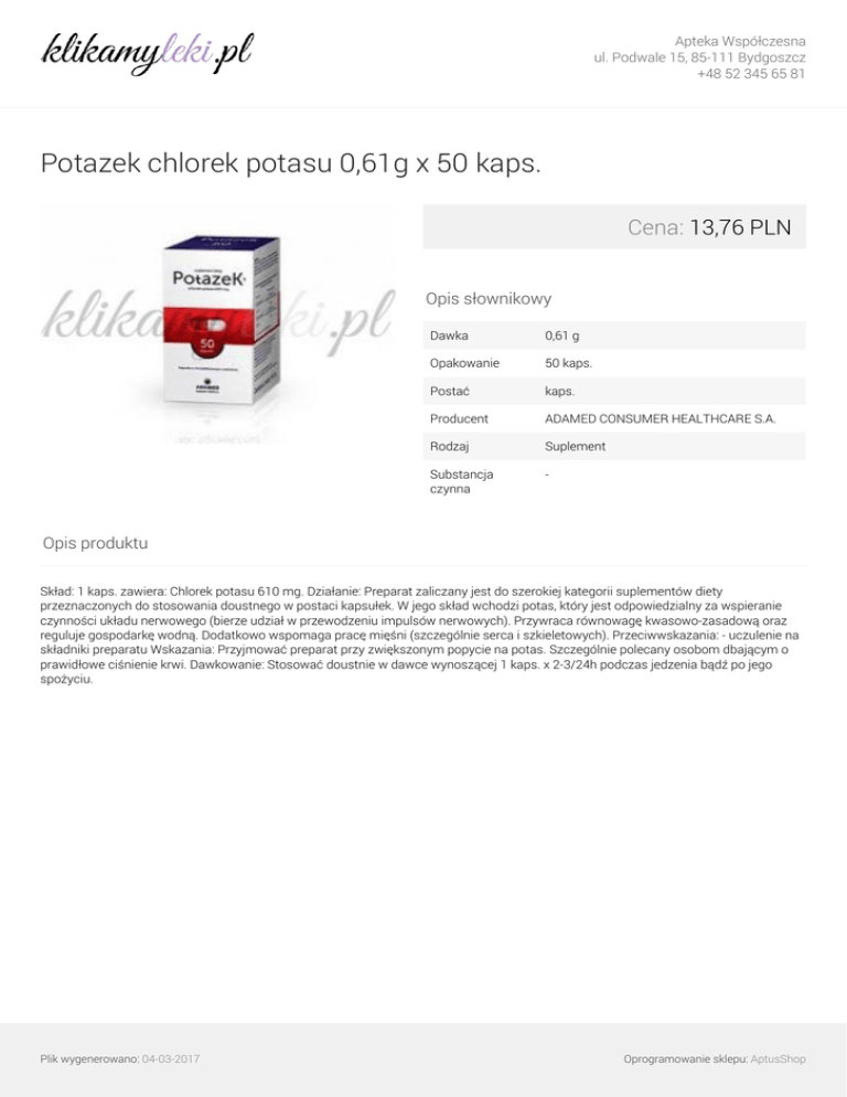 Apteka Współczesna ul. Podwale 15, 85-111 Bydgoszcz +48 52 345 65 81 Potazek chlorek potasu 0,61g x 50 kaps. Cena: 13,76 PLN Opis słownikowy Dawka 0,61 g Opakowanie 50 kaps. Postać kaps. Producent ADAMED CONSUMER HEALTHCARE S.A. Rodzaj Suplement Substancja czynna - Opis produktu Skład: 1 kaps. zawiera: Chlorek potasu 610 mg. Działanie: Preparat zaliczany jest do szerokiej kategorii suplementów diety przeznaczonych do stosowania doustnego w postaci kapsułek. W jego skład wchodzi potas, który jest odpowiedzialny za wspieranie czynności układu nerwowego (bierze udział w przewodzeniu impulsów nerwowych). Przywraca równowagę kwasowo-zasadową oraz reguluje gospodarkę wodną. Dodatkowo wspomaga pracę mięśni (szczególnie serca i szkieletowych). Przeciwwskazania: - uczulenie na składniki preparatu Wskazania: Przyjmować preparat przy zwiększonym popycie na potas. Szczególnie polecany osobom dbającym o prawidłowe ciśnienie krwi. Dawkowanie: Stosować doustnie w dawce wynoszącej 1 kaps. x 2-3/24h podczas jedzenia bądź po jego spożyciu. Plik wygenerowano: 04-03-2017 Powered by TCPDF (www.tcpdf.org) Oprogramowanie sklepu: AptusShop