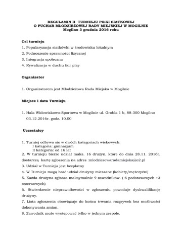 REGULAMIN II TURNIEJU PIŁKI SIATKOWEJ O PUCHAR MŁODZIEŻOWEJ RADY MIEJSKIEJ W MOGILNIE Mogilno 3 grudnia 2016 roku Cel turnieju 1. Popularyzacja siatkówki w środowisku lokalnym 2. Podnoszenie sprawności fizycznej 3. Integracja społeczna 4. Rywalizacja w duchu fair play Organizator 1. Organizatorem jest Młodzieżowa Rada Miejska w Mogilnie Miejsce i data Turnieju 1. Hala Widowiskowo-Sportowa w Mogilnie ul. Grobla 1 b, 88-300 Mogilno 03.12.2016r. godz. 10.00 Uczestnicy 1. Turniej odbywa się w dwóch kategoriach wiekowych: I kategoria: gimnazjum II kategoria: od 16 lat 2. W turnieju bierze udział maks. 16 drużyn, które do dnia 28.11. 2016r. dostarczą kartę zgłoszenia na adres :[email protected] 3. Udział w Turnieju jest bezpłatny 4. W Turnieju mogą brać udział drużyny mieszane (kobiety/mężczyźni) 5. Każda drużyna zgłasza maksymalnie 9 zawodników. ( 6 podstawowych +3 rezerwowych) 6. Stwierdzenie nieprawidłowości w zgłoszeniu powoduje dyskwalifikację drużyny. 7. Lista zgłoszenia obowiązuje do końca trwania rozgrywek bez możliwości dokonywania zmian. 8. Zawodnik może występować tylko w jednym zespole. 9. Zawodnicy zobowiązani są do posiadania stroju sportowego (koszulka, spodenki, nie muszą być jednolite) oraz obuwia sportowego. 10. Zawodnicy biorą udział w turnieju na własną odpowiedzialność. Ubezpieczenie 1. Organizatorzy zapewniają obsługę medyczną, oraz dodatkowe ubezpieczenie. Przepisy gry 1. Uczestnicy biorący udział w zawodach zostaną podzieleni na cztery grupy ( po 4 zespoły) 2. W eliminacjach grupowych mecze zostaną rozegrane systemem każdy z każdym. 3. Drużyny które zajmą I i II miejsce w grupach grają na „krzyż” o wejście do finału. 4. Mecze będą rozgrywane do dwóch wygranych setów, do 15 punktów 5. Za zwycięstwo drużyna otrzymuje: a) w stosunku 2:0 drużyna wygrana otrzymuję 3 pkt., przegrana 0 pkt. b) w stosunku 2:1 drużyna wygrana otrzymuję 2 pkt., przegrana 1 pkt. 6. System rozgrywek może ulec zmianie w zależności od ilości zgłoszonych drużyn. Nagrody 1. Puchary za zajęcie pierwszego, drugiego i trzeciego miejsca. 2. Dyplomy dla wszystkich drużyn. Postanowienia końcowe: 1. W sprawach nie ujętych w regulaminie decydować będzie Organizator imprezy po zasięgnięciu opinii sędziów 2. Organizator zabezpiecza boisko oraz piłki do rozgrywania meczów 3. Organizator nie zapewnia piłek na rozgrzewkę 4. Organizator zapewnia obsługę sędziowską 5. Za rzeczy pozostawione bez opieki lub zaginione organizator nie odpowiada 6. Organizator nie ponosi odpowiedzialności za ewentualne kontuzje powstałe w czasie turnieju 7. Udział w Turnieju jest jednoznaczny z akceptacją Regulaminu 8. Organizator zastrzega sobie prawo dokonywania zmian oraz ostatecznej interpretacji regulaminu
