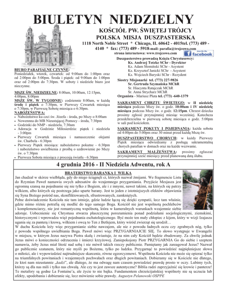 BIULETYN NIEDZIELNY KOĝCIÓà PW. ĝWIĉTEJ TRÓJCY POLSKA MISJA DUSZPASTERSKA 1118 North Noble Street * Chicago, IL 60642 - 4015tel. (773) 489 4140 * fax: (773) 489 - 5918-mail: [email protected] BIURO PARAFIALNE CZYNNE: Poniedziaáek, wtorek, czwartek: od 9:00am do 1:00pm oraz od 2:00pm do 5:00pm. ĝroda i piątek: od 9:00am do 1:00pm oraz od 2:00pm do 7:30pm. W soboty i niedziele biuro jest nieczynne. MSZE ĝW. NIEDZIELNE: 8:00am, 10:00am, 12:15pm, 4:00pm, 8:00pm MSZE ĝW. W TYGODNIU: codziennie 8:00am, w kaĪdą ĞrodĊ i piątek o 7:30pm, w Pierwszy Czwartek miesiąca o 7:30pm, w Pierwszą SobotĊ miesiąca o 6:30pm. NABOĩEēSTWA: • NaboĪeĔstwo ku czci Ğw. Józefa - Ğroda, po Mszy o 8:00am • Nowennna do MB Nieustającej Pomocy - Ğroda, 7:30pm • Godzinki do NMP - niedziela, 7:30am • Adoracja w Godzinie Miáosierdzia: piątek i niedziela - 3:00pm • Pierwszy Czwartek miesiąca i namaszczenie olejami Ğw. Charbela - 6:30pm • Pierwszy Piątek miesiąca: naboĪeĔstwo pokutne - 6:30pm i naboĪeĔstwo uwielbienia z proĞbą o uzdrowienie po Mszy Ğw. o 7:30pm • Pierwsza Sobota miesiąca z procesją Ğwiatáa - 6:30pm strona internetowa: www.trojcowo.com Duszpasterstwo prowadzą KsiĊĪa Chrystusowcy: Ks. Andrzej Totzke SChr - Dyrektor Ks. Adam SáomiĔski SChr - Asystent Ks. Krzysztof Janicki SChr - Asystent Ks. Wojciech Baryski SChr - Rezydent Siostry Misjonarki tel. (773) 227-9826 Sr. Gertruda SzymaĔska MChR Sr. Hiacynta Ratajczak MChR Sr. Anna Strycharz MChR Organista - Mariusz Pluta tel. (773) -640-1379 SAKRAMENT CHRZTU ĝWIĉTEGO: w II niedzielĊ miesiąca podczas Mszy Ğw. o godz. 10:00am i IV niedzielĊ miesiąca podczas Mszy Ğw. o godz. 12:15pm. Chrzest dziecka prosimy zgáosiü przynajmniej miesiąc wczeĞniej. Katecheza przedchrzcielna w pierwszą sobotĊ miesiąca o godz. 5:00pm w sali pod koĞcioáem. SAKRAMENT POKUTY I POJEDNANIA: kaĪda sobota od 4:00pm do 5:00pm oraz 30 minut przed kaĪdą Mszą Ğw. DUSZPASTERSTWO CHORYCH: w kaĪdy Pierwszy Piątek miesiąca odwiedzamy z posáugą sakramentalną chorych parafian w domach oraz na kaĪde wezwanie. SAKRAMENT MAàĩEēSTWA: prosimy zgáaszaü przynajmniej szeĞü miesiĊcy przed planowaną datą Ğlubu. 4 grudnia 2016 - II Niedziela Adwentu, rok A BRATERSTWO BARANKA I WILKA Jan chadzaá w skórze wielbáąda, gdy do niego ĞciągnĊli ci, których nazwaá Īmijami. We fragmencie Listu do Rzymian Paweá namawia swych adresatów do wzajemnego przygarniania. PrzyjĞcie Mesjasza jest ogromną szansą na pojednanie siĊ nie tylko z Bogiem, ale i z innymi, nawet takimi, na których siĊ patrzy wilkiem, albo których siĊ postrzega jako uparte barany. Jest to jeden z istotniejszych efektów objawienia siĊ Syna BoĪego poĞród nas, skonfliktowanych, sfrustrowanych, zamkniĊtych. Peáne doĞwiadczenie KoĞcioáa nie tam istnieje, gdzie ludzie áączą siĊ dziĊki sympatii, lecz tam wáaĞnie, gdzie mimo róĪnic potrafią siĊ modliü do tego samego Boga. KoĞcióá nie jest wspólnotą pochlebców i komplemenciarzy, nie jest romantyczną wspólnotą, która w kameralnych warunkach wzajemnie siebie adoruje. Uobecnienie siĊ Chrystusa stwarza páaszczyznĊ porozumienia ponad podziaáami socjologicznymi, ziemskimi, historycznymi i wprowadza wiĊĨ pojednania eschatologicznego. Byü moĪe ten maáy cháopiec z kijem, który w wizji Izajasza ugania siĊ za panterą i krową, wilkiem i owcą to Ten z Betlejem, który wĞród zwierząt siĊ urodziá… W duchu KoĞcioáa leĪy wiĊc przygarnianie siebie nawzajem, ale nie z powodu áadnych oczu czy zgrabnych nóg, tylko z powodu wspólnego uwielbiania Boga. Paweá mówi wiĊc PRZYGARNIAJCIE SIĉ. To sáowo wystĊpuje w Ewangelii w miejscu, w którym Jezus nazywa Piotra skaáą i zwiastuje, Īe na nim caáy KoĞcióá bĊdzie zbudowany. Za chwilĊ jednak Jezus mówi o koniecznoĞci odrzucenia i Ğmierci krzyĪowej. Zaniepokojony Piotr PRZYGARNIA Go do siebie i szeptem namawia, Īeby Jezus miaá litoĞü nad sobą i nie mówiá takich rzeczy publicznie. PamiĊtamy jak zareagowaá Jezus? Nazwaá go publicznie szatanem, który nie myĞli po BoĪemu, tylko po ludzku. Przygarnąü to powiedzieü najpiĊkniejsze sáowa o miáoĞci, ale i wypowiedzieü najtrudniejsze skarcenie, równe egzorcyzmowi. Wspólnota KoĞcioáa nie moĪe siĊ opieraü tylko na triumfalnych powitaniach i wzajemnych pochwaáach oraz dáugich powitaniach. Dobieramy siĊ w KoĞciele nie dlatego, Īe ktoĞ nam nieustannie „kadzi”, ale dlatego, Īe ma odwagĊ nam czasem powiedzieü prawdĊ prosto w oczy. Lubimy tych, którzy są dla nas mili i tylko nas chwalą. Ale czy to jest zawsze autentyczne? Biblia radzi zaprzyjaĨniü siĊ krowie i panterze! Te metafory są godne La Fontaine’a, ale Īycie to nie bajka. Fundamentem chrzeĞcijaĔskiej wspólnoty nie są uczucia lub afekty, upodobania i dobieranie siĊ, lecz mówienie sobie prawdy. Augustyn Pelanowski OSPPE NAJLEPSZY SPOSÓB NA PRZEĩYCIE ADWENTU Zapraszamy na RORATY od poniedziaáku do piątku o godz. 7:30pm • Roraty w j. áaciĔskim w czwartki, • Roraty dla dzieci z lampionami we wtorki, a w sobotĊ godz. 8:00am • Rotaty dla máodzieĪy w piątki. ADWENTOWE NIESZPORY NIEDZIELNE W okresie Adwentu zapraszamy na tradycyjne Adwentowe Nieszpory Niedzielne na godz. 3:30pm. SIANKO NA STÓà WIGILIJNY Dzisiaj po kaĪdej Mszy Ğw. máodzieĪ bĊdzie rozprowadzaáa sianko na stóá wigilijny. Dochód przeznaczone jest na wspólnotĊ máodzieĪową. Bóg zapáaü za ofiary! ĝWIĉTY MIKOàAJ Dzisiaj zapraszamy rodziców z dzieümi na MszĊ Ğw. na godz. 12:15pm, a nastĊpnie na spotkanie ze Ğw. Mikoáajem. OBIAD LAJKONIKA I ĝWIĄTECZNE STROIKI Dzisiaj tancerze i rodzice ZPiT Lajkonik zapraszają na pyszny obiad. Jak co roku, tancerze i rodzice ZPiT Lajkonik wykonają teĪ Ğwiąteczne stroki, które bĊdą rozprowadzane 10, 11, 17 i 18 grudnia w sali pod koĞcioáem. MoĪna skáadaü zamówienia na stroiki - kontakt: 773 412 4539. Cena stroików: 