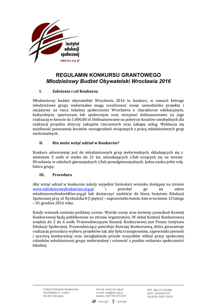 REGULAMIN KONKURSU GRANTOWEGO Młodzieżowy Budżet Obywatelski Wrocławia 2016 I. Założenia i cel Konkursu Młodzieżowy budżet obywatelski Wrocławia 2016 to konkurs, w ramach którego młodzieżowe grupy nieformalne mogą zrealizować swoje samodzielne projekty i inicjatywy na rzecz lokalnej społeczności Wrocławia o charakterze edukacyjnym, kulturalnym, sportowym lub społecznym oraz otrzymać dofinansowanie na jego realizację w kwocie do 1.000,00 zł. Dofinansowanie na pokrycie kosztów niezbędnych dla realizacji projektu dotyczy zakupów rzeczowych oraz zakupu usług. Wyklucza się możliwość ponoszenia kosztów wynagrodzeń związanych z pracą młodzieżowych grup nieformalnych. II. Kto może wziąć udział w Konkursie? Konkurs adresowany jest do młodzieżowych grup nieformalnych, składających się z minimum 3 osób w wieku do 21 lat, mieszkających i/lub uczących się na terenie Wrocławia w szkołach gimnazjalnych i/lub ponadgimnazjalnych. Jedna osoba pełni rolę lidera grupy. III. Procedura Aby wziąć udział w konkursie należy wypełnić formularz wniosku dostępny na stronie www.mlodziezowybudzet.ies.org.pl i przesłać go na adres [email protected] lub dostarczyć osobiście do biura Instytutu Edukacji Społecznej przy ul. Rychtalska 8 (I piętro) – naprzeciwko hotelu Ami w terminie 15 lutego – 01 grudnia 2016 roku. Każdy wniosek zostanie poddany ocenie. Wyniki oceny oraz terminy posiedzeń Komisji Konkursowej będą publikowane na stronie organizatora. W skład Komisji Konkursowej wejdzie do 3 do 6 osób. Przewodniczącym Komisji Konkursowej jest Prezes Instytutu Edukacji Społecznej. Przewodniczący powołuje Komisję Konkursową, która gwarantuje realizację procedury wyboru projektów tak aby była transparentna, zapewniała jawność i uczciwą konkurencję oraz uwzględniała przede wszystkim wkład pracy społecznej członków młodzieżowej grupy nieformalnej i celowość z punktu widzenia społeczności lokalnej. Komisja wybierze te projekty, które w najwyższym stopniu spełnią następujące kryteria: 1. odpowiadają na jasno zdefiniowaną we wniosku potrzebę; 2. zakładają działania adekwatne do opisanej potrzeby, właściwy do założeń projektu harmonogram działań oraz wymierne rezultaty; 3. zakładają atrakcyjne działania i różnorodny sposób komunikowania o planowanych działaniach; 4. jasno i w sposób wymierny przedstawiają planowane korzyści, jakie w efekcie realizacji projektu odniosą jego bezpośredni uczestnicy, a także sami realizatorzy; 5. mają budżet adekwatny do zaplanowanych działań. Komisja ma prawo przyznać dofinansowanie w pełnej lub niepełnej wnioskowanej kwocie. W przypadku pozytywnej oceny Komisji Konkursowej, wnioskodawcy będą zapraszani do podpisania kontraktu z Instytutem Edukacji Społecznej dotyczącego zakresu obowiązków obu stron w ramach Konkursu. Łączna pula przeznaczona na wsparcie projektów w 2016 roku wynosi 40.000,00zł. IV. Dodatkowe informacje na temat konkursu Dodatkowych informacji na temat konkursu Młodzieżowy Budżet Obywatelski Wrocławia 2016 udziela: Damian Fedorczuk Koordynator Projektu +48 726 307 208 [email protected] V. Załączniki do Regulaminu Konkursu Grantowego Załącznikami do regulaminu są: - wzor formularza wniosku - wzor Kontraktu - wzor sprawozdania z realizacji projektu Projekt wspołfinansowany ze srodkow Gminy Wrocław www.wroclaw.pl