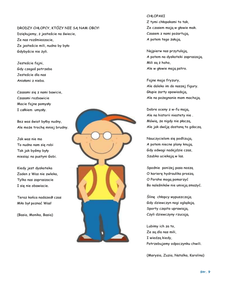 CHŁOPAKI Z tymi chłopakami to tak, DRODZY CHŁOPCY, KTÓZY NIE SĄ NAM OBCY! śe czasem mają w głowie mak. Dziękujemy, Ŝ jesteście na świecie, Czasem z nami poŜartują, śe nas rozśmieszacie, A potem tego Ŝałują. śe jesteście mili, nudno by było Gdybyście nie Ŝyli. Najpierw nas przytulają, A potem na dyskoteki zapraszają. Jesteście fajni, Mili są Ŝ hoho, Gdy czegoś potrzeba Ale w głowie mają pstro. Jesteście dla nas Aniołami z nieba. Fajne maja fryzury, Ale daleko im do naszej figury. Czasami się z nami bawicie, Głupie Ŝarty opowiadają, Czasami rozbawicie Ale na poŜegnanie mam machają. Macie fajne pomysły I całkiem umysły. Dobre oceny z w-fu mają, Ale na historii niestety nie . Bez was świat byłby nudny, Mówią, Ŝe nigdy nie płaczą, Ale moŜe trochę mniej brudny. Ale jak dwóję dostaną to gdaczą. Jak was nie ma Nauczycielom się podlizują, To nudno nam się robi A potem niecne plany knują. Tak jak byśmy były Gdy odwagi nadejdzie czas, miesiąc na pustyni Gobi. Szubko uciekają w las. Kiedy jest dyskoteka Spodnie poniŜej pasa noszą śaden z Was nie zwleka, O karierę hydraulika proszą. Tylko nas zapraszacie O Porshe mogą pomarzyć I się nie obawiacie. Bo naleśników nie umieją smaŜyć. Teraz końca nadszedł czas Ślinę chłopcy wypuszczają Miło był poznać Was! Gdy dziewczyn nogi oglądają. Sporty często uprawiają, (Basia, Monika, Basia) Czyli dziewczyny rzucają. Lubimy ich za to, śe są dla nas mili, I wiedzą kiedy, Potrzebujemy odpoczynku chwili. (Marysia, Zuzia, Natalka, Karolina) Str. 9