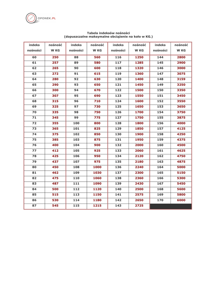 Tabela indeksów nośności opon - OPONEK 11.06.011