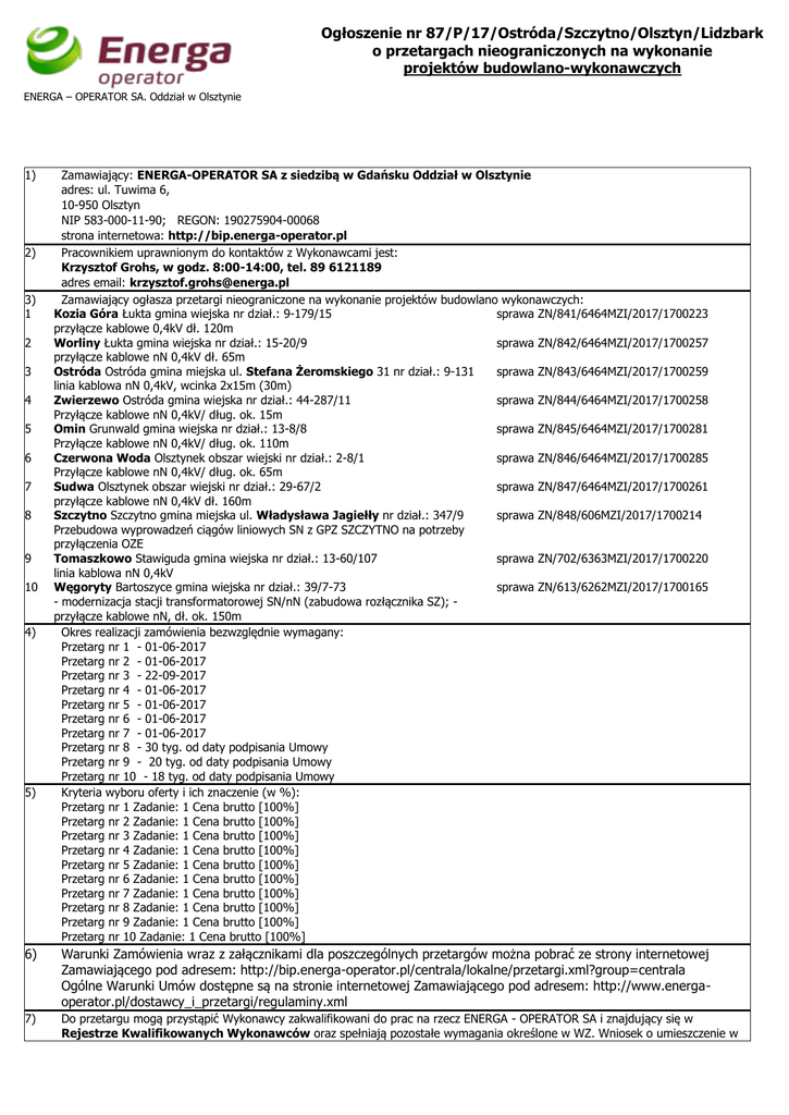 Ogłoszenie nr 87/P/17/Ostróda/Szczytno/Olsztyn/Lidzbark o