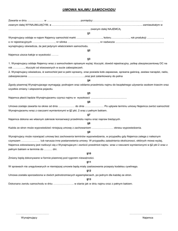 UMOWA NAJMU SAMOCHODU Zawarta w dniu ……………… w ………………………………. pomiędzy:…………………………………………………………………… zwanym dalej WYNAJMUJĄCYM, a …………………………………………………………………………………….…. zamieszkałym w ………………………………………………………………………………. zwanym dalej NAJEMCĄ. §1 Wynajmujacy oddaje w najem Najemcy samochód marki ……………………….., koloru………………..., rok produkcji ………………, o nr rejestracyjnych ……………………., nr silinka …………………………….., nr nadwozia ……………………………………………… wynajmujacy oświadcza, że jest jedynym właścicielem samochodu. §2 Najemca uiszca kałcje w wysokości …….. §3 1. Wynajmujacy oddaje Najemcy wraz z samochodem opisanym wyżej: kluczyki, dowód rejestracyjny, polisę ubezpieczeniową OC na rok …………., kluczyki od stosowanych w aucie zabezpieczeń. 2. Wynajmujacy oświadcza, iż samochód jest w pełni sprawny, oraz posiada koło zapasowe, sprawna gaśnicę, zestaw narzędzi, radio, zabezpieczenia ………………………………………………………,oraz jest zatankowany do pełna §4 Zgody pisemnej Wynajmujacego wymagają: podnajem oraz oddanie przedmiotu najmu do bezpłatnego używania osobom trzecim oraz szystkie zmiany i ulepszenia pojazdu. §5 Najemca płacić będzie Wynajmujacemu czynsz najmu w wysokosci: …………………………………. §6 Umowa zostaje zawarta na okres od dnia ……………… do dnia ………………… Po upływie terminu umowy Najemca zwróci samochód Wynajmujacemu wraz z rzeczami wymienionymi w §2 pkt. 2 oraz z pełnym bakiem. §7 Najemca dokona we własnym zakresie konserwacji przedmiotu najmu oraz napraw bieżących. §8 Każda ze stron może wypowiedzieć niniejszą umowę z zachowaniem …………………… okresu wypowiedzenia. §9 Wynajmujacy może rozwiązać umowę bez zachowania terminów wypowiedzenia, w przypadku gdy Najemca zalega z naleznym czynszem ………………… lub narusza inne postanowienia umowy. W przypadku zaisstnienia okolicznosci, októrych mowa wyżej, Najemca zobowiazany jest rozliczyć się z Wynajmujacym i zwrócić przedmiot najmu wraz z rzeczami wymienionymi w §2 pkt 2 oraz z pełnym bakiem w terminie do ……… dni. §10 Zmiany będą dokonywane w formie pisemnej pod rygorem nieważności. §11 W sprawach nie uregulowanych w nieniejszej umowie będą miały zastosowanie przepsiy kodeksu cywilnego. §12 Umowa została sporzadzona w dwóch jednobrzmiacych egzemplarzach, po jednym dla każdej ze stron. §13 Dokonano zwrotu samochodu w dniu ………………….. w stanie jak w dniu najmu oraz z pełnym bakiem. ………………………………. Wynajmujący ……………………………… Najemca
