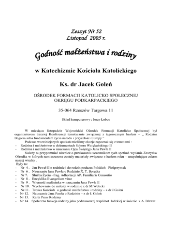 Zeszyt Nr 52 Listopad 2005 r. w Katechizmie Kościoła Katolickiego Ks. dr Jacek Goleń OŚRODEK FORMACJI KATOLICKO SPOŁECZNEJ OKRĘGU PODKARPACKIEGO 35-064 Rzeszów Targowa 11 Skład komputerowy : Jerzy Łobos W miesiącu listopadzie Wojewódzki Ośrodek Formacji Katolicko Społecznej był organizatorem trzeciej Konferencji tematycznie związanej z tegorocznym hasłem – „ Rodzina Bogiem silna fundamentem życia narodu i przyszłości Europy ” Podczas wcześniejszych spotkań mieliśmy okazje zapoznać się z tematami : - Rodzina i małżeństwo w dokumentach Soboru Watykańskiego II - Rodzina i małżeństwo w nauczaniu Ojca Świętego Jana Pawła II Należy tu przypomnieć również o przekazaniu uczestnikom tych spotkań wydania Zeszytów Ośrodka w których zamieszczone zostały materiały związane z hasłem roku – uzupełniające zakres naszej wiedzy . Były to: - Nr 4 . Jan Paweł II o rodzinie i do rodzin podczas Polskich Pielgrzymek - Nr 6 . Nauczanie Jana Pawła o Rodzinie X. T. Borutka - Nr 7. Służba Życiu –frag. Adhortacji AP. Familiaris Consortio - Nr 8 . Encyklika Evangelium vitae - Nr 9 . Wierność małżeńska w nauczaniu Jana Pawła II - Nr 10. Wychowanie do miłości w rodzinie x dr M.Wolicki - Nr.11. Troska Kościoła o godność małżeństwa i rodziny – x dr J.Goleń - Nr 12. Nauczanie Jana Pawła o Rodzinie – x dr J. Goleń - Nr 13. Karta Praw Rodziny - Nr 14. Społeczna funkcja rodziny jako podstawowej wspólnot ludzkiej w świecie x.A. Bławat - Kolejnym tematem z którym zapoznał uczestników spotkania ksiądz dr Jacek Goleń to: Małżeństwo i rodzina w Katechiźmie Kościoła Katolickiego Ksiądz doktor zwrócił uwagę na te fragmenty katechizmu w których zawarta jest nauka Kościoła Katolickiego odnośnie Małżeństwa. W kolejności przedstawił : - małżeństwo jako sakrament - IV przykazanie Dekalogu – Czcij Ojca i matkę swoją - VI przykazanie Dekalogu – Nie cudzołóż - IX przykazanie Dekalogu – Nie pożądaj żony bliźniego Swego W niniejszym Zeszycie przedstawiamy: - przedruk tych zagadnień z Kompedium Katechizmu - fragmenty homilii Jana Pawła II z pielgrzymki 1991 r na temat IV.VI, IX przykazania. Sakrament małżeństwa 337. Jaki jest zamysł Boga wobec mężczyzny i kobiety? Bóg który jest Miłością i stworzył człowieka z miłości, powołał go także do miłości. Stwarzając mężczyznę i kobietę, powołał ich w małżeństwie do głębokiej wspólnoty życia i miłości, tak „ że nie są już dwoje, lecz jedno ciało” ( MT19,6). Błogosławiąc im, Bóg powiedział: „ Bądźcie płodni i rozmnażajcie się” ( Rdz.1,28 ) 338. Dla jakiego celu Bóg ustanowił małżeństwo ? Przymierze małżeńskie mężczyzny i kobiety zostało ustanowione przez Stwórcę i wyposażone we własne prawa. Z natury jest ono nastawione na dobro małżonków, a także na zrodzenie i wychowanie potomstwa. Przymierze małżeńskie jest według pierwotnego zamysłu Bożego nierozerwalne, jak nam oświadcza Jezus Chrystus:„Co Bóg złączył, tego człowiek niech nie rozdziela”. ( Mt. 19) 339. W jaki sposób grzech zagraża małżeństwu ? Z powodu pierwszego grzechu, którego skutkiem było zerwanie pierwotnej komunii mężczyzny i kobiety, danej przez Boga, związek małżeński jest często zagrożony niezgodą i niewiernością. Jednakże Bóg w swoim nieskończonym miłosierdziu nie odmawia mężczyźnie i kobiecie swej łaski, aby mogli urzeczywistniać jedność ich życia według pierwotnego zamysły Bożego. 340. Czego naucza Stary Testament o małżeństwie ? Bóg sprawił, że pod wpływem pedagogii Prawa i proroków, zaczęła powoli w Jego ludzie dojrzewać świadomość dotycząca jedności i nierozerwalności małżeństwa Oblubieńcze przymierze Boga z Izraelem przygotowuje i zapowiada Przymierze nowe, zawarte przez Syna Bożego, Jezusa Chrystusa z Jego Oblubienicą, Kościołem. 341. Jaką nowość przyniósł Chrystus odnośnie do małżeństwa ? Jezus Chrystus nie tylko przywraca pierwotny porządek zamierzony przez Biga, lecz daje łaskę do przeżywania małżeństwaw nowym sakramentalnym wymiarze, które jest znakiem Jego oblubieńczej miłości do Kościoła: „ Mężowie, miłujcie żony , bo i Chrystus umiłował Kościół”. ( Ef. 5,25 ) 342. Czy małżeństwo jest obowiązkiem dla wszystkich ? Małżeństwo nie jest obowiązkiem dla wszystkich. Bóg powołuje niektórych mężczyzn i niektóre kobiety, aby zrezygnowali z wielkiego dobra małżeństwa i szli za Panem Jezusem, wybierając życie w dziewictwie lub celibacie, troszcząc się o sprawy Pana i starając się Jemu podobać, i stali się w ten sposób wymownym znakiem absolutnego pierwszeństwa miłości Chrystusa oraz żarliwego oczekiwania Jego chwalebnego przyjścia. 343. W jaki sposób celebruje się sakrament małżeństwa ? Ponieważ małżeństwo czyni małżonków publicznym stanem życia w Kościele, powinno być zawierane publicznie, w ramach celebracji liturgicznej, wobec kapłana ( lub upoważnionego świadka Kościoła) oraz świadków. 344. Czym jest zgoda małżeńska ? Zgoda małżeńska jest wyrażeniem przez kobietę i mężczyznę woli wzajemnego i trwałego oddania się, w celu życia w przymierzu wiernej i płodnej miłości. Ponieważ zgoda „ stwarza małżeństwo” , jest ona nieodzowna i niezastąpiona. Aby małżeństwo było ważne, zgoda musi mieć za przedmiot prawdziwe małżeństwo, być aktem ludzkim, świadomym i wolnym, podjętym nie pod przemocą czy przymusem. 345. Czego żąda się gdy jeden z małżonków nie jest katolikiem ? Małżeństwo mieszane ( między katolikiem i niekatolikiem ochrzczonym) wymaga do swej dopuszczalności wyraźnego zezwolenia władzy kościelnej. W przypadku różnicy religii ( między katolikiem i nie ochrzczonym) do ważności małżeństwa wymagana jest wyraźna dyspensa od przeszkody. W każdym przypadku istotne jest, aby małżonkowie znali i akceptowali cel