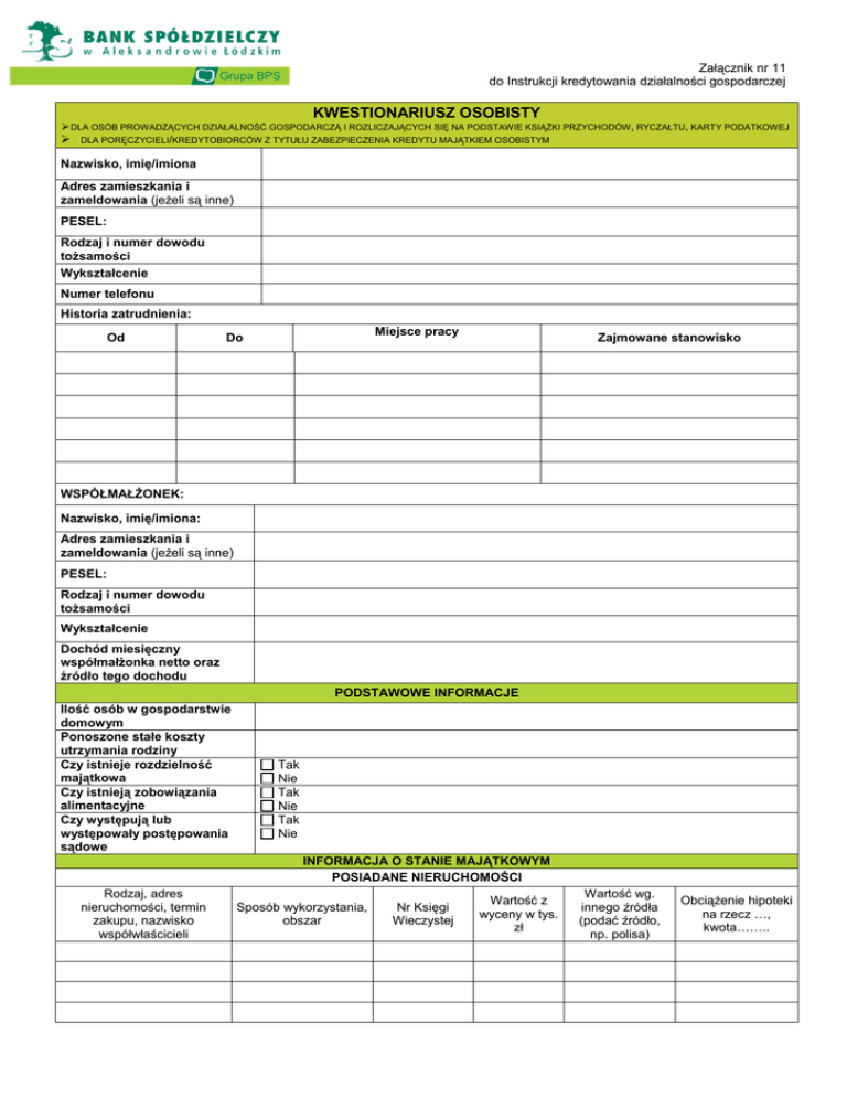 Załącznik nr 11 do Instrukcji kredytowania działalności gospodarczej KWESTIONARIUSZ OSOBISTY DLA OSÓB PROWADZĄCYCH DZIAŁALNOŚĆ GOSPODARCZĄ I ROZLICZAJĄCYCH SIĘ NA PODSTAWIE KSIĄŻKI PRZYCHODÓW , RYCZAŁTU, KARTY PODATKOWEJ DLA PORĘCZYCIELI/KREDYTOBIORCÓW Z TYTUŁU ZABEZPIECZENIA KREDYTU MAJĄTKIEM OSOBISTYM Nazwisko, imię/imiona Adres zamieszkania i zameldowania (jeżeli są inne) PESEL: Rodzaj i numer dowodu tożsamości Wykształcenie Numer telefonu Historia zatrudnienia: Od Miejsce pracy Do Zajmowane stanowisko WSPÓŁMAŁŻONEK: Nazwisko, imię/imiona: Adres zamieszkania i zameldowania (jeżeli są inne) PESEL: Rodzaj i numer dowodu tożsamości Wykształcenie Dochód miesięczny współmałżonka netto oraz źródło tego dochodu PODSTAWOWE INFORMACJE Ilość osób w gospodarstwie domowym Ponoszone stałe koszty utrzymania rodziny Czy istnieje rozdzielność majątkowa Czy istnieją zobowiązania alimentacyjne Czy występują lub występowały postępowania sądowe Tak Nie Tak Nie Tak Nie INFORMACJA O STANIE MAJĄTKOWYM POSIADANE NIERUCHOMOŚCI Rodzaj, adres nieruchomości, termin zakupu, nazwisko współwłaścicieli Sposób wykorzystania, obszar Nr Księgi Wieczystej Wartość z wyceny w tys. zł Wartość wg. innego źródła (podać źródło, np. polisa) Obciążenie hipoteki na rzecz …, kwota…….. INNY MAJĄTEK Pojazdy: należy podać markę, rok produkcji, wartość Akcje, udziały, lokaty Inne POSIADANE RACHUNKI BANKOWE Numer rachunku Nazwa i adres banku INFORMACJA O ZOBOWIĄZANIACH KREDYTY I POŻYCZKI NAZWA KWOTA POZOSTAŁA DO SPŁATY OSTATECZNY TERMIN SPŁATY ZABEZPIECZENIE BANKU/POŻYCZKODAWCY STOPA % INNE ZOBOWIĄZANIA RODZAJ ZOBOWIĄZANIA DATA POWSTANIA WARTOŚĆ DO ZAPŁATY TERMIN ZAKOŃCZENIA SPŁATY Oświadczenia 1) Oświadczam/y, że posiadamy/ nie posiadamy* zaległości wobec innych banków lub towarzystw leasingowych. 2) Oświadczam/y, że wobec nas toczą się/ nie toczą się* lub grożą/ nie grożą* nam postępowania sądowe, administracyjne i inne mogące mieć wpływ na prowadzoną działalność lub zdolność do spłaty zaciągniętych zobowiązań. 3) Oświadczam/y, że została/ nie została* ogłoszona upadłość lub został/ nie został* rozpoczęty proces likwidacji lub postępowania naprawczego lub zawieszenia działalności firmy. 4) Oświadczam/y, że posiadam/y/ nie posiadam/y* rachunki bankowe w innych bankach: ……………………………………………………… 5) Oświadczam/y, że posiadam/y/ nie posiadam/y* kredyty lub gwarancję w innym banku/instytucji finansowej* w kwocie: ………………. 6) Ubiegałem się/ nie ubiegałem się*/ ubiegam się/ nie ubiegam się* w ciągu ostatniego roku o kredyt lub gwarancję w innym banku/ instytucji finansowej* w kwocie: ……………………………………………………. 7) Posiadam/ nie posiadam* inne zobowiązania: ……………………………………………………………………………………………………….. 8) Oświadczam/y, że jesteśmy/ nie jesteśmy* członkami Banku Spółdzielczego w Aleksandrowie Łódzkim. 9) Oświadczam/y, że następujące podmioty lub osoby powiązane z naszą Firmą, organizacyjnie, personalnie są/ nie są* członkami Banku Spółdzielczego w Aleksandrowie Łódzkim lub osobami zajmującymi w Banku kierownicze stanowiska lub funkcje w Radzie Nadzorczej lub w Zarządzie Banku: ………………………………………………………………………………………………………………………………………… 10) Upoważniam/Nie upoważniam* Bank na podstawie art. 24 ust. 1 ustawy z dnia 9 kwietnia 2010 r. o udostępnieniu informacji gospodarczych i wymianie danych gospodarczych (Dz. U. Nr 81, poz. 530 z późń. zm.) do wystąpienia do Krajowego Rejestru Długów Biura Informacji Gospodarczej S.A. z siedzibą we Wrocławiu o ujawnienie informacji gospodarczych dotyczących mojej osoby oraz do sprawdzenia wiarygodności danych zawartych we wniosku i załączonych dokumentach. 11) Upoważniam/Nie upoważniam* Bank na podstawie art. 24 ust. 1 ustawy z dnia 9 kwietnia 2010 r. o udostępnieniu informacji gospodarczych i wymianie danych gospodarczych (Dz. U. Nr 81, poz. 530 z późń. zm.) oraz na podstawie art. 105 ust. 4a, 4 a1 ustawy z dnia 29 sierpnia 1997 r. Prawo Bankowe (Dz. U. z 2002 r., Nr 72, poz. 665 z późń. zm.) w związku z art. 13 ustawy z dnia 9 kwietnia 2010 roku o udostępnieniu informacji gospodarczych i wymianie danych gospodarczych (Dz. U. Nr 81, poz. 530 z późń. zm.) do pozyskania z Biura Informacji Gospodarczej InfoMonitor S.A. z siedzibą w Warszawie przy ul. Zygmunta Modzelewskiego 77 (BIG InfoMonitor) dotyczących mnie informacji gospodarczych oraz do pozyskania za pośrednictwem BIG InfoMonitor danych gospodarczych z Biura Informacji Kredytowej S.A. i Związku Banków Polskich dotyczących mojego wymagalnego od co najmniej 60 dni zadłużenia wobec banków lub instytucji upoważnionych do udzielania kredytów, przekraczającego 200 zł lub braku danych o takim zadłużeniu. 12) Upoważniam/Nie upoważniam* Bank oraz Bank Polskiej Spółdzielczości S.A., na podstawie art.24 ust. 1 ustawy z dnia 9 kwietnia 2010 r. o udostępnieniu informacji gospodarczych i wymianie danych gospodarczych (Dz. U. Nr 81, poz. 530 z późń. zm.) do wystąpienia bezpośrednio lub za pośrednictwem Biura Informacji Kredytowej S.A. z siedzibą w Warszawie – Biuro Obsługi Klienta BIK, przy ul. Postępu 17a, 02-676 Warszawa do biur informacji gospodarczej o ujawnienie informacji gospodarczych dotyczących moich zobowiązań. 13) Wyrażam zgodę/Nie wyrażam zgody* na przetwarzanie przez bank moich danych osobowych w celu reklamy produktów i usług Banku na podstawie ustawy z dnia 29 sierpnia 1997 roku o ochronie danych osobowych (Dz. U. z 2002 r., Nr 101, poz. 926, ze zm.). Strona 2 z 3 14) Wyrażam zgodę/Nie wyrażam zgody* na przesyłanie informacji handlowej za pomoc