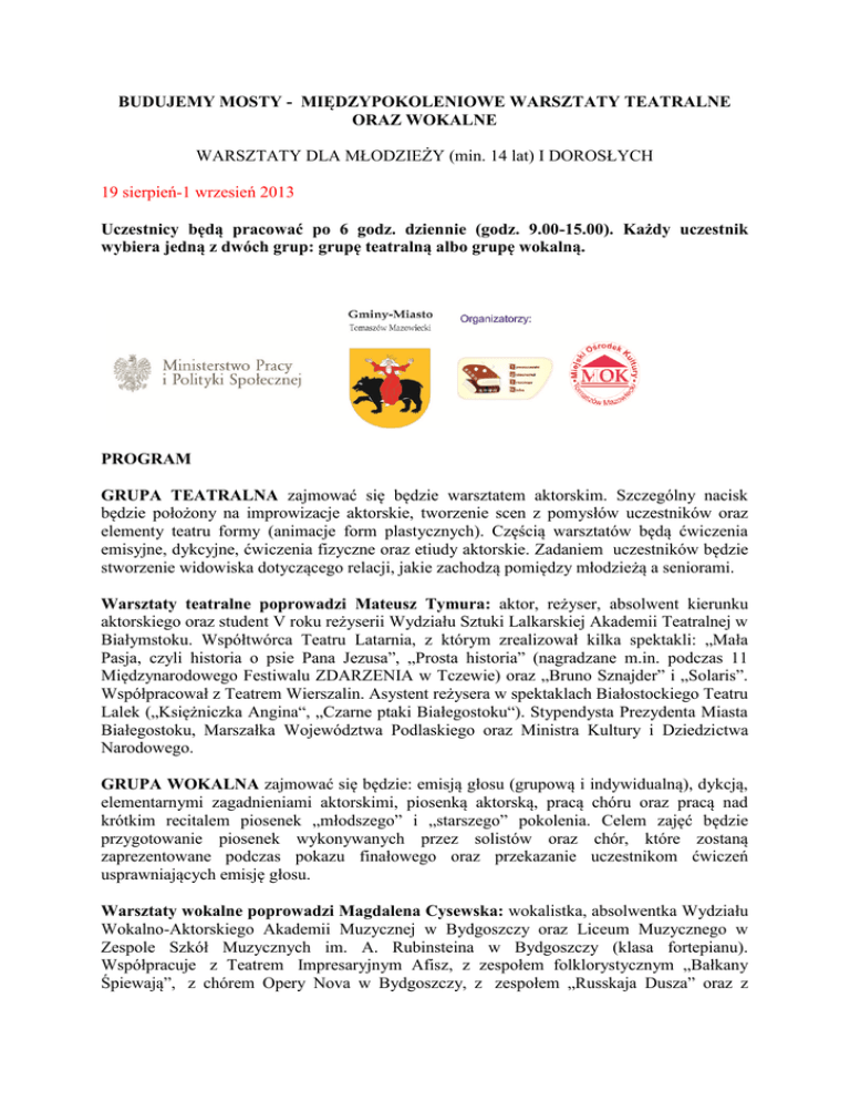 BUDUJEMY MOSTY - MIĘDZYPOKOLENIOWE WARSZTATY TEATRALNE ORAZ WOKALNE WARSZTATY DLA MŁODZIEŻY (min. 14 lat) I DOROSŁYCH 19 sierpień-1 wrzesień 2013 Uczestnicy będą pracować po 6 godz. dziennie (godz. 9.00-15.00). Każdy uczestnik wybiera jedną z dwóch grup: grupę teatralną albo grupę wokalną. PROGRAM GRUPA TEATRALNA zajmować się będzie warsztatem aktorskim. Szczególny nacisk będzie położony na improwizacje aktorskie, tworzenie scen z pomysłów uczestników oraz elementy teatru formy (animacje form plastycznych). Częścią warsztatów będą ćwiczenia emisyjne, dykcyjne, ćwiczenia fizyczne oraz etiudy aktorskie. Zadaniem uczestników będzie stworzenie widowiska dotyczącego relacji, jakie zachodzą pomiędzy młodzieżą a seniorami. Warsztaty teatralne poprowadzi Mateusz Tymura: aktor, reżyser, absolwent kierunku aktorskiego oraz student V roku reżyserii Wydziału Sztuki Lalkarskiej Akademii Teatralnej w Białymstoku. Współtwórca Teatru Latarnia, z którym zrealizował kilka spektakli: „Mała Pasja, czyli historia o psie Pana Jezusa”, „Prosta historia” (nagradzane m.in. podczas 11 Międzynarodowego Festiwalu ZDARZENIA w Tczewie) oraz „Bruno Sznajder” i „Solaris”. Współpracował z Teatrem Wierszalin. Asystent reżysera w spektaklach Białostockiego Teatru Lalek („Księżniczka Angina“, „Czarne ptaki Białegostoku“). Stypendysta Prezydenta Miasta Białegostoku, Marszałka Województwa Podlaskiego oraz Ministra Kultury i Dziedzictwa Narodowego. GRUPA WOKALNA zajmować się będzie: emisją głosu (grupową i indywidualną), dykcją, elementarnymi zagadnieniami aktorskimi, piosenką aktorską, pracą chóru oraz pracą nad krótkim recitalem piosenek „młodszego” i „starszego” pokolenia. Celem zajęć będzie przygotowanie piosenek wykonywanych przez solistów oraz chór, które zostaną zaprezentowane podczas pokazu finałowego oraz przekazanie uczestnikom ćwiczeń usprawniających emisję głosu. Warsztaty wokalne poprowadzi Magdalena Cysewska: wokalistka, absolwentka Wydziału Wokalno-Aktorskiego Akademii Muzycznej w Bydgoszczy oraz Liceum Muzycznego w Zespole Szkół Muzycznych im. A. Rubinsteina w Bydgoszczy (klasa fortepianu). Współpracuje z Teatrem Impresaryjnym Afisz, z zespołem folklorystycznym „Bałkany Śpiewają”, z chórem Opery Nova w Bydgoszczy, z zespołem „Russkaja Dusza” oraz z Biurem Turystyki Aktywnej „Kompas” (instruktor na „Obozach wokalnych”). Na co dzień pracuje jako nauczyciel śpiewu w Pałacu Młodzieży w Bydgoszczy. PODSUMOWANIE WARSZTATÓW: Efektem dwutygodniowej pracy obu grup będzie przygotowanie widowiska oraz recitalu, które zostaną zaprezentowane 1 września w Parku Miejskim w Tomaszowie Mazowieckim. WARUNKI UCZESTNICTWA: Koszt udziału jednej osoby wynosi 60 zł. Liczba miejsc jest ograniczona. O przyjęciu zadecyduje kolejność zgłoszeń. Osoby zainteresowane udziałem proszone są o przesłanie karty uczestnictwa do dnia 1 lipca 2013 r, pocztą elektroniczną (adres: [email protected]) lub tradycyjną: Miejski Ośrodek Kultury, ul. Browarna 7, 97-200 Tomaszów Maz. Karta dostępna jest na stronie MOK (www.mok-tm.pl). Dodatkowych informacji udziela koordynator projektu Anna Nowak: tel. (044) 724 42 93, 513 363 538, [email protected]; www.mok-tm.pl, https://www.facebook.com/pages/Teatralne-warsztaty-mi%C4%99dzypokolenioweTomasz%C3%B3w-Mazowiecki/271052899671243 Środki na realizację projektu zostały pozyskane z Gminy Miasto Tomaszów Mazowiecki oraz z Ministerstwa Pracy i Polityki Społecznej, w ramach II edycji Rządowego Programu na rzecz Aktywności Społecznej Osób Starszych na lata 2012-2013 (ASOS). Projekt jest realizowany we współpracy z Miejskim Ośrodkiem Kultury w Tomaszowie Mazowieckim.