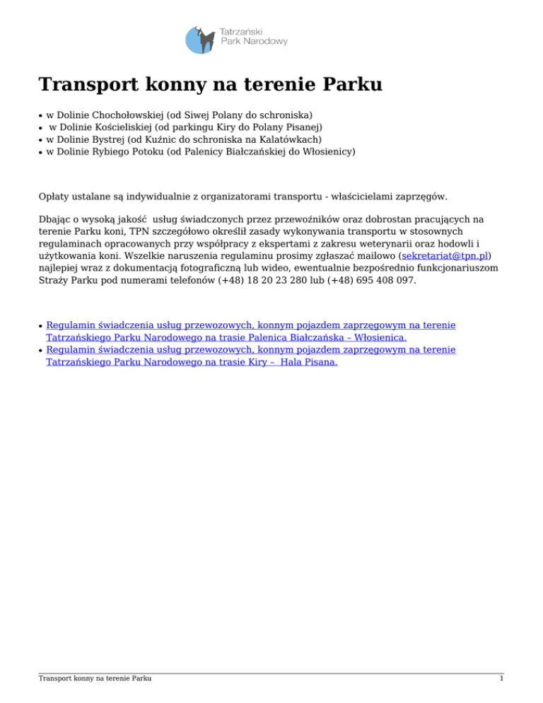 Transport konny na terenie Parku ● ● ● ● w Dolinie Chochołowskiej (od Siwej Polany do schroniska) w Dolinie Kościeliskiej (od parkingu Kiry do Polany Pisanej) w Dolinie Bystrej (od Kuźnic do schroniska na Kalatówkach) w Dolinie Rybiego Potoku (od Palenicy Białczańskiej do Włosienicy) Opłaty ustalane są indywidualnie z organizatorami transportu - właścicielami zaprzęgów. Dbając o wysoką jakość usług świadczonych przez przewoźników oraz dobrostan pracujących na terenie Parku koni, TPN szczegółowo określił zasady wykonywania transportu w stosownych regulaminach opracowanych przy współpracy z ekspertami z zakresu weterynarii oraz hodowli i użytkowania koni. Wszelkie naruszenia regulaminu prosimy zgłaszać mailowo ([email protected]) najlepiej wraz z dokumentacją fotograficzną lub wideo, ewentualnie bezpośrednio funkcjonariuszom Straży Parku pod numerami telefonów (+48) 18 20 23 280 lub (+48) 695 408 097. ● ● Regulamin świadczenia usług przewozowych, konnym pojazdem zaprzęgowym na terenie Tatrzańskiego Parku Narodowego na trasie Palenica Białczańska – Włosienica. Regulamin świadczenia usług przewozowych, konnym pojazdem zaprzęgowym na terenie Tatrzańskiego Parku Narodowego na trasie Kiry – Hala Pisana. Transport konny na terenie Parku 1
