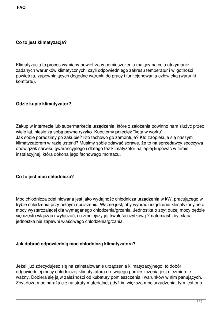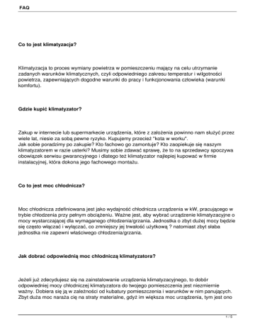FAQ Co to jest klimatyzacja? Klimatyzacja to proces wymiany powietrza w pomieszczeniu mający na celu utrzymanie zadanych warunków klimatycznych, czyli odpowiedniego zakresu temperatur i wilgotności powietrza, zapewniających dogodne warunki do pracy i funkcjonowania człowieka (warunki komfortu). Gdzie kupić klimatyzator? Zakup w internecie lub supermarkecie urządzenia, które z założenia powinno nam służyć przez wiele lat, niesie za sobą pewne ryzyko. Kupujemy przecież "kota w worku". Jak sobie poradzimy po zakupie? Kto fachowo go zamontuje? Kto zaopiekuje się naszym klimatyzatorem w razie usterki? Musimy sobie zdawać sprawę, że to na sprzedawcy spoczywa obowiązek serwisu gwarancyjnego i dlatego też klimatyzator najlepiej kupować w firmie instalacyjnej, która dokona jego fachowego montażu. Co to jest moc chłodnicza? Moc chłodnicza zdefiniowana jest jako wydajność chłodnicza urządzenia w kW, pracującego w trybie chłodzenia przy pełnym obciążeniu. Ważne jest, aby wybrać urządzenie klimatyzacyjne o mocy wystarczającej dla wymaganego chłodzenia/grzania. Jednostka o zbyt dużej mocy będzie się często włączać i wyłączać, co zmniejszy jej trwałość użytkową ? natomiast zbyt słaba jednostka nie zapewni właściwego chłodzenia/grzania. Jak dobrać odpowiednią moc chłodniczą klimatyzatora? Jeżeli już zdecydujesz się na zainstalowanie urządzenia klimatyzacyjnego, to dobór odpowiedniej mocy chłodniczej klimatyzatora do twojego pomieszczenia jest niezmiernie ważny. Dobiera się ją w zależności od kubatury pomieszczenia i warunków w nim panujących. Zbyt duża moc naraża cię na straty materialne, gdyż im większa moc urządzenia, tym jest ono 1/5 FAQ droższe. Zbyt mała moc powoduje przegrzewanie się sprężarki i w konsekwencji jej zniszczenie, co również jest rzeczą bardzo kosztowną, gdyż sprężarka należy do najdroższych elementów wyposażenia klimatyzatora i jej zakup równa się cenie prawie nowego urządzenia. Poprawnie dobrane urządzenie klimatyzacyjne powinno pracować w trybie mniej więcej "pół na pół" tzn połowa-pracy, połowa-stan spoczynku. Jeżeli w przyszłości chcesz uniknąć kłopotów z tym związanych, to najlepiej będzie jak ten pierwszy, bardzo istotny element twojej inwestycji, czyli poprawny dobór mocy chłodniczej urządzenia oddasz w ręce doświadczonych fachowców. Doboru klimatyzatora, a co za tym idzie określenia jego ceny zakupu i montażu, nie robi się przez telefon. Wymagana jest wizja lokalna, ale wcześniej można zrobić wstępne oszacowanie kosztów. Na podstawie przesłanych faxem lub e-mailem podanych niżej danych, firma instalacyjna wykona ofertę, która pozwoli na wstępne zapoznanie się z kosztami inwestycji. Cena zostanie urealniona po wizycie serwisanta, gdy wstępna kalkulacja zyska Twoją aprobatę. Co powinniśmy brać pod uwagę przy doborze mocy chłodniczej klimatyzatora? Poniższe dane takie jak: kubatura pomieszczenia (długość x szerokość x wysokość) ilość i moc elektryczna urządzeń wydzielających ciepło w pomieszczeniu (np.: oświetlenie, lodówki, komputery, nawilżacze itp.) lokalizacja pomieszczenia (np.: podstrychowe, ostatnie piętro itp.) ilość okien w pomieszczeniu i ich położenie (wschód/zachód/północ/południe) ilość osób na stałe przebywających w pomieszczeniu charakter pomieszczenia (serwerownia, biuro itp.) pozwolą na optymalny dobór mocy chłodniczej klimatyzatora dla twojego pomieszczenia. Co oznacza wskaźnik EER? EER to wskaźnik efektywności energetycznej, czyli jest to moc chłodnicza urządzenia podzelona przez ilość energii elektrycznej niezbędnej do jej osiągnięcia (całkowity pobór energii). Im wyższy wskaźnik EER, tym większa efektywność energetyczna. Co oznacza wskaźnik COP? Wskaźnik efektywności energetycznej cieplnej COP (ang. Coefficient Of Performance) odnosi się do urządzeń klimatyzacyjnych pracujących w trybie grzania (pomp ciepła), w warunkach znamionowych przy pełnym obciążeniu. Jest to stosunek mocy cieplnej wydzielanej przez urządzenie do mocy elektrycznej pobieranej z sieci potrzebnej do jej wytworzenia. Im wyższy wskaźnik COP, tym większa efektywność energetyczna. Dlaczego inverter? W klimatyzatorach typu Inverter wydajność jest zmienna. Uzyskuje się to przez płynną zmianę 2/5 FAQ obrotów sprężarki. Inwerter rozpoczynając pracę, stopniowo zwiększa obroty sprężarki i dostosowuje je w ten sposób, aby klimatyzator osiągną właściwą moc jak jest w danej chwili potrzebna do uzyskania w pomieszczeniu zadanej temperatury powietrza. .Stosowane są sprężarki z silnikami prądu stałego, a zmianę obrotów uzyskuje się przez zmianę napięcia (pulse amplitude modulation - PAM). Klimatyzatory typu INVERTER mogą służyć także do ogrzewania pomieszczeń, czyli pracują jako pompy ciepła. Największym problemem przy pracy klimatyzatora jako pompa ciepła jest odszranianie (defrost). Jednostka zewnętrzna oszrania się (obladza) już przy +3°C i musi być cyklicznie odszraniana. Jednym z warunków uruchomienia odszraniania jest pewien minimalny okres nieprzerwanej pracy klimatyzatora (często ok. 40 min). Chodzi o to aby klimatyzator nie odszraniał się zbyt często, co prowadziłoby do bardzo małej sprawności. Jeśli zainstalowana jest za duża jednostka lub znajduje się w ograniczonej przestrzeni o słabym obiegu powietrza, to wymagana temperatura zostanie szybko osiągnięta i klimatyzator nigdy nie będzie pracować nieprzerwanie przez 40 minut a tym samym nie dojdzie do odszraniania. Inverter stara się pracować cały czas i skutecznie rozwiązuje ten problem. Niektóre zalety technologii inverterowej: - Szybsze osiągnięcie żądanej temperatury i mniejsze jej wahania, utrzymanie jej z dokładnością do 0,5°C. - Miękki start. Sprężarka w sposób płynny nabiera obrotów. Unikamy w ten sposób prądu rozruchowego, który jest 5-7 razy w