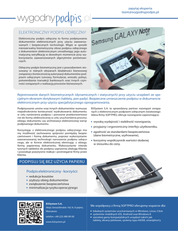 zapytaj eksperta [email protected] ELEKTRONICZNY PODPIS ODRĘCZNY Elektroniczny podpis odręczny to forma podpisywania dokumentów elektronicznych przy użyciu zaawansowanych i bezpiecznych technologii. Wiąże w sposób nierozerwalny biometryczny obraz podpisu odręcznego z dokumentem elektronicznym umożliwiając jego automatyczną weryfikację w dowolnym momencie przy wykorzystaniu zaawansowanych algorytmów porównawczych. Odręczny podpis biometryczny jest z powodzeniem stosowany w różnych obszarach działalności biznesowej związanej z koniecznością autoryzacji dokumentów podpisem odręcznym (umowy, formularze, wnioski, polisy), potwierdzania transakcji bankowych oraz innych czynności związanych z realizacją procesów biznesowych. Rejestrowanie danych biometrycznych (dynamicznych i statycznych) przy użyciu urządzeń ze specjalnym ekranem dotykowym (tablety, pen pady). Bezpieczne umieszczenie podpisu w dokumencie elektronicznym przy użyciu specjalistycznego oprogramowania. Podpisywanie umów oraz innych dokumentów wymusza niejednokrotnie konieczność wydrukowania dokumentu w celu naniesienia podpisu i ponowne przekonwertowanie do formy elektronicznej w celu uruchomienia procesu obiegu dokumentu czy archiwizacji elektronicznej wersji podpisanego dokumentu. Korzystając z elektronicznego podpisu odręcznego mamy możliwość zachowania spójności pomiędzy bezpieczeństwem i formą dokumentu, poprzez wykorzystanie zaawansowanej technologii nanoszenia podpisu odręcznego, ale w formie elektronicznej eliminując z obiegu formę papierową dokumentu. Wykorzystanie interaktywnych tabletów do podpisu usprawnia obsługę Klienta i powoduje pozytywne reakcje i postrzeganie firmy przez Klienta. B3System S.A. to sprawdzony partner rozwiązań związanych z elektronicznym podpisem odręcznym światowego lidera firmy SOFTPRO, oferuje rozwiązanie zapewniające: wysoką wydajność i stabilność rozwiązania, przyjazny i ergonomiczny interfejs użytkownika, zgodność ze standardami bezpieczeństwa (dane biometryczne, szyfrowanie), korzystny współczynnik wartości dodanej w stosunku do ceny. PODPISUJ SIĘ BEZ UŻYCIA PAPIERU Podpis elektroniczny - korzyści: redukcja kosztów szybszy obieg dokumentów zwiększenie bezpieczeństwa minimalizacja ryzyka operacyjnego B3System S.A. Aleje Jerozolimskie 162 A, II piętro, Warszawa telefon +48 (22) 480 89 00 www.b3system.pl We współpracy z firmą SOFTPRO oferujemy wsparcie dla: lokalnych systemów uruchamianych w Windows, Linux, Citrix systemów mobilnych iOS, Android oraz Windows 8 szerokiej gamy kompatybilnych urządzeń takich jak: tablety, ekrany piórkowe, systemy typu KIOSK, smartphon’y
