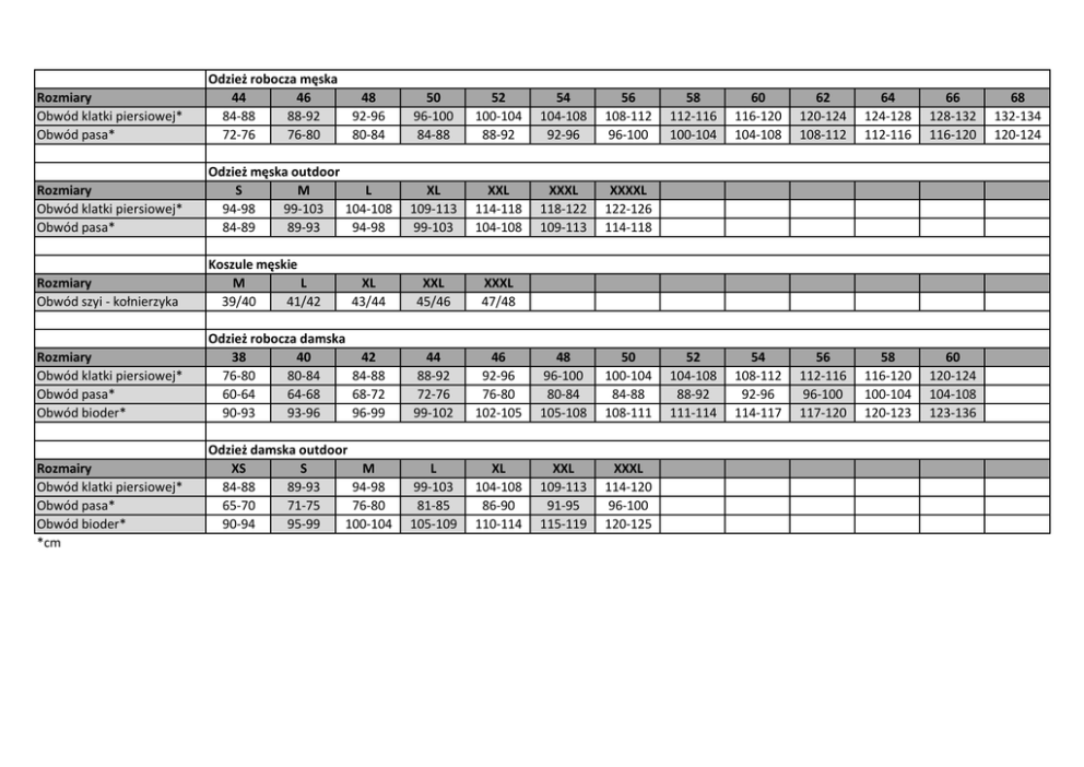 Rozmiary Obwód klatki piersiowej* Obwód pasa* Odzież robocza męska 44 46 84-88 88-92 72-76 76-80 Rozmiary Obwód klatki piersiowej* Obwód pasa* Odzież męska outdoor S M L 94-98 99-103 104-108 84-89 89-93 94-98 Rozmiary Obwód szyi - kołnierzyka Koszule męskie M L 39/40 41/42 Rozmiary Obwód klatki piersiowej* Obwód pasa* Obwód bioder* Rozmairy Obwód klatki piersiowej* Obwód pasa* Obwód bioder* *cm 48 92-96 80-84 50 96-100 84-88 52 100-104 88-92 54 104-108 92-96 56 108-112 96-100 XL 109-113 99-103 XXL 114-118 104-108 XXXL 118-122 109-113 XXXXL 122-126 114-118 XL 43/44 XXL 45/46 XXXL 47/48 Odzież robocza damska 38 40 42 76-80 80-84 84-88 60-64 64-68 68-72 90-93 93-96 96-99 44 88-92 72-76 99-102 46 92-96 76-80 102-105 48 96-100 80-84 105-108 50 100-104 84-88 108-111 Odzież damska outdoor XS S M 84-88 89-93 94-98 65-70 71-75 76-80 90-94 95-99 100-104 L 99-103 81-85 105-109 XL 104-108 86-90 110-114 XXL 109-113 91-95 115-119 XXXL 114-120 96-100 120-125 58 112-116 100-104 60 116-120 104-108 62 120-124 108-112 64 124-128 112-116 66 128-132 116-120 52 104-108 88-92 111-114 54 108-112 92-96 114-117 56 112-116 96-100 117-120 58 116-120 100-104 120-123 60 120-124 104-108 123-136 68 132-134 120-124