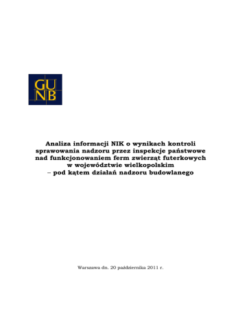 Analiza informacji NIK o wynikach kontroli sprawowania nadzoru przez inspekcje państwowe nad funkcjonowaniem ferm zwierząt futerkowych w województwie wielkopolskim – pod kątem działań nadzoru budowlanego Warszawa dn. 20 października 2011 r. I. Wstęp W latach 2009-2010 Inspekcja Ochrony Środowiska w Poznaniu skontrolowała 6 spośród 129 (dane według Wojewódzkiego Lekarza Weterynarii w Poznaniu) ferm zwierząt futerkowych funkcjonujących w województwie wielkopolskim. We wszystkich przypadkach kontrolerzy Inspekcji stwierdzili nieprawidłowości. Nieprawidłowości te były przede wszystkim związane z gospodarką odpadami oraz z prowadzeniem hodowli w obiektach, na pobudowanie których nie uzyskano pozwoleń na budowę lub eksploatowanych z naruszeniem pozwoleń. W wyniku tych kontroli do właściwych organów zostały skierowane zarządzenia pokontrolne oraz zawiadomienia, informujące o naruszeniu przepisów, m.in. przepisów ustawy – Prawo budowlane. Autorzy omawianej informacji NIK o wynikach kontroli z lat 2009-2010 napisali: „Mimo iż wyniki kontroli w sześciu fermach wskazywały na poważne zaniedbania i nieprawidłowości, w tym ryzyko wystąpienia podobnych nieprawidłowości w innych fermach, to jednak poprzestano tylko na tych badaniach.” II. Założenia kontroli przeprowadzonej w I połowie 2011 r. W I połowie 2011 r., na zlecenie Sejmowej Komisji Rolnictwa i Rozwoju Wsi, Delegatura NIK w Poznaniu przeprowadziła kontrolę sprawowania nadzoru przez inspekcje państwowe nad funkcjonowaniem ferm zwierząt futerkowych w woj. wielkopolskim. Celem kontroli była ocena sprawowania nadzoru państwowego nad działaniem ferm zwierząt futerkowych w woj. wielkopolskim oraz ocena skuteczności nadzoru państwowego nad funkcjonowaniem tych ferm poprzez sprawdzenie przestrzegania przez podmioty prowadzące te fermy przepisów weterynaryjnych, budowlanych oraz ochrony środowiska. Delegatura NIK zleciła organom nadzoru weterynaryjnego i budowlanego oraz inspekcji ochrony środowiska skontrolowanie 23 ferm z terenu woj. wielkopolskiego, co stanowi 18 proc. ogółu. Badaniami kontrolnymi objęto lata 2009-2010. Fermy zostały wytypowane według wielkości hodowli (największe liczebnie stada). Na zlecenie NIK kontrole w tym okresie przeprowadzili powiatowi inspektorzy nadzoru budowlanego w Gnieźnie, Grodzisku Wlkp., Kępnie, Kole, Krotoszynie, Nowym Tomyślu, Ostrowie Wlkp., Pleszewie, Poznaniu, Śremie i Wrześni. III. Ogólne wyniki kontroli W rezultacie postępowania kontrolnego w I połowie 2011 r. Najwyższa Izba Kontroli negatywnie oceniła sprawowanie nadzoru państwowego nad funkcjonowaniem ferm zwierząt futerkowych, w latach 2009-2010, głównie z uwagi na jego nieskuteczność. NIK stwierdziła, że kontrole ferm zwierząt futerkowych przeprowadzane przez właściwe inspekcje wykazały, iż w 87 proc. kontrolowanych ferm nie przestrzegano wymagań ochrony środowiska, w 48 proc. (11 ferm) działalność hodowlana była prowadzona w obiektach nielegalnie wybudowanych lub użytkowanych, w 35 proc. działalność prowadzono niezgodnie z przepisami weterynaryjnymi. Tylko jedna ferma, spośród 23 kontrolowanych, spełniała jednocześnie wymagania budowlane, weterynaryjne i ochrony środowiska. W rozdziale „Uwagi końcowe i wnioski” omawianej informacji NIK stwierdzono również: „Fermy zwierząt futerkowych funkcjonujące na terenie województwa wielkopolskiego nie były wcale lub bardzo rzadko kontrolowane przez inspekcje nadzoru budowanego i ochrony środowiska, a nadzór weterynaryjny nad tymi fermami sprawowany był nierzetelnie. O nieskuteczności nadzoru państwowego nad funkcjonowaniem ferm zwierząt futerkowych świadczą wyniki kontroli tych ferm, przeprowadzone na zlecenie NIK, przez poszczególne inspekcje. Potwierdziły one występowanie nieprawidłowości, polegających na nieprzestrzeganiu wymagań ochrony środowiska, prawa budowlanego i warunków weterynaryjnych.” W efekcie NIK wnioskowała m. in do Wielkopolskiego Wojewódzkiego Inspektora Nadzoru Budowlanego o sprawdzenie legalności wybudowania i użytkowania obiektów przez wszystkie podmioty prowadzące fermy zwierząt futerkowych w woj. wielkopolskim. IV. Szczegółowe wyniki kontroli nadzoru budowlanego W wyniku kontroli ferm zwierząt futerkowych, przeprowadzonej w I połowie 2011 r., powiatowi inspektorzy nadzoru budowlanego wydali: • 6 postanowień wstrzymujących prowadzenie robót; • 9 postanowień o nałożeniu kar pieniężnych i mandatów w kwocie 12.400 zł; • 2 decyzje w sprawie odmowy wydania pozwolenia na częściowe użytkowanie inwestycji oraz w sprawie obowiązku sporządzenia zamiennego projektu budowlanego. PINB wszczęli 12 postępowań administracyjnych w sprawie samowoli budowlanych lub naruszeń warunków określonych w pozwoleniach na budowę oraz zgłosili 2 samowole budowlane organom ścigania. Ustalenia kontroli przeprowadzonych przez PINB wykazują, że: • 6 (26 proc.) podmiotów prowadziło fermy w legalnie wybudowanych obiektach; • 6 podmiotów prowadzących fermy nie dopełniło obowiązków określonych w Prawie budowlanym poprzez wybudowanie obiektów bez zgłoszenia rozpoczęcia robót lub eksploatowanie obiektów bez obowiązkowych przeglądów technicznych; • działalność 11 ferm (48 proc. kontrolowanych) prowadzona była w obiektach wybudowanych nielegalnie lub w sposób istotnie odbiegający od warunków udzielonego pozwolenia na budowę, w tym: – PINB w Poznaniu wszczął 1 postępowanie administracyjne w sprawie samowoli budowlanej, po stwierdzeniu, że na jednej z ferm inwestor w latach 2000-2010 wybudował bez pozwolenia na budowę 13 wiat w konstrukcji stalowej oraz budynek gospodarczy. PINB powiadomił też policję o podejrzeniu popełnienia przestępstwa z art. 90 ustawy – Prawo budowlane, – PINB w Kole wszczął 3 postępowania administracyjne w sprawach dotyczących zbudowania bez pozwolenia na budowę 3 wiat oraz