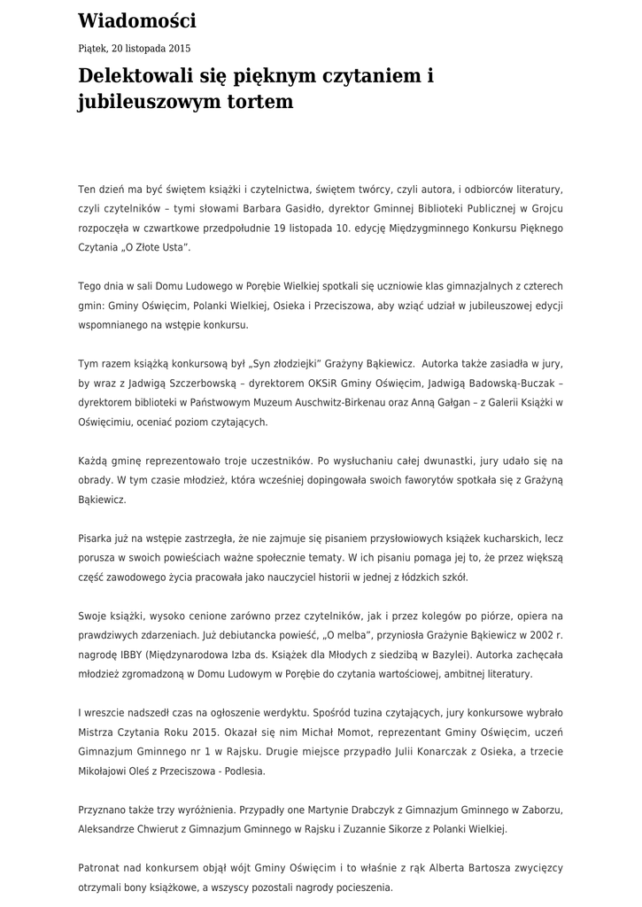 Wiadomości Piątek, 20 listopada 2015 Delektowali się pięknym czytaniem i jubileuszowym tortem Ten dzień ma być świętem książki i czytelnictwa, świętem twórcy, czyli autora, i odbiorców literatury, czyli czytelników – tymi słowami Barbara Gasidło, dyrektor Gminnej Biblioteki Publicznej w Grojcu rozpoczęła w czwartkowe przedpołudnie 19 listopada 10. edycję Międzygminnego Konkursu Pięknego Czytania „O Złote Usta”. Tego dnia w sali Domu Ludowego w Porębie Wielkiej spotkali się uczniowie klas gimnazjalnych z czterech gmin: Gminy Oświęcim, Polanki Wielkiej, Osieka i Przeciszowa, aby wziąć udział w jubileuszowej edycji wspomnianego na wstępie konkursu. Tym razem książką konkursową był „Syn złodziejki” Grażyny Bąkiewicz. Autorka także zasiadła w jury, by wraz z Jadwigą Szczerbowską – dyrektorem OKSiR Gminy Oświęcim, Jadwigą Badowską-Buczak – dyrektorem biblioteki w Państwowym Muzeum Auschwitz-Birkenau oraz Anną Gałgan – z Galerii Książki w Oświęcimiu, oceniać poziom czytających. Każdą gminę reprezentowało troje uczestników. Po wysłuchaniu całej dwunastki, jury udało się na obrady. W tym czasie młodzież, która wcześniej dopingowała swoich faworytów spotkała się z Grażyną Bąkiewicz. Pisarka już na wstępie zastrzegła, że nie zajmuje się pisaniem przysłowiowych książek kucharskich, lecz porusza w swoich powieściach ważne społecznie tematy. W ich pisaniu pomaga jej to, że przez większą część zawodowego życia pracowała jako nauczyciel historii w jednej z łódzkich szkół. Swoje książki, wysoko cenione zarówno przez czytelników, jak i przez kolegów po piórze, opiera na prawdziwych zdarzeniach. Już debiutancka powieść, „O melba”, przyniosła Grażynie Bąkiewicz w 2002 r. nagrodę IBBY (Międzynarodowa Izba ds. Książek dla Młodych z siedzibą w Bazylei). Autorka zachęcała młodzież zgromadzoną w Domu Ludowym w Porębie do czytania wartościowej, ambitnej literatury. I wreszcie nadszedł czas na ogłoszenie werdyktu. Spośród tuzina czytających, jury konkursowe wybrało Mistrza Czytania Roku 2015. Okazał się nim Michał Momot, reprezentant Gminy Oświęcim, uczeń Gimnazjum Gminnego nr 1 w Rajsku. Drugie miejsce przypadło Julii Konarczak z Osieka, a trzecie Mikołajowi Oleś z Przeciszowa - Podlesia. Przyznano także trzy wyróżnienia. Przypadły one Martynie Drabczyk z Gimnazjum Gminnego w Zaborzu, Aleksandrze Chwierut z Gimnazjum Gminnego w Rajsku i Zuzannie Sikorze z Polanki Wielkiej. Patronat nad konkursem objął wójt Gminy Oświęcim i to właśnie z rąk Alberta Bartosza zwycięzcy otrzymali bony książkowe, a wszyscy pozostali nagrody pocieszenia. Wójt pomógł też zapalić świeczki na torcie urodzinowym, którego mogli skosztować wszyscy obecni na spotkaniu. Zachęcał młodzież do delektowania się czytaniem, wspomniał też o potężnej sile słowa pisanego. Na koniec wziął książkę do ręki i na głos przeczytał jej fragment. – Konkurs zainicjowały 10 lat temu dwie biblioteki gminne - w Grojcu i Osieku, a po roku do tego grona przystąpiły dwie kolejne sąsiednie gminy, czyli Polanka Wielka i Przeciszów Od paru lat jest nas zatem czworo, jak cztery strony świata, jak cztery koła u wozu, cztery kąty w pokoju… albo pełny skład do brydża - powiedział Barbara Gasidło, inicjatorka i pomysłodawczyni tego konkursu. Bibliotekarze z gminnych książnic raduje to, iż konkurs cieszy się dużą popularnością wśród młodzieży. Maja nadzieję na kolejne 10 lat pięknego czytania…