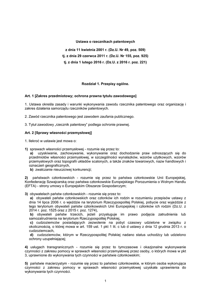 1. Zawód rzecznika patentowego polega na świadczeniu pomocy w sprawach własności