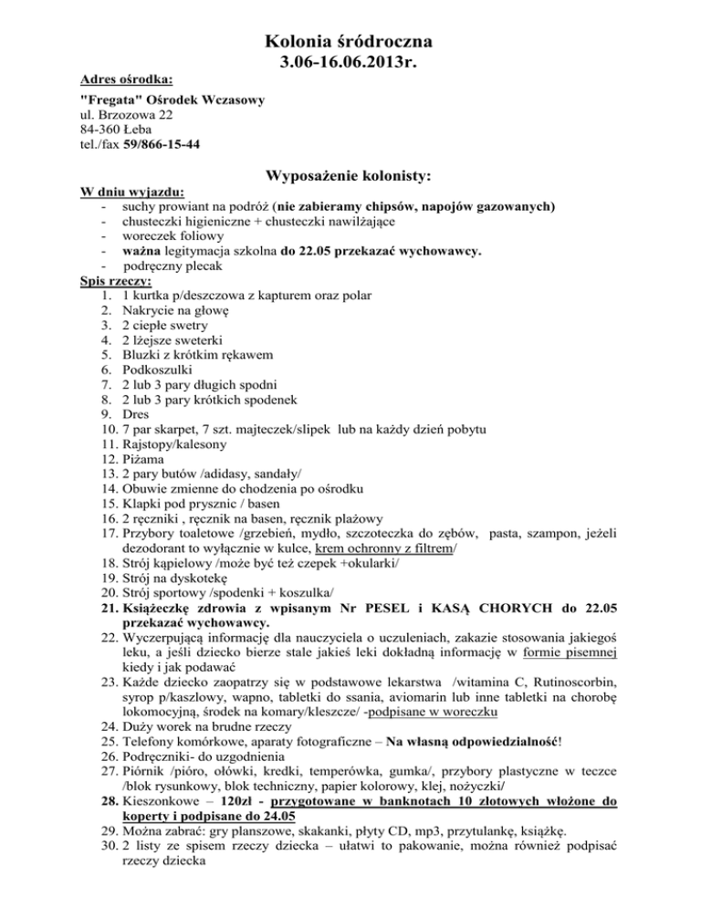 Kolonia śródroczna 3.06-16.06.2013r. Adres ośrodka: "Fregata" Ośrodek Wczasowy ul. Brzozowa 22 84-360 Łeba tel./fax 59/866-15-44 Wyposażenie kolonisty: W dniu wyjazdu: - suchy prowiant na podróż (nie zabieramy chipsów, napojów gazowanych) - chusteczki higieniczne + chusteczki nawilżające - woreczek foliowy - ważna legitymacja szkolna do 22.05 przekazać wychowawcy. - podręczny plecak Spis rzeczy: 1. 1 kurtka p/deszczowa z kapturem oraz polar 2. Nakrycie na głowę 3. 2 ciepłe swetry 4. 2 lżejsze sweterki 5. Bluzki z krótkim rękawem 6. Podkoszulki 7. 2 lub 3 pary długich spodni 8. 2 lub 3 pary krótkich spodenek 9. Dres 10. 7 par skarpet, 7 szt. majteczek/slipek lub na każdy dzień pobytu 11. Rajstopy/kalesony 12. Piżama 13. 2 pary butów /adidasy, sandały/ 14. Obuwie zmienne do chodzenia po ośrodku 15. Klapki pod prysznic / basen 16. 2 ręczniki , ręcznik na basen, ręcznik plażowy 17. Przybory toaletowe /grzebień, mydło, szczoteczka do zębów, pasta, szampon, jeżeli dezodorant to wyłącznie w kulce, krem ochronny z filtrem/ 18. Strój kąpielowy /może być też czepek +okularki/ 19. Strój na dyskotekę 20. Strój sportowy /spodenki + koszulka/ 21. Książeczkę zdrowia z wpisanym Nr PESEL i KASĄ CHORYCH do 22.05 przekazać wychowawcy. 22. Wyczerpującą informację dla nauczyciela o uczuleniach, zakazie stosowania jakiegoś leku, a jeśli dziecko bierze stale jakieś leki dokładną informację w formie pisemnej kiedy i jak podawać 23. Każde dziecko zaopatrzy się w podstawowe lekarstwa /witamina C, Rutinoscorbin, syrop p/kaszlowy, wapno, tabletki do ssania, aviomarin lub inne tabletki na chorobę lokomocyjną, środek na komary/kleszcze/ -podpisane w woreczku 24. Duży worek na brudne rzeczy 25. Telefony komórkowe, aparaty fotograficzne – Na własną odpowiedzialność! 26. Podręczniki- do uzgodnienia 27. Piórnik /pióro, ołówki, kredki, temperówka, gumka/, przybory plastyczne w teczce /blok rysunkowy, blok techniczny, papier kolorowy, klej, nożyczki/ 28. Kieszonkowe – 120zł - przygotowane w banknotach 10 złotowych włożone do koperty i podpisane do 24.05 29. Można zabrać: gry planszowe, skakanki, płyty CD, mp3, przytulankę, książkę. 30. 2 listy ze spisem rzeczy dziecka – ułatwi to pakowanie, można również podpisać rzeczy dziecka