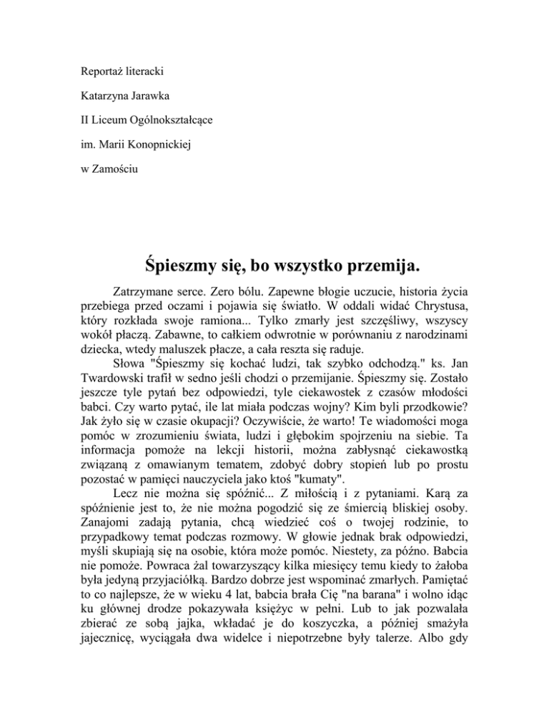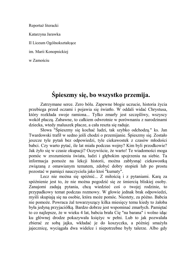 Reportaż literacki Katarzyna Jarawka II Liceum Ogólnokształcące im. Marii Konopnickiej w Zamościu Śpieszmy się, bo wszystko przemija. Zatrzymane serce. Zero bólu. Zapewne błogie uczucie, historia życia przebiega przed oczami i pojawia się światło. W oddali widać Chrystusa, który rozkłada swoje ramiona... Tylko zmarły jest szczęśliwy, wszyscy wokół płaczą. Zabawne, to całkiem odwrotnie w porównaniu z narodzinami dziecka, wtedy maluszek płacze, a cała reszta się raduje. Słowa "Śpieszmy się kochać ludzi, tak szybko odchodzą." ks. Jan Twardowski trafił w sedno jeśli chodzi o przemijanie. Śpieszmy się. Zostało jeszcze tyle pytań bez odpowiedzi, tyle ciekawostek z czasów młodości babci. Czy warto pytać, ile lat miała podczas wojny? Kim byli przodkowie? Jak żyło się w czasie okupacji? Oczywiście, że warto! Te wiadomości moga pomóc w zrozumieniu świata, ludzi i głębokim spojrzeniu na siebie. Ta informacja pomoże na lekcji historii, można zabłysnąć ciekawostką związaną z omawianym tematem, zdobyć dobry stopień lub po prostu pozostać w pamięci nauczyciela jako ktoś "kumaty". Lecz nie można się spóźnić... Z miłością i z pytaniami. Karą za spóźnienie jest to, że nie można pogodzić się ze śmiercią bliskiej osoby. Zanajomi zadają pytania, chcą wiedzieć coś o twojej rodzinie, to przypadkowy temat podczas rozmowy. W głowie jednak brak odpowiedzi, myśli skupiają się na osobie, która może pomóc. Niestety, za późno. Babcia nie pomoże. Powraca żal towarzyszący kilka miesięcy temu kiedy to żałoba była jedyną przyjaciółką. Bardzo dobrze jest wspominać zmarłych. Pamiętać to co najlepsze, że w wieku 4 lat, babcia brała Cię "na barana" i wolno idąc ku głównej drodze pokazywała księżyc w pełni. Lub to jak pozwalała zbierać ze sobą jajka, wkładać je do koszyczka, a później smażyła jajecznicę, wyciągała dwa widelce i niepotrzebne były talerze. Albo gdy zaczynała się wieczorynka, wołała i brała na kolana. Można porównać sie do zwierzęcia z wiersza Wisławy Szymborskiej "Kot w pustym mieszkaniu". Tak jak kot, czeka na swojego pana, tak człowiek tęskni i jeszcze czeka. Przeżywa, nie przyjmuje do wiadomości śmierci. Później jedynie marzy, aby bliski pojawił się i aby można było rzucić się mu na szyję, uściskać oraz cieszyć się z jego obecności. Czowiek jest bezradny wobec śmierci, która jest nieodwracalnym przemijaniem. Temat śmierci i towarzyszące mu skojarzenia skłaniają do refleksji nad przygasaniem i mijaniem. Ale już dość o śmierci. Są inne wątki, które warto przywołać. Miałam możliwość zadania dosłownie kilku pytań dwudziestopięcioletniej, czarnowłosej, absolwentce II Liceum Ogólnokształcącego im. Marii Konopnickiej w Zamościu. Martra mimo napiętego grafiku zgodziła się udzielić krótkich odpowiedzi. Muszę przyznać że jestem zdenerwowna, ponieważ jesteś pierwszą osobą z którą przeprowadzam wywiad. Zawsze musi być ten pierwszy raz. Poza tym to dla mnie zaszczyt. Byłaś uczennicą II LO w Zamościu. Wyobraź sobie, że na moim miejscu siedzi Maria Konopnicka, która dobrze Cię zna, co jej powiesz, a co ona Tobie? Powiedziałabym, że bardzo ładnie wygląda i że ładnie pisała. A co ona powie o Tobie? Nie powiedziałaby nic. Jak wspominasz czasy liceum? Było ciężko. Ale...dzięki wsparciu jakie dostałam, mogę być tu gdzie jestem. Co było ciężkie? Mijające dni. Czekanie na cud, przez co przestałam zauważać fajne chwile. Jakie były Twoje relacje z nauczycielami? Nie należałam do "lizusów" przez co starałam sie nie podpaść i nie wchodzić im w drogę. Kilku nauczycieli wspominam z uśmiechem na twarzy. Utrzymujesz kontak z osobami z klasy? Tak. Swoich przyjaciół poznałam właśnie w pierwszej klasie liceum. Nasze drogi podczas studiów się rozeszły, ale grupa się odbudowała. Chciałabyś wrócić do szkoły średniej? Chyba nie. Sama nie wiem, czasami chciałabym doświadczyć niektórych sytuacji jescze raz. Wszystkich pozytywnych sytuacji, które spotkały mnie w tym okresie. Co to za sytuacje? Na przykład znalezienie wspomnianych wcześniej przyjaciół. Przestałam wtedy żyć w samotności, poczułam się pełniejsza. Przyjaźń to... Dawanie drugiej osobie części siebie. Jest coś co doceniasz po skończeniu szkoły? Myślę, że z perspektywy czasu zaczełam doceniać to, co sama wyniosłam, przede wszystkim umiejętności. Również odnalazłam swoje miejsce, stałam się asertywna i życzliwa. Mijający czas sprawił... Że zmądrzałam, doceniłam to co robili dla mnie rodzice i nauczyciele. Żałujesz czegoś? Żałuję jedynie, że nie zdążyłam podziękować niektórym osobą, a innym wykrzyczeć prosto w twarz co o nich myślę. Czego chciałabyś najbardziej? Zdecydowanie zatrzymać na chwilę czas. Śpieszmy się... Bo wszystko przemija. To tyle. Bardzo dziękuję, że znalazłaś czas i odpowiedziałaś na moje pytania. To ja dziękuję, cieszę się, że mogłam uczestniczyć w Twoim debiucie. Przemijanie jest częścią życia. Wstawanie stale o tej samej godzinie. Codzienne godziny poświęcone nauce. Zapominanie o przyjemnościach. Ten sam wybór, przez wiele lat, i z tą samą niesłabnącą intensewnością. Okazuje się, że w życiu człowieka towarzyszy pośpiech, sprawiający zamieranie. Nie docenia się tego co jest, dopóki czas nie sprawi, że ceni się to co było. Istnieje jedno życie. Przemijanie uczy pokory, lecz nie może dominować. Ludzie w bezsensownym mijaniu, nie zdają sobie sprawy, że mają coraz mniej czasu na zadanie pytania, miłość, złość, przyjaźń czy zrozumienie. Mówiąc krótko, jeśli chcemy "jakoś" przeżyć życie, trzeba się śpieszyć i zatrzymywać w najpiękniejszych momentach. Nikt nie wyznaczy kiedy należy sie zatrzymać, to akt swobodnego wyboru. Przemijanie jest doświadczeniem długotrwałym, z drugiej strony 