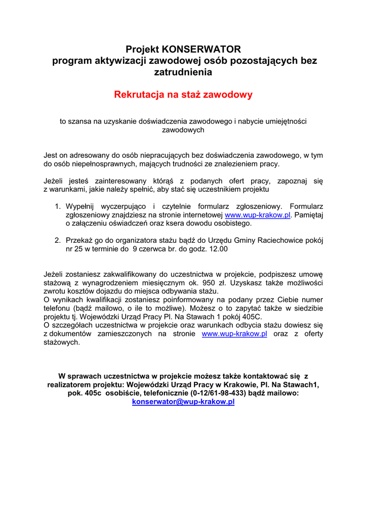 Projekt KONSERWATOR program aktywizacji zawodowej osób pozostających bez zatrudnienia Rekrutacja na staż zawodowy to szansa na uzyskanie doświadczenia zawodowego i nabycie umiejętności zawodowych Jest on adresowany do osób niepracujących bez doświadczenia zawodowego, w tym do osób niepełnosprawnych, mających trudności ze znalezieniem pracy. Jeżeli jesteś zainteresowany którąś z podanych ofert pracy, zapoznaj się z warunkami, jakie należy spełnić, aby stać się uczestnikiem projektu 1. Wypełnij wyczerpująco i czytelnie formularz zgłoszeniowy. Formularz zgłoszeniowy znajdziesz na stronie internetowej www.wup-krakow.pl. Pamiętaj o załączeniu oświadczeń oraz ksera dowodu osobistego. 2. Przekaż go do organizatora stażu bądź do Urzędu Gminy Raciechowice pokój nr 25 w terminie do 9 czerwca br. do godz. 12.00 Jeżeli zostaniesz zakwalifikowany do uczestnictwa w projekcie, podpiszesz umowę stażową z wynagrodzeniem miesięcznym ok. 950 zł. Uzyskasz także możliwości zwrotu kosztów dojazdu do miejsca odbywania stażu. O wynikach kwalifikacji zostaniesz poinformowany na podany przez Ciebie numer telefonu (bądź mailowo, o ile to możliwe). Możesz o to zapytać także w siedzibie projektu tj. Wojewódzki Urząd Pracy Pl. Na Stawach 1 pokój 405C. O szczegółach uczestnictwa w projekcie oraz warunkach odbycia stażu dowiesz się z dokumentów zamieszczonych na stronie www.wup-krakow.pl oraz z oferty stażowych. W sprawach uczestnictwa w projekcie możesz także kontaktować się z realizatorem projektu: Wojewódzki Urząd Pracy w Krakowie, Pl. Na Stawach1, pok. 405c osobiście, telefonicznie (0-12/61-98-433) bądź mailowo: [email protected]