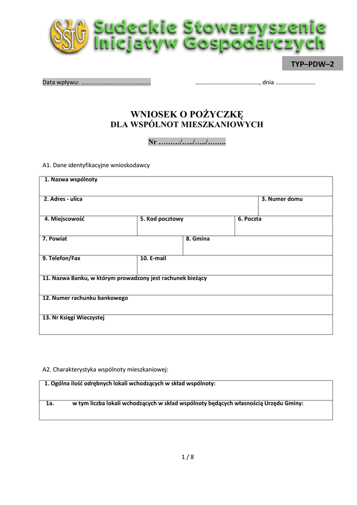 TYP–PDW–2 Data wpływu: ………………………………………. ……………………………………, dnia …………………….. WNIOSEK O POśYCZKĘ DLA WSPÓLNOT MIESZKANIOWYCH Nr ………/…../…../…….. A1. Dane identyfikacyjne wnioskodawcy 1. Nazwa wspólnoty 2. Adres - ulica 4. Miejscowość 3. Numer domu 5. Kod pocztowy 7. Powiat 6. Poczta 8. Gmina 9. Telefon/Fax 10. E-mail 11. Nazwa Banku, w którym prowadzony jest rachunek bieżący 12. Numer rachunku bankowego 13. Nr Księgi Wieczystej A2. Charakterystyka wspólnoty mieszkaniowej: 1. Ogólna ilość odrębnych lokali wchodzących w skład wspólnoty: 1a. w tym liczba lokali wchodzących w skład wspólnoty będących własnością Urzędu Gminy: 1/8 L.p. Nr lokalu Właściciel lokalu Powierzchnia lokalu % udział RAZEM A3. Skład Zarządu wspólnoty mieszkaniowej: Imię i nazwisko Funkcja 2/8 KONTAKT / telefon, e-mail/ A4. Dane Zarządcy (jeśli dotyczy): 1. Nazwa lub Imię i Nazwisko 2. Adres - ulica 3. Numer domu 4. Miejscowość 5. Kod pocztowy 9. Telefon/Fax 6. Poczta 10. E-mail 11. NIP 12. REGON 13. Nr licencji: 14. PESEL 15. Wskazanie rejestru wraz z numerem do którego jest wpisana działalność gospodarcza: A5. Członek Zarządu upoważniony do kontaktowania się i uzgadniania ws. złożonego wniosku (ewentualnie Zarządca jeśli jest upoważniony): 1. Imię i nazwisko 2. Adres - ulica 3. Numer domu/lokalu 4. Miejscowość 5. Kod pocztowy 9. Telefon/Fax 6. Poczta 10. E-mail B1. Zwracamy się o udzielenie pożyczki: 1. W wysokości: 3. Na okres: 2. Słownie od dnia …………..………… do dnia ………….………………. 4. Zabezpieczeniem pożyczki będzie: 3/8 5. Pożyczka zostanie przeznaczone na: 6 Określenie sposobu wypłaty pożyczki (bezgotówkowo jednorazowo, bezgotówkowo w transzach, podać ilość transz) 7. Jaki okres karencji w spłacie kapitału (od 0 do max 6 miesięcy) 8. Sposób uiszczenia prowizji (wpłacona gotówkowo, potrącona z wysokości udzielonej pożyczki): 9. Preferowany przez Wnioskodawcę sposób spłacania pożyczki (w ratach malejących lub równych): 10. Nr rachunku bankowego na który ma zostać wypłacona pożyczka: B2. Środki na funduszu remontowym: 1. Środki zgromadzone na funduszu remontowym na dzień złożenia wniosku: Kwota: 2. Kwota miesięcznych wpłat ogółem na fundusz remontowy za 6 ostatnich miesięcy poprzedzających datę złożenia wniosku: MIESIĄC KWOTA C1. Oświadczenie o zadłużeniu wnioskodawcy: L.p. 1. TYTUŁ ZADŁUŻENIA TAK/NIE z tyt. dostaw energii elektrycznej 4/8 KWOTA ZADŁUŻENIA L.p. TYTUŁ ZADŁUŻENIA TAK/NIE 2. z tyt. dostaw wody 3. z tyt. dostaw gazu 4. z tyt. wywozu nieczystości stałych 5. z tyt. podatku od nieruchomości od części wsólnej 6. z tyt. innych usług obcych (podać jakich): 7. z tyt. zobowiązań finansowych (w tym kredyty, pożyczki) – podać jakie: 8. z tyt. ubezpieczenia budynku 9. z tyt. zaległości w wynagradzaniu członków Zarządu lub Zarządcy a także innych osób zatrudnionych 10. Inne (jakie): 11. Inne (jakie): KWOTA ZADŁUŻENIA D1. Wnioskodawca oświadcza, że: 1. zapoznał się z regulaminem udzielania wsparcia przez SSIG; 2. zamieszczone w niniejszym wniosku dane osobowe, w rozumieniu ustawy z dnia 29 sierpnia 1997r. o ochronie danych osobowych (Dz.U. Nr 133, poz. 883.) zostały podane dobrowolnie w celu należytego wykonania zobowiązań wynikających z Regulaminu udzielania pożyczek przez Sudeckie Stowarzyszenie Inicjatyw Gospodarczych. Osoba, której dane dotyczą ma prawo wglądu do swoich danych oraz ich aktualizowania. 3. wspólnota mieszkaniowa nie posiada zajęcia hipotecznego z tytułu nieuregulowanych zobowiązań. 4. budynek nie podlega decyzji nadzoru budowlanego o rozbiórce nieruchomości oraz decyzjom odpowiednich organów o wywłaszczeniu nieruchomości. 5. członkowie wspólnoty nie są w sporze prawnym wynikającym z kwestionowania legalności działań wspólnoty lub jej organów w wykonywaniu obowiązków wynikających z ustawy o własności lokali i wspólnot mieszkaniowych lub innych ustaw, oraz nie jest prowadzone postępowanie karne przez uprawnione organy w stosunku do wspólnoty, oraz nie jest prowadzona egzekucja komornicza ani inne działanie windykacyjne. Powyższe oświadczenie zostało złożone pod rygorem odpowiedzialności karnej (art. 233 §1 K.K. Dz.U.97 Nr 88, poz. 553). 5/8 E1. Część informacyjna – informacje te nie stanowią kryterium przyznania pożyczki, a służyć będą wyłącznie celom statystycznym. 1. Wartość deklarowanych środków własnych (wkładu własnego) w remoncie, na który zaciągana jest pożyczka: 2. Czy budynek jest zabytkowy? 3. Szacowany czas trwania robót budowlanych od dnia …………..………… do dnia ………….………………. 4. Ile osób będzie zatrudniał wykonawca przy przeprowadzeniu robót? 5. Czy przeprowadzanie robót przyczyni się do powstania stałego miejsca pracy we wspólnocie, chociażby w ułamkowym wymiarze etatowym? (np. palacz, konserwator, ogrodnik itp.) 6. Czy przeprowadzanie robót przyczyni się do powstania miejsca pracy dorywczej (wykonywanej sporadycznie)? F1. Podpisy osób upoważnionych do składania oświadczeń woli1, w imieniu wspólnoty: Imię i nazwisko Data, podpis 1 Członkowie Zarządu, którzy podpisywać będą umowę pożyczki i mają prawo do podejmowania decyzji w zakresie zawarcia pożyczki. 6/8 G1. Wykaz załączników: NAZWA ZAŁĄCZNIKA 2 ILOŚĆ 1. Decyzja ws. nadania NIP 2. Decyzja ws. nadania REGON 3. Aktualna uchwała o wyborze Zarządu (jeśli dotyczy) 4. Aktualna uchwała o wyborze Zarządcy (jeśli dotyczy) 5. Roczne sprawozdania z działalności Zarządu lub Zarządcy o których mowa w art. 30 Ustawy o własności lokali za dwa poprzednie lata, tj. rok ……………… oraz rok ………………. 6. Przyjęty stosowną uchwałą roczny plan gospodarczy na rok bieżący, tj. rok ……………. o którym mowa w art. 30 Ustawy o w